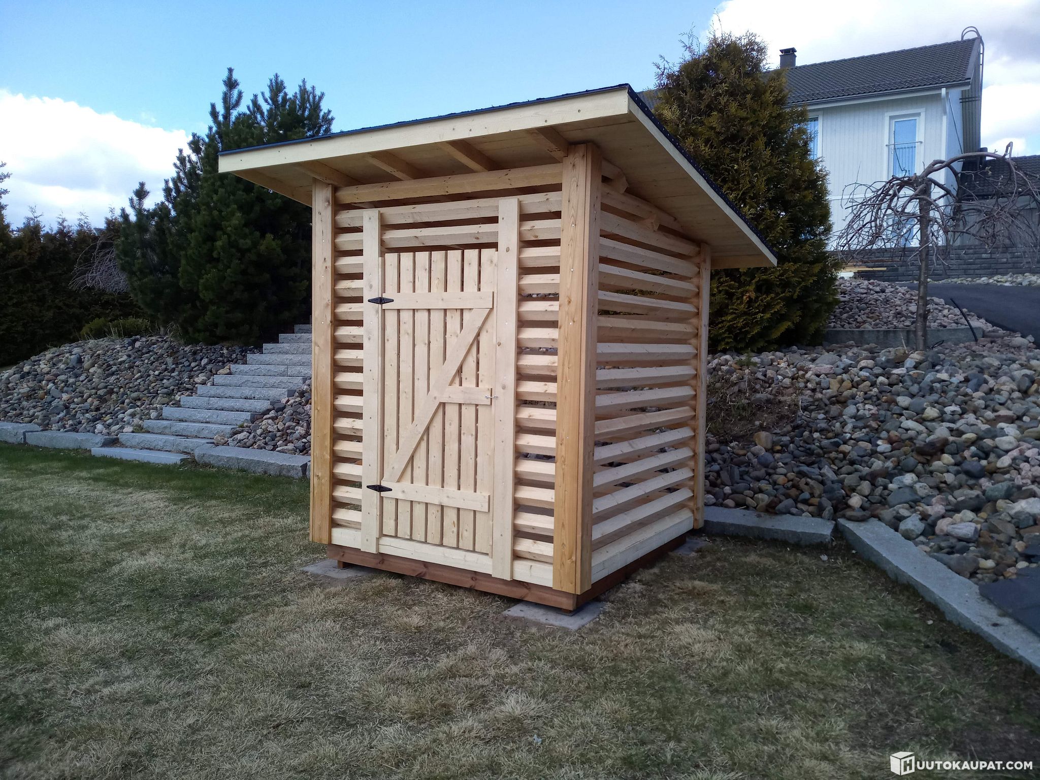 Pihavaraston/rakoliiterin runko+alajuoksu nipussa. Tuoreesta 75x75 parrusta sahattu ja salvostettu. Valmiiseen liiteriin tarvii lisäksi vain lautaosat ja kate. Mukaan saa kuvat ja pystytys ohjeet. Oviaukko 90 x 190cm~ Tuotteen ovh. 844€.