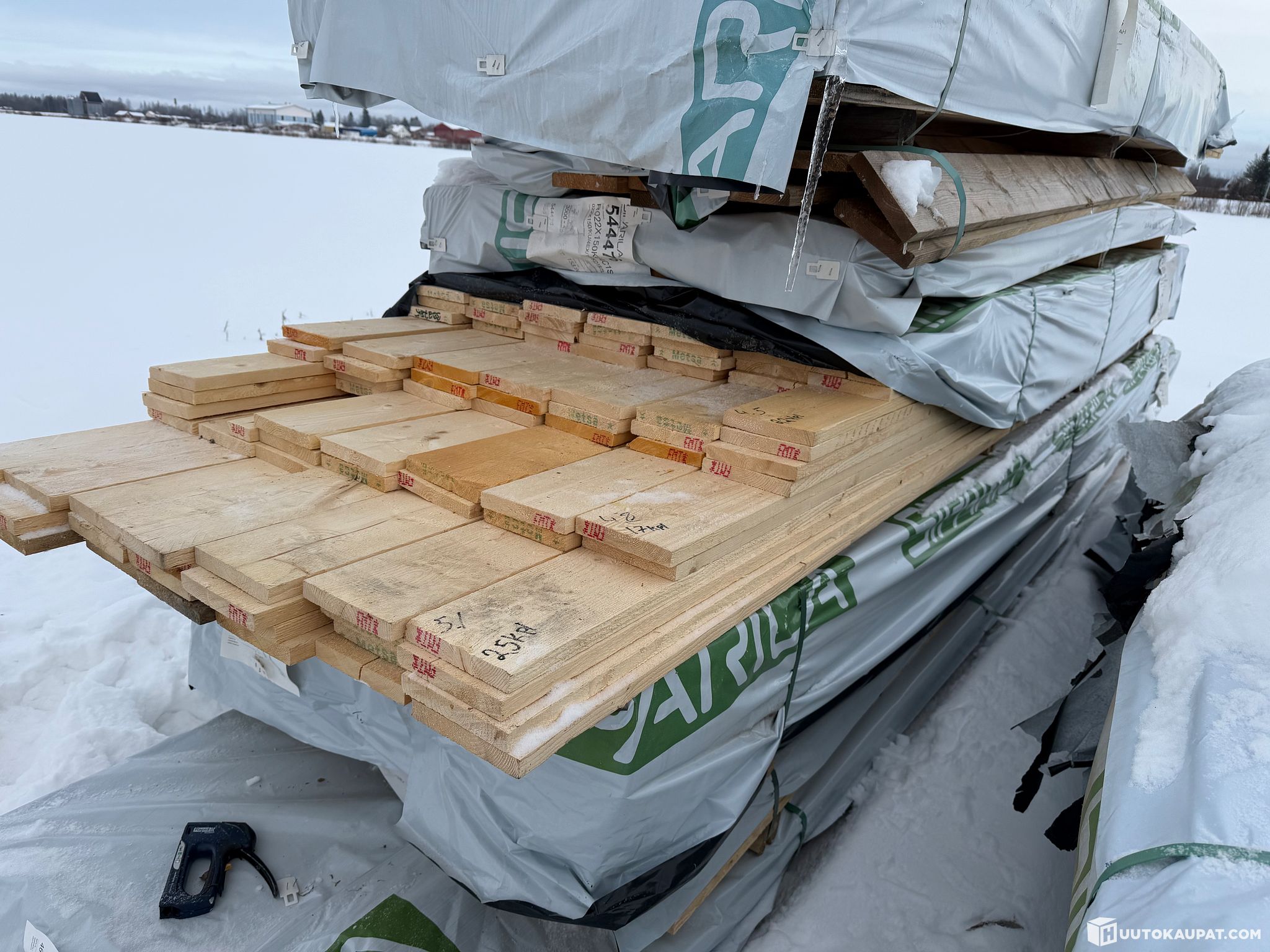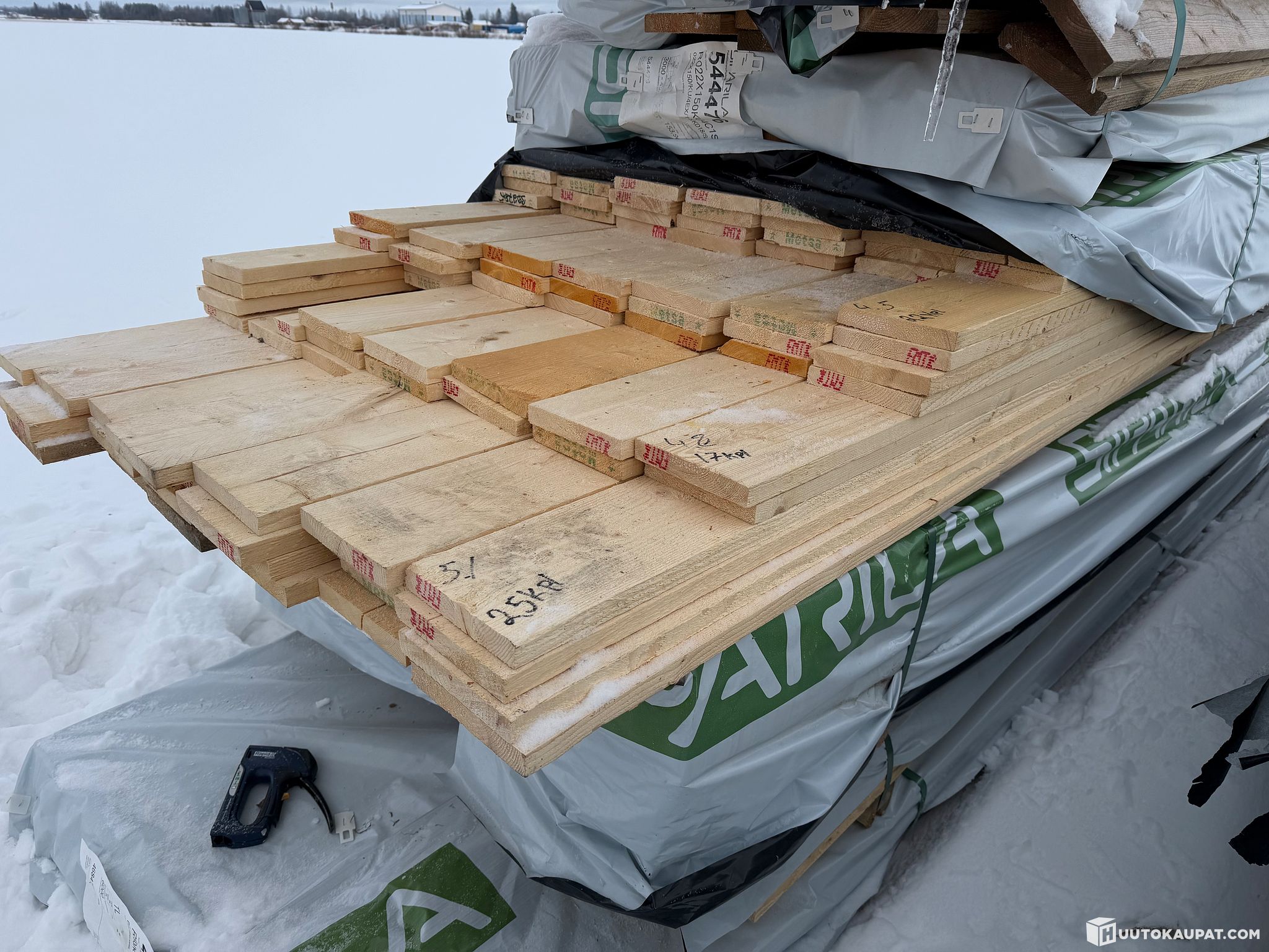 Monikäyttöistä sahatavaraa tehtaan paketissa.