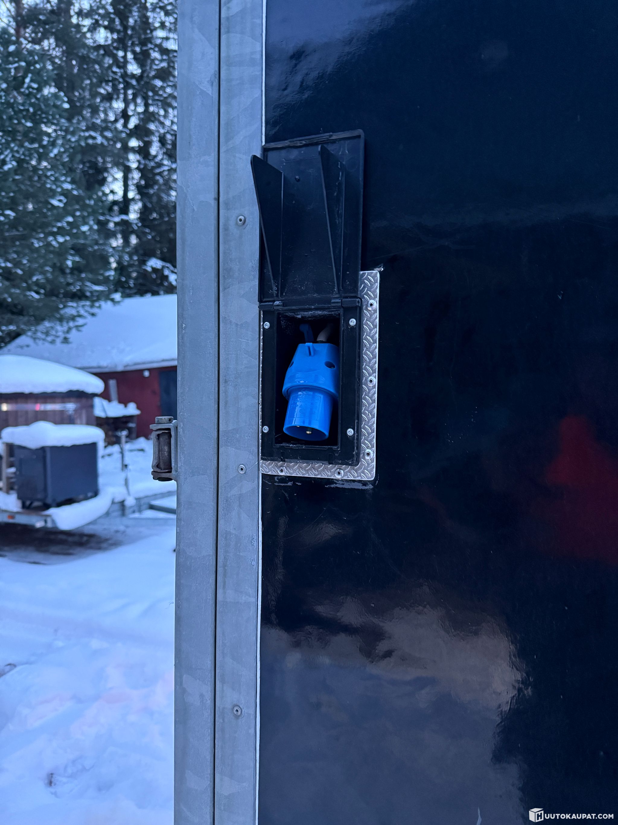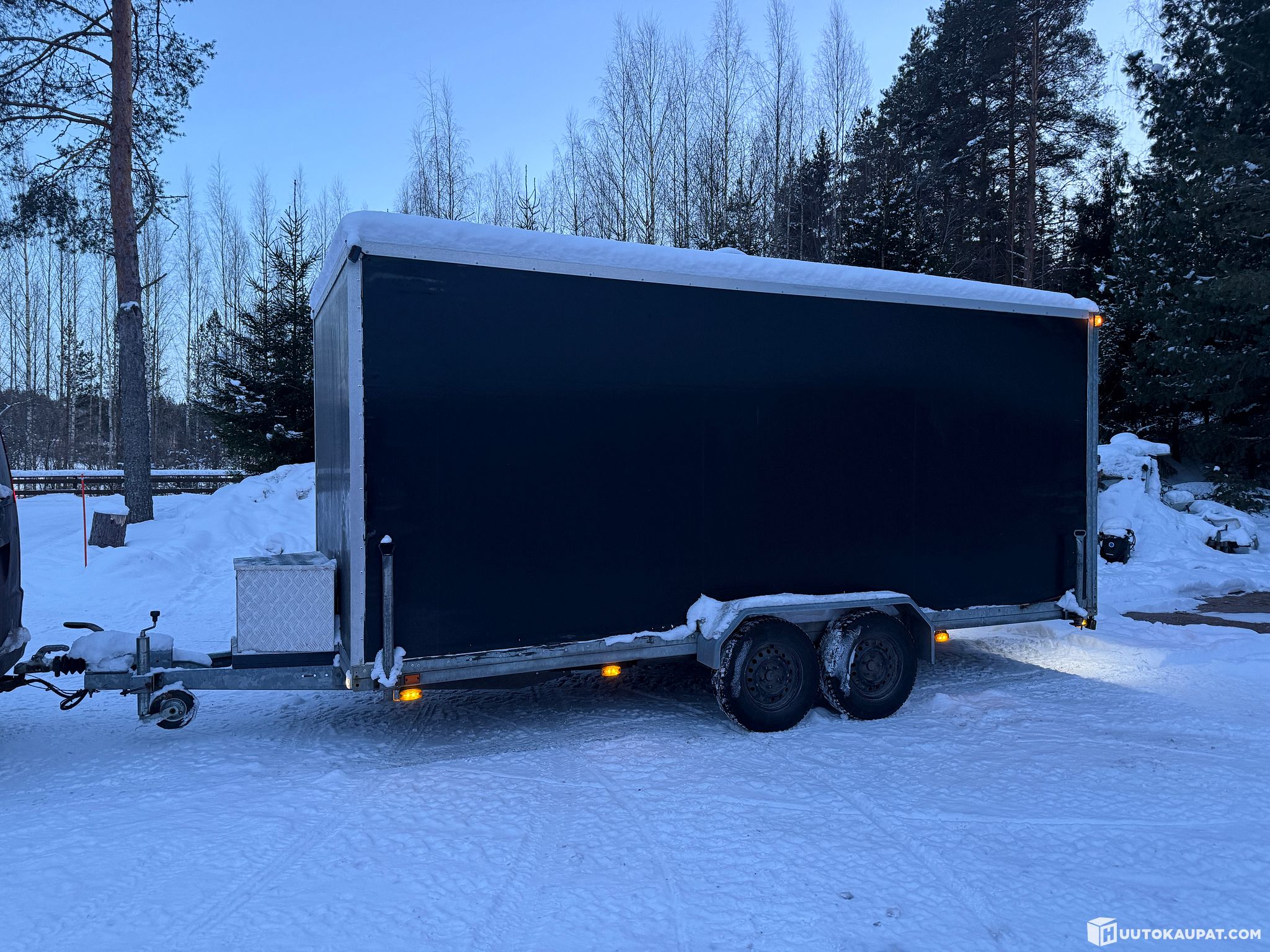 Vähälle käytölle jäänyt kärri. Kyytiin mahtuu monta kelkkaa ja kopista löytyy lämmitys sekä ramppi. Kontin sisällä valot maa sähköstä sekä autolta tulevasta sähköstä.