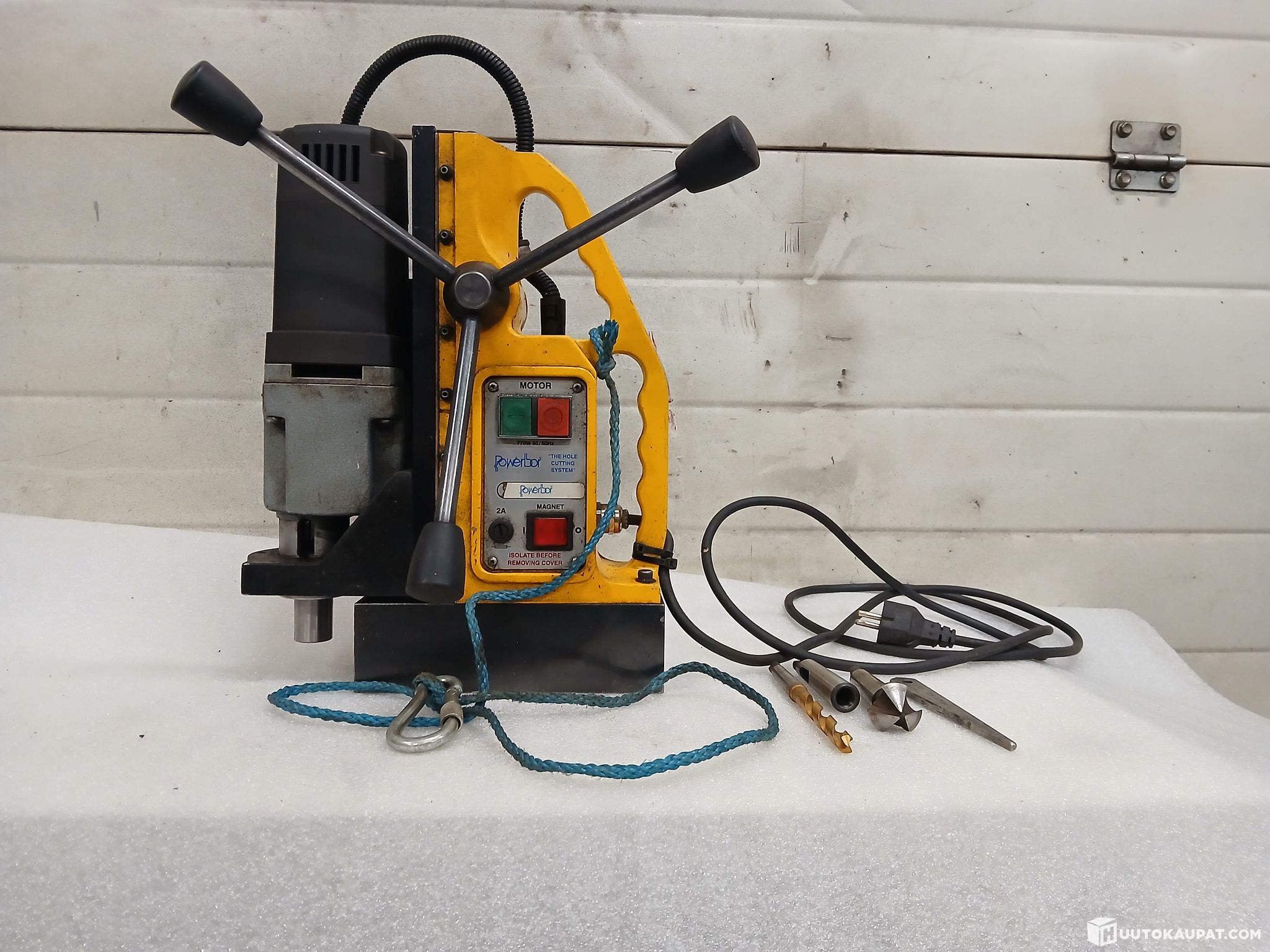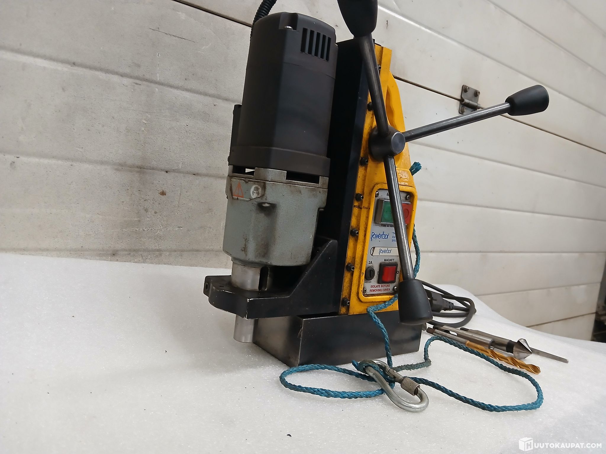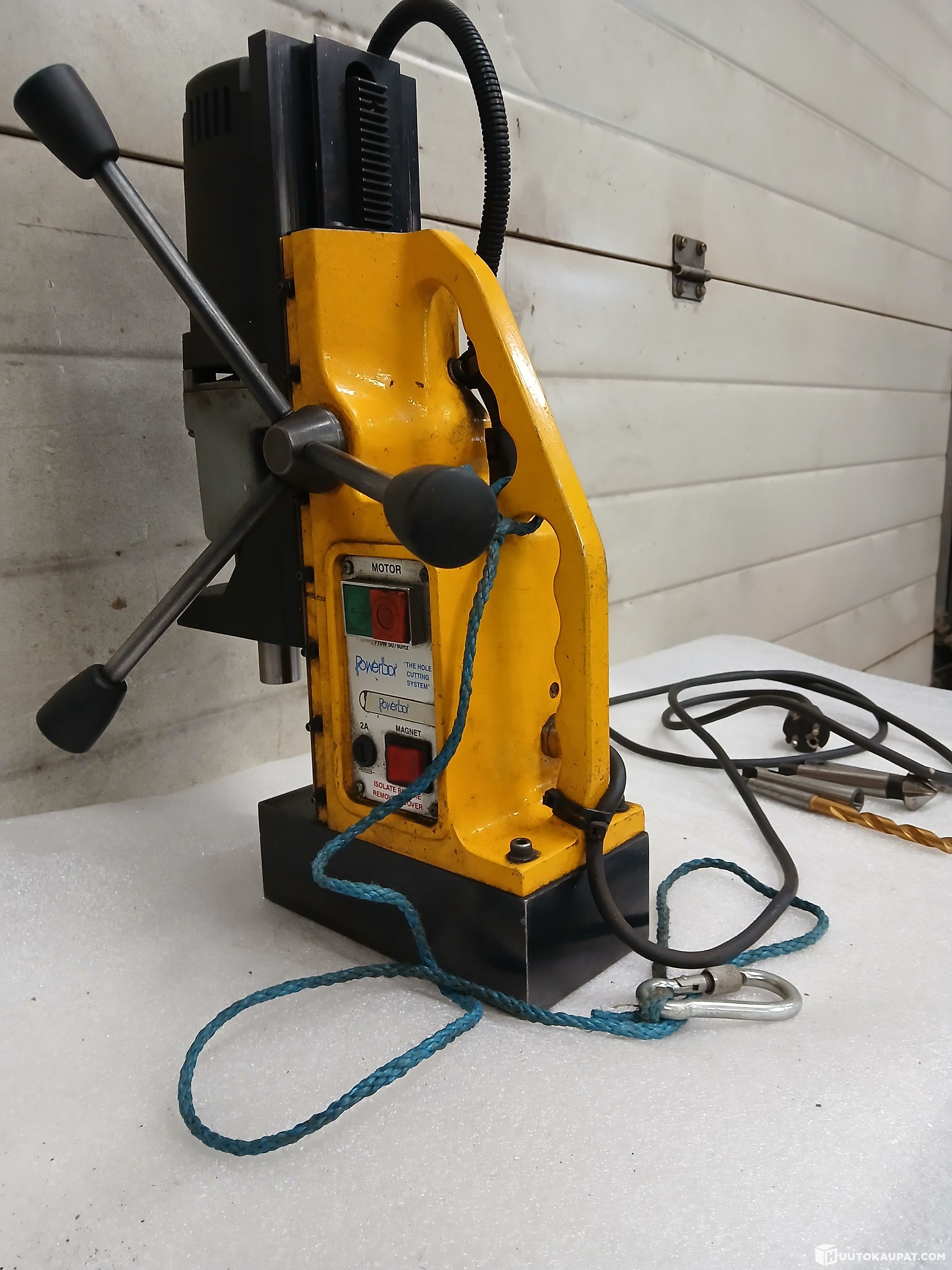 Powerbor merkkinen laadukas mangneettiporakone.englantilaisvalmisteinen.valovirta käyttöinen.kartio kiinnitys terille 2 kartio.kaksinopeuksinen pyörimisnopeus.vahva mangneetti.laite on siistikuntoinen toimiva laite.mukana putoamisnaru.1-2 kartioholkki.seeviterä.kartioterän irroitus kiila.poranterä 10,5mm.porauskapasiteetistä ei tietoa mutta itse olen 30mm reikiä koneella tehnyt.reikäteräsarjalla saa varmasti vielä suurempiakin reikiä syntymään tarvittaessa.tästä kunnon kone millä pääsee vähän pahempiinkin paikkoihin reikiä porailemaan.tälläisiä laadukkaita koneita harvoin tarjolla.koneelle saadaan tarvittaessa järjestettyä kuljetus koko suomen alueella kotipihaan asti toimitettuna.noudettaessa konetta itse saadaan noutoajankohta järjestymään joustavasti myös iltaisin ja viikonloppuisinkin.noudosta ei peritä mitään noutomaksuja/noutokuluja.noudolla ei myöskään ole kiirettä saadaan sovittua todella joustavasti tarvittaessa.