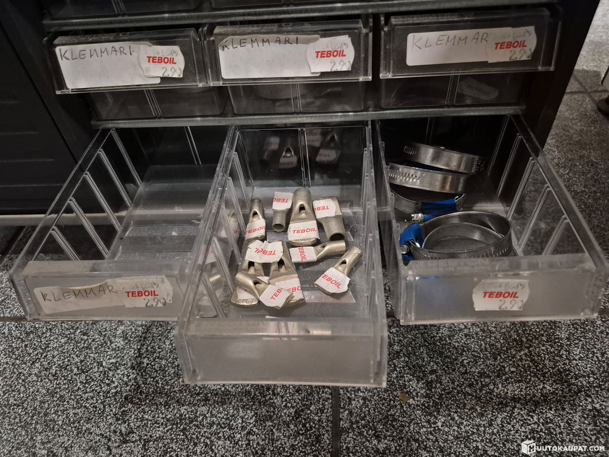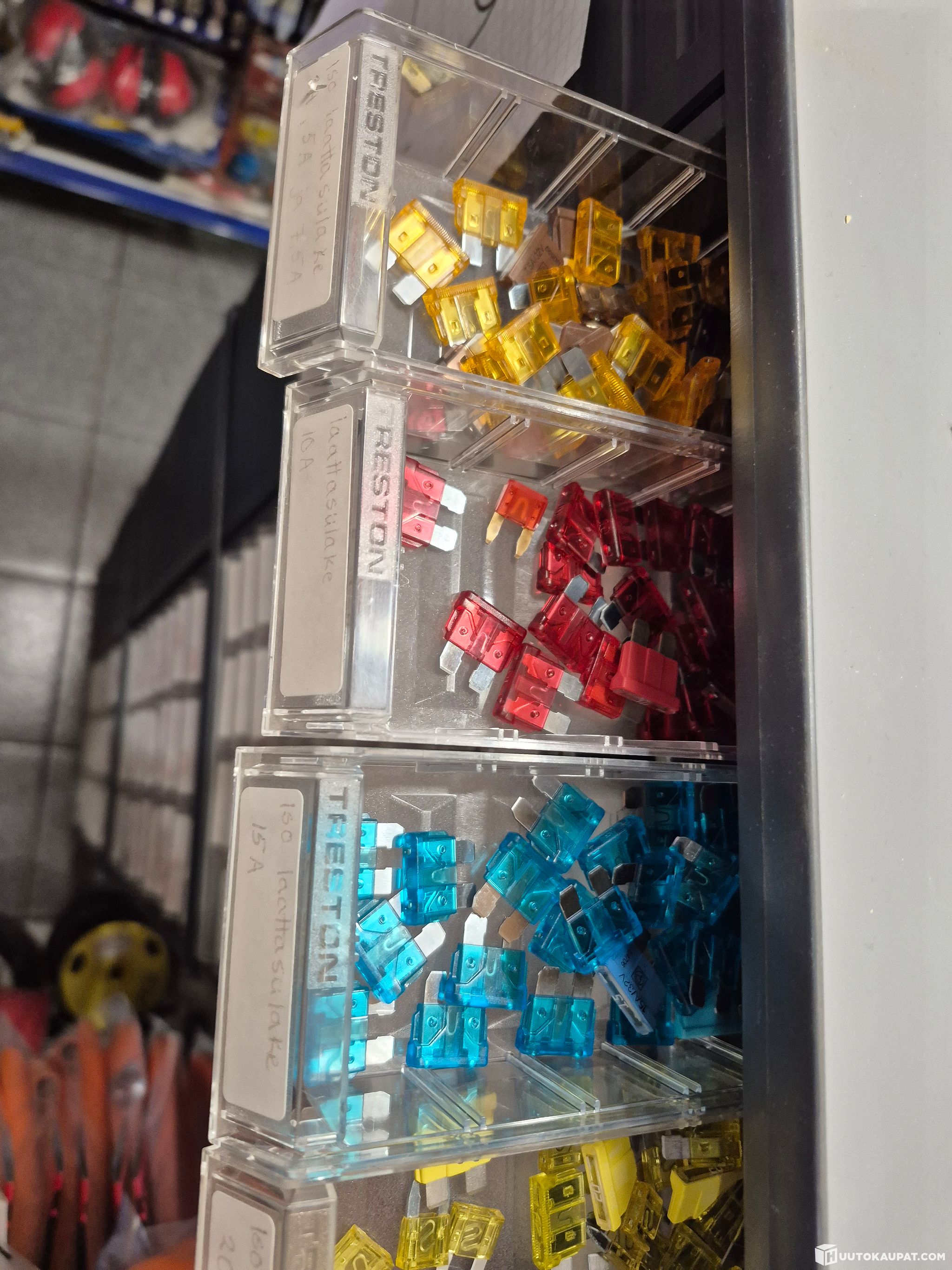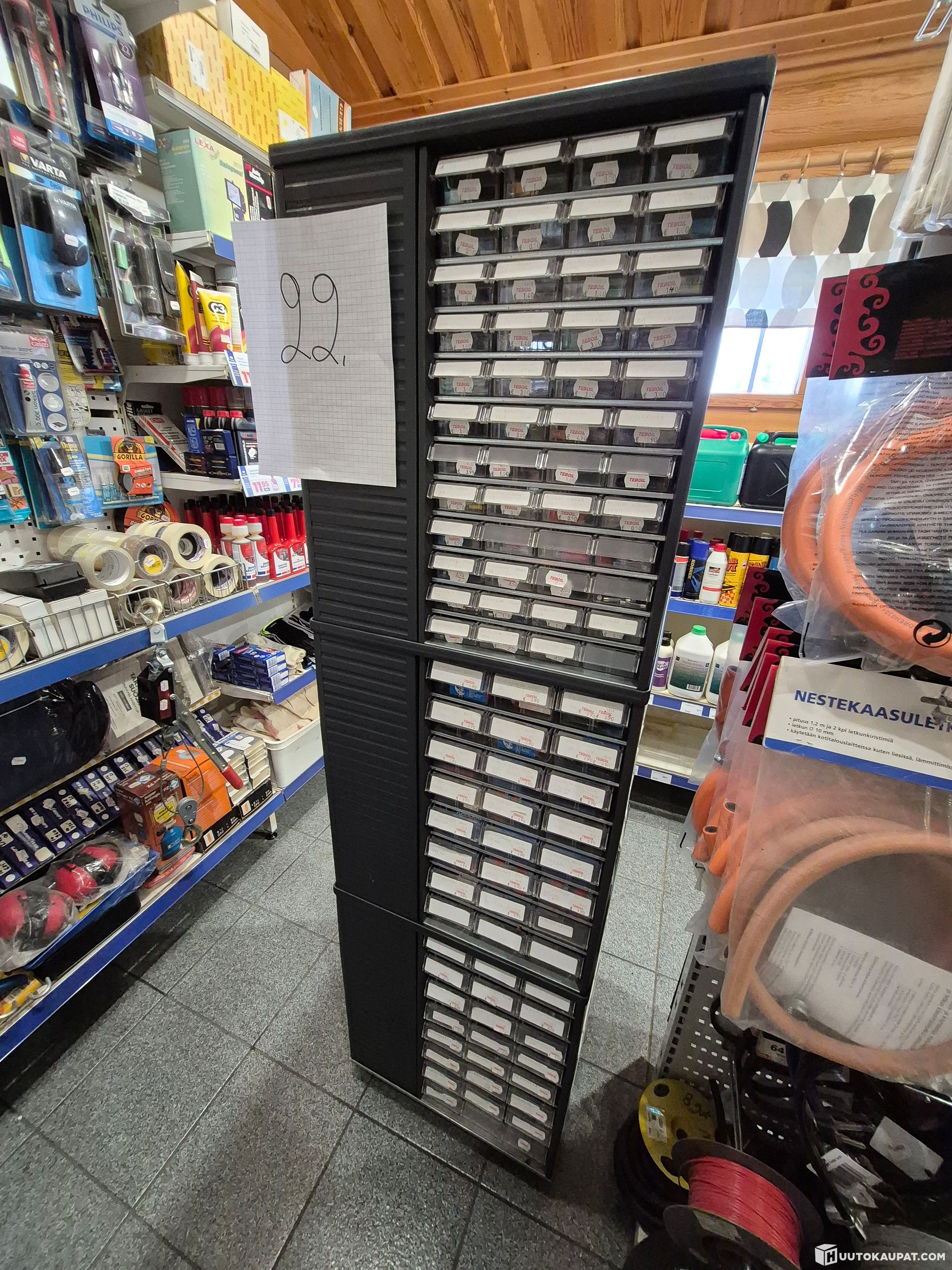 Myydään kuvien ja kuvissa näkyvän numeron 22 mukaisesti miljoonalaatikosto ja sen sisältämiä tarvikkeita, kuten sulakkeita, apikoliittimiä, katkojan kärkiä, liitinrimoja, autopolttimoja, letkun kiristimiä, pultteja, ruuveja, prikkoja, releitä, polttoainesuodattimia, termostaatteja, häiriönpoistajia, sulakepesiä, öljytynnyrihanoja, venttiilihattuja, sokkia, pakoputken siteitä, venttiileitä, peräkärryn lukkoja ja akunkenkiä.
