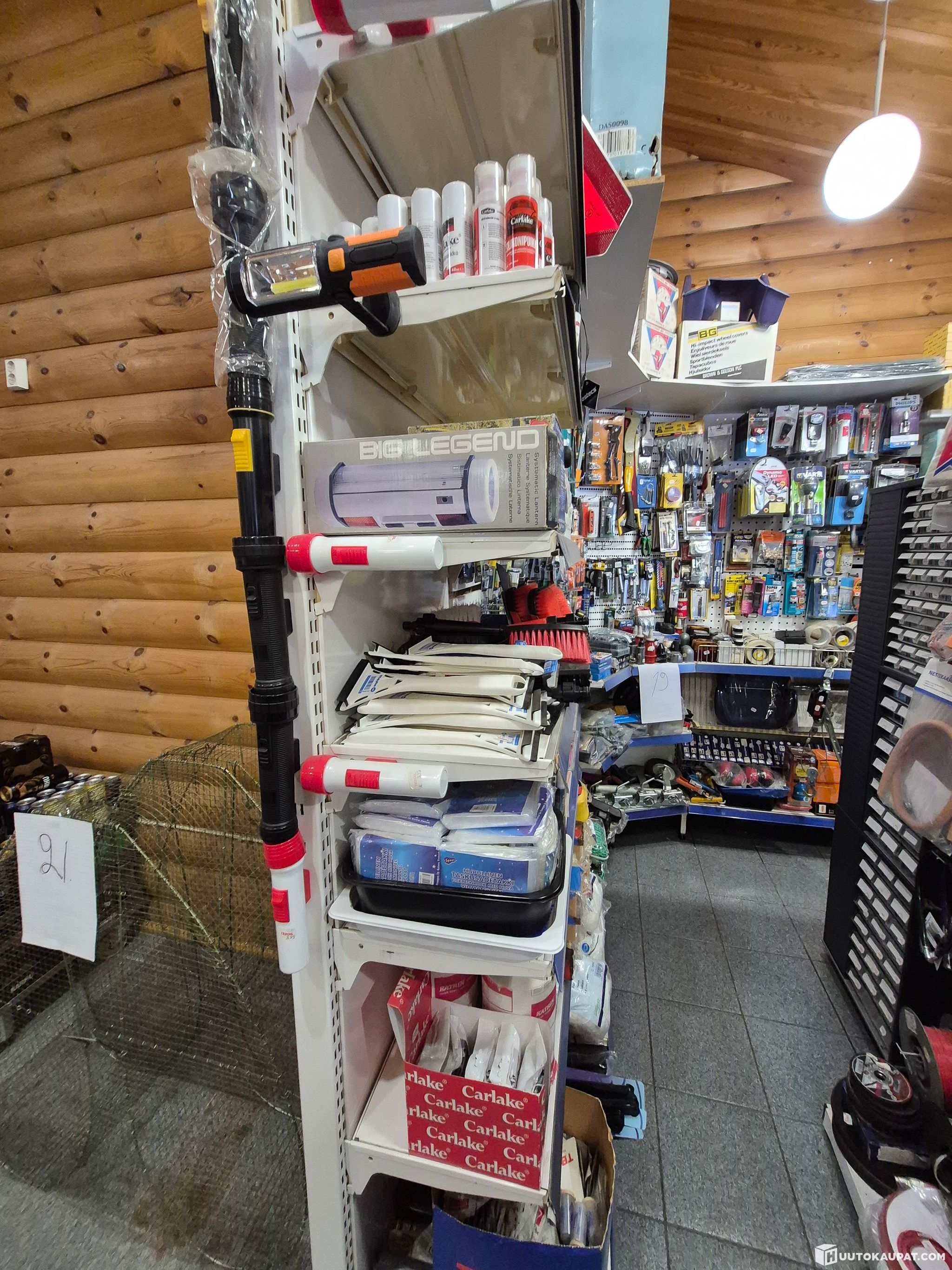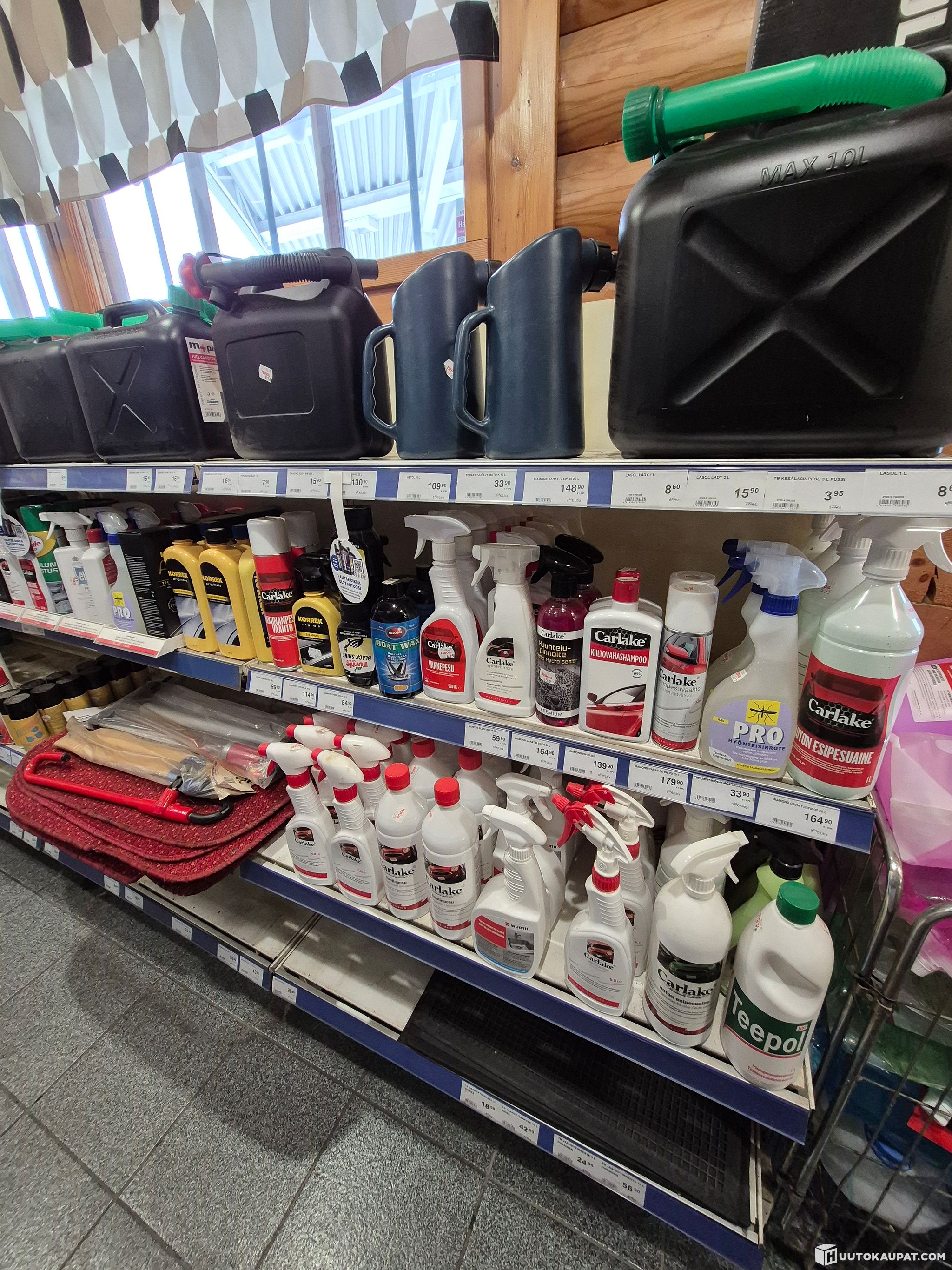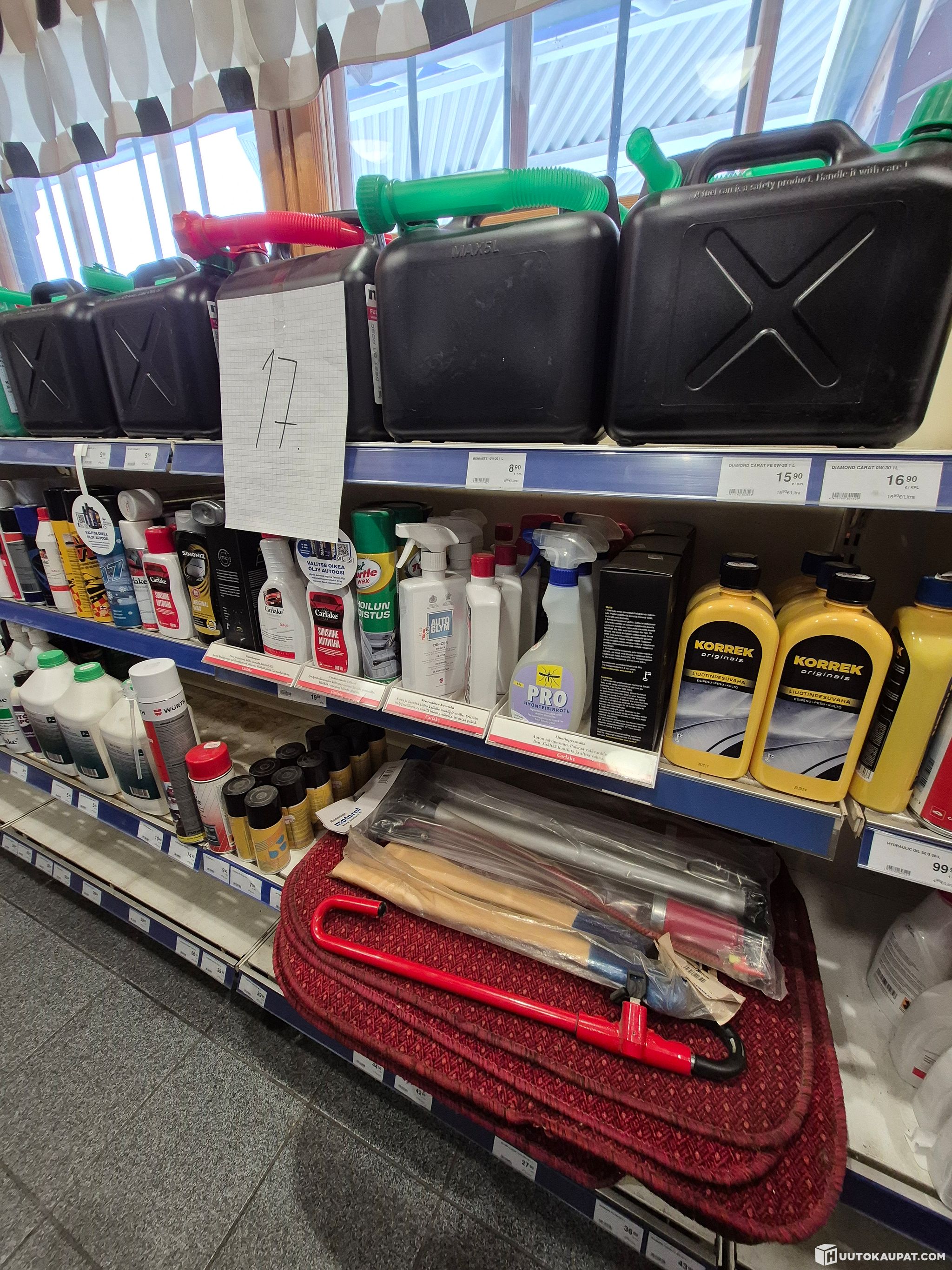 Polttoainekanistereita, autokemikaaleja, autovahoja, liuotinaineita, jarrunesteitä, maalia, kynnysmattoja, auton mattoja, polkupyörän pumppu, kirveen varsia, polkupyöränteline, rukkasia, suojakäsineitä, autokemikaaleja, kaasurasioita, erikoisöljyjä, jäähdyttäjän paikka-aineita, silikonituubeja, renkaan paikkausvaahtoa, akkulatureita, moottorilämmittimen johtoja, halogeenivalaisimia, Boschin umpioita, avaimia, käsivalaisimia, valoja, liimoja, peräkärrytarvikkeita, puhdistustarvikkeita, pesusieniä, paristoja, sulakkeita, testerimittareita, ajopiirturin kiekkoja, sähköisiä parkkikiekkoja, silikonia, lukkosulaa, ensiapupakkauksia, hylsysarjoja, koristekapseleita, lämmityksen ajastukelloja, kuormansidontaliinoja, vatupasseja, metrimittoja, puukkoja, maalipensseleitä, sahoja, hylsyjä, lastenistuimia, polkupyörän kypäriä