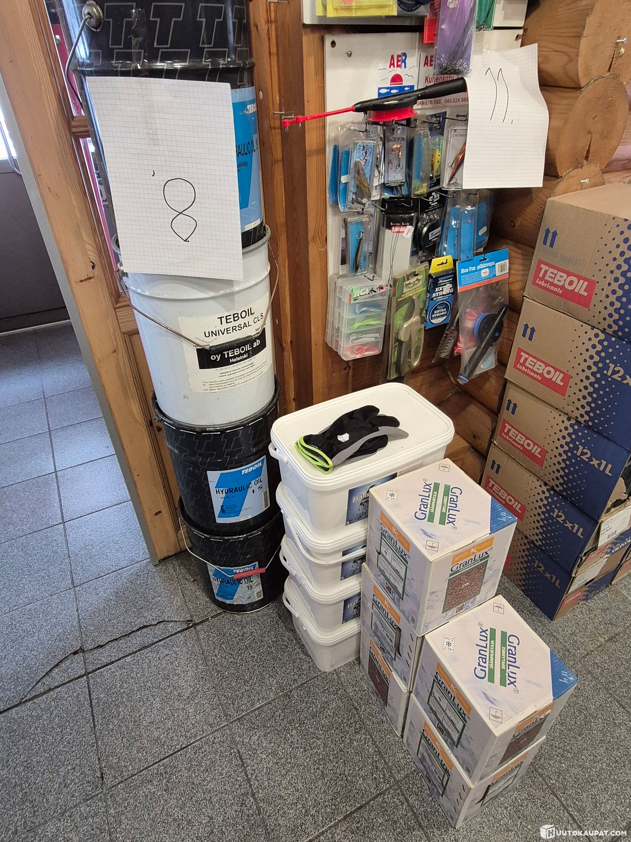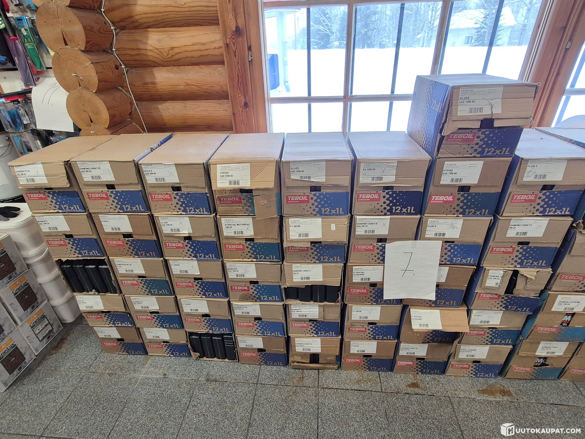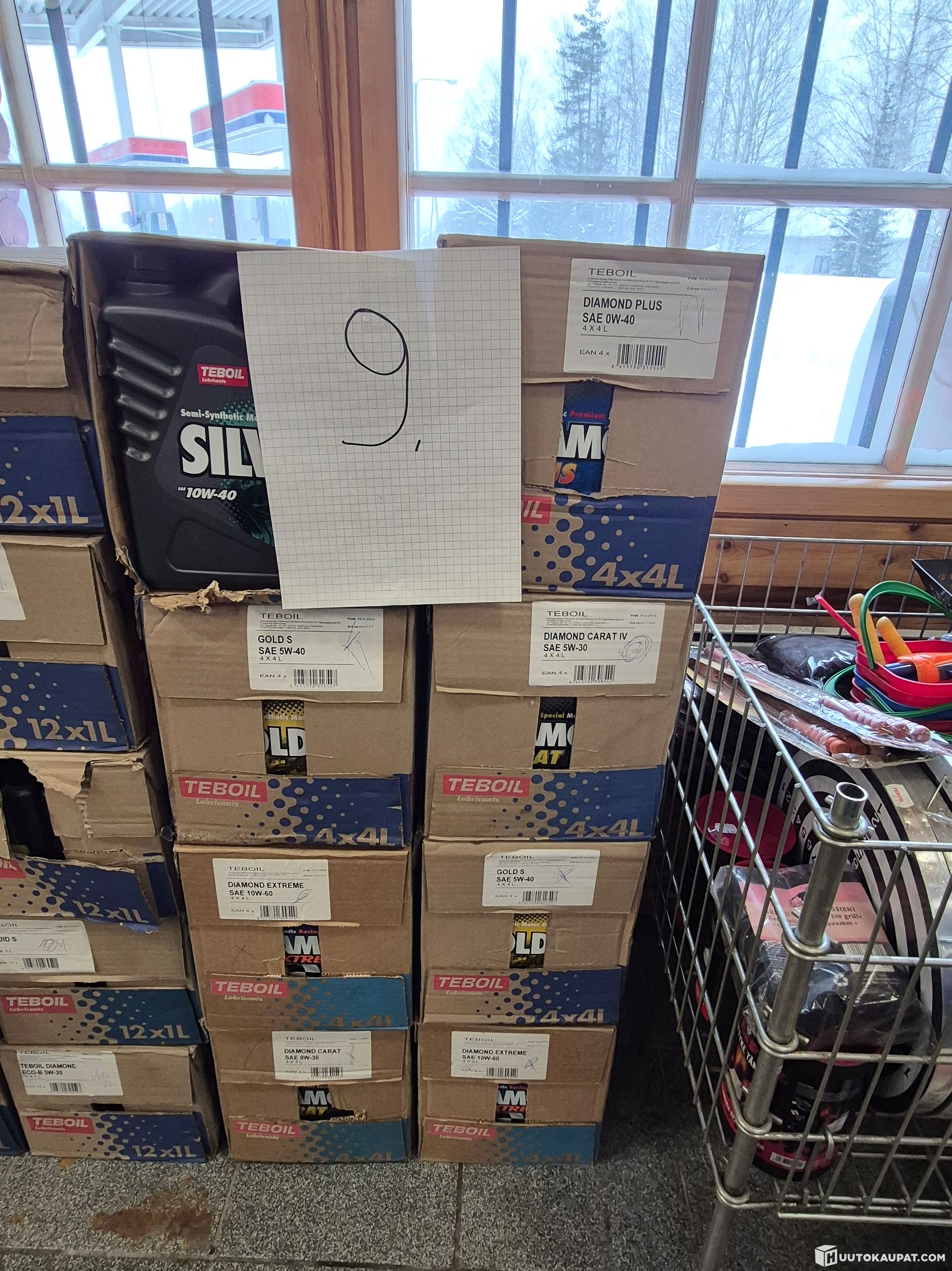 Myydään kuvien ja kuvissa näkyvien numeroiden 7–9 mukaisesti sekalaisia öljyjä, kuten noin 480 kpl erilaisia öljyjä 1 litran pulloissa, 32 kpl sekalaisia 4 litran öljyjä, 20 litraa hydrauliikkaöljyä, CLS-keskusvoitelurasvaa, 4 pakettia jäänsulatusraetta, 5 pakettia hiekoitushiekkaa