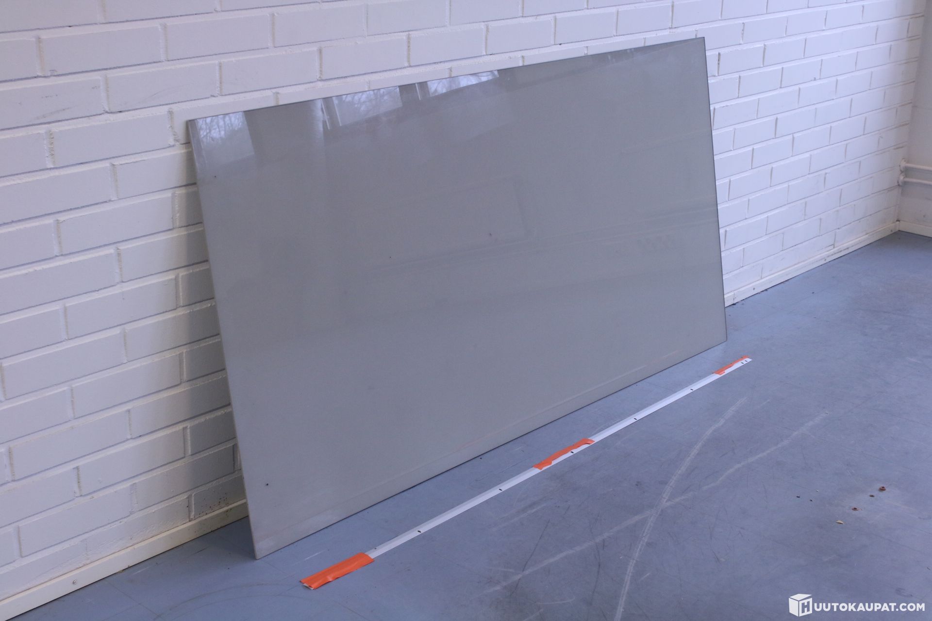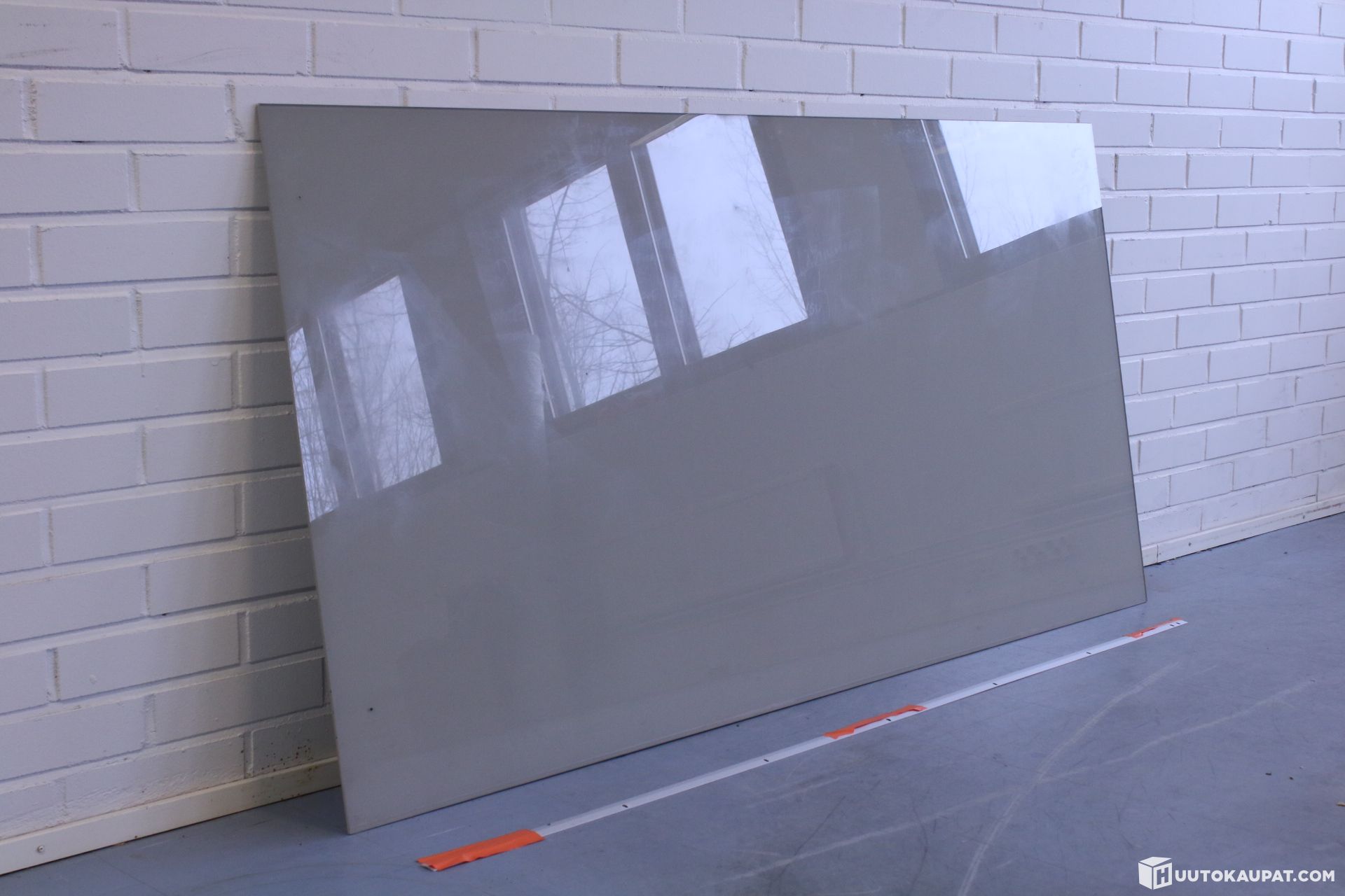 Harmaan värinen Lintexin Mood Wall-lasitaulu. Kiinnitetään seinään kahdella kuvan mukaisella seinäkiinnityksellä. Settiin kuuluu molemmat kiinnikkeet, ruuvit ja taulu.