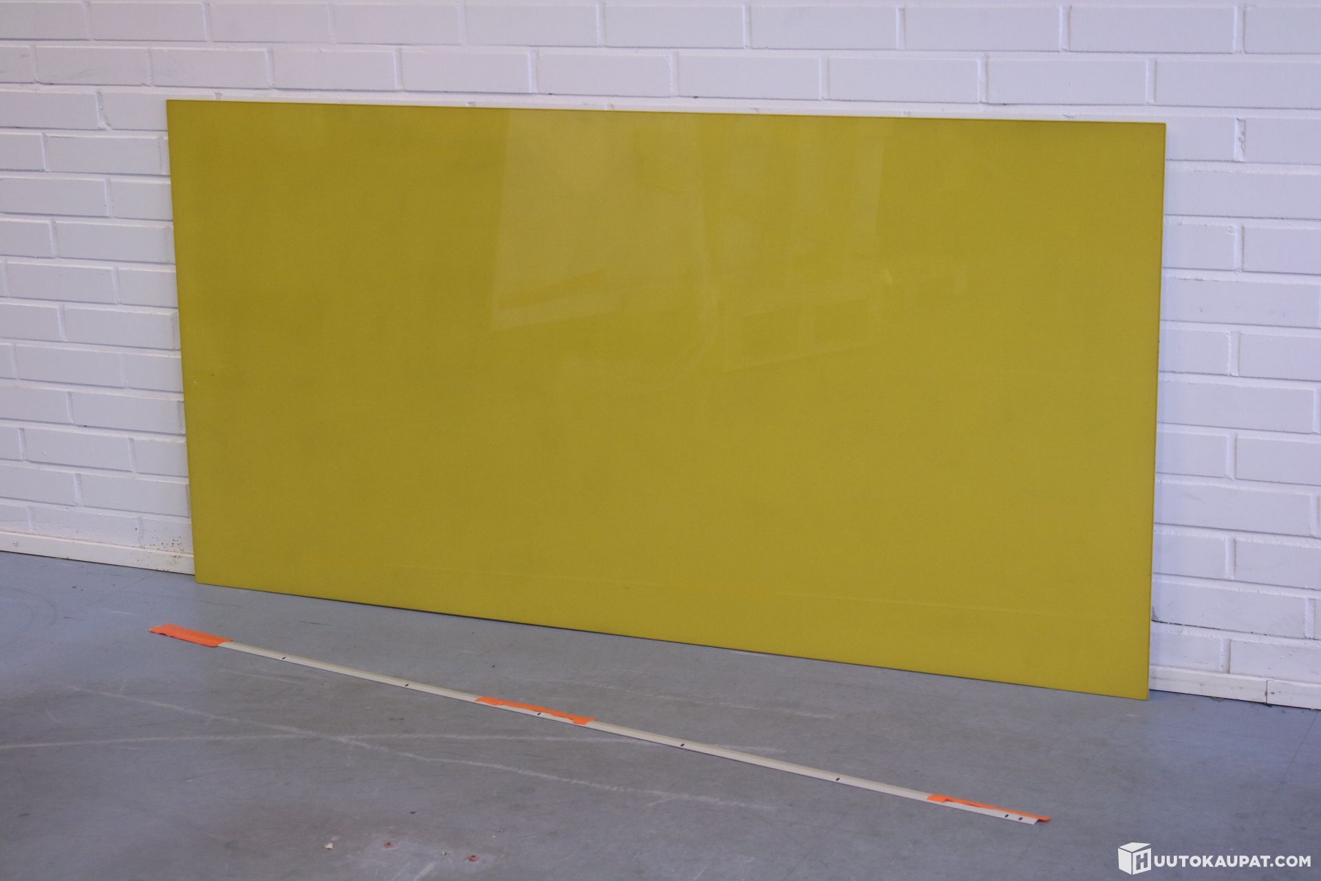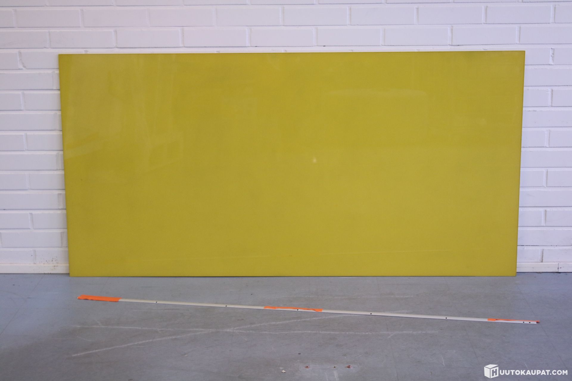 Keltaisen värinen Lintexin Mood Wall-lasitaulu. Kiinnitetään seinään kahdella kuvan mukaisella seinäkiinnityksellä. Settiin kuuluu molemmat kiinnikkeet, ruuvit ja taulu.