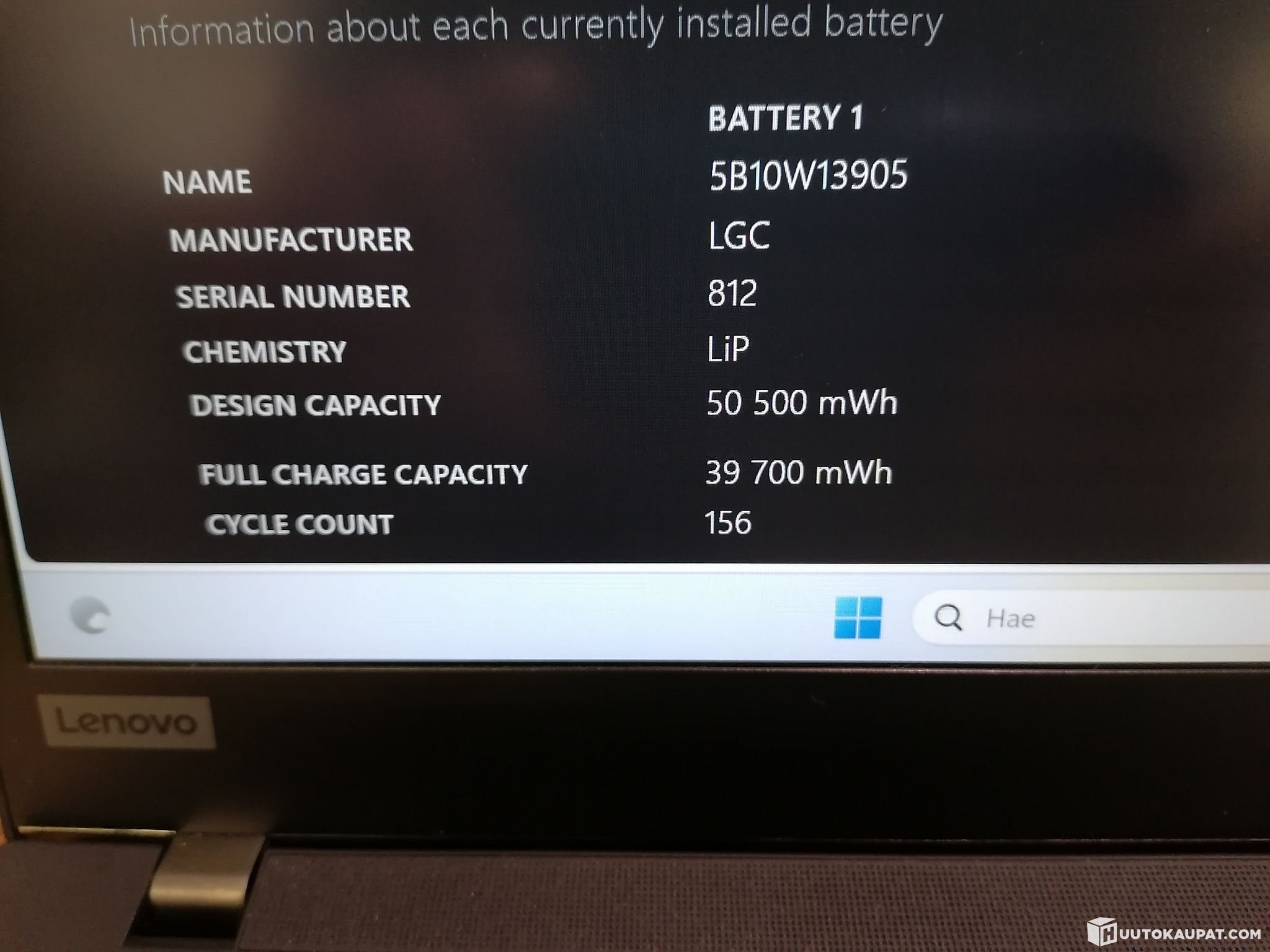 Koneen akku toimii, kestoaika erinomainen +6h. Alkuperäisestä kapasiteetista jäljellä hieman yli 78%.