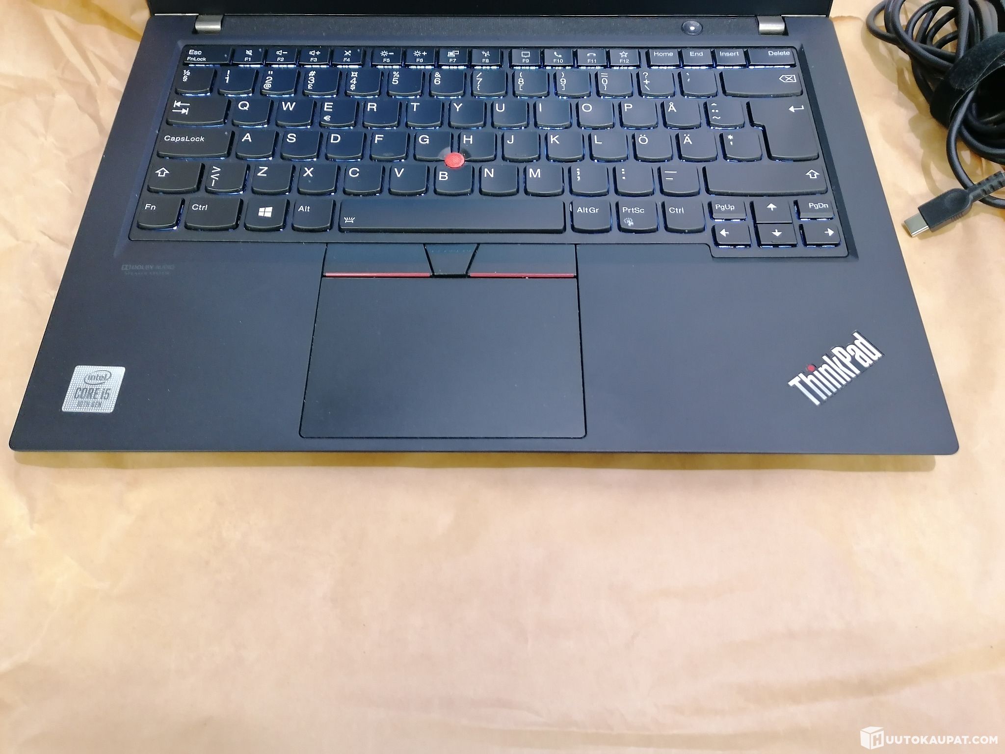 Mukana tulee koneeseen soveltuva Lenovon oma USB-C laturi.