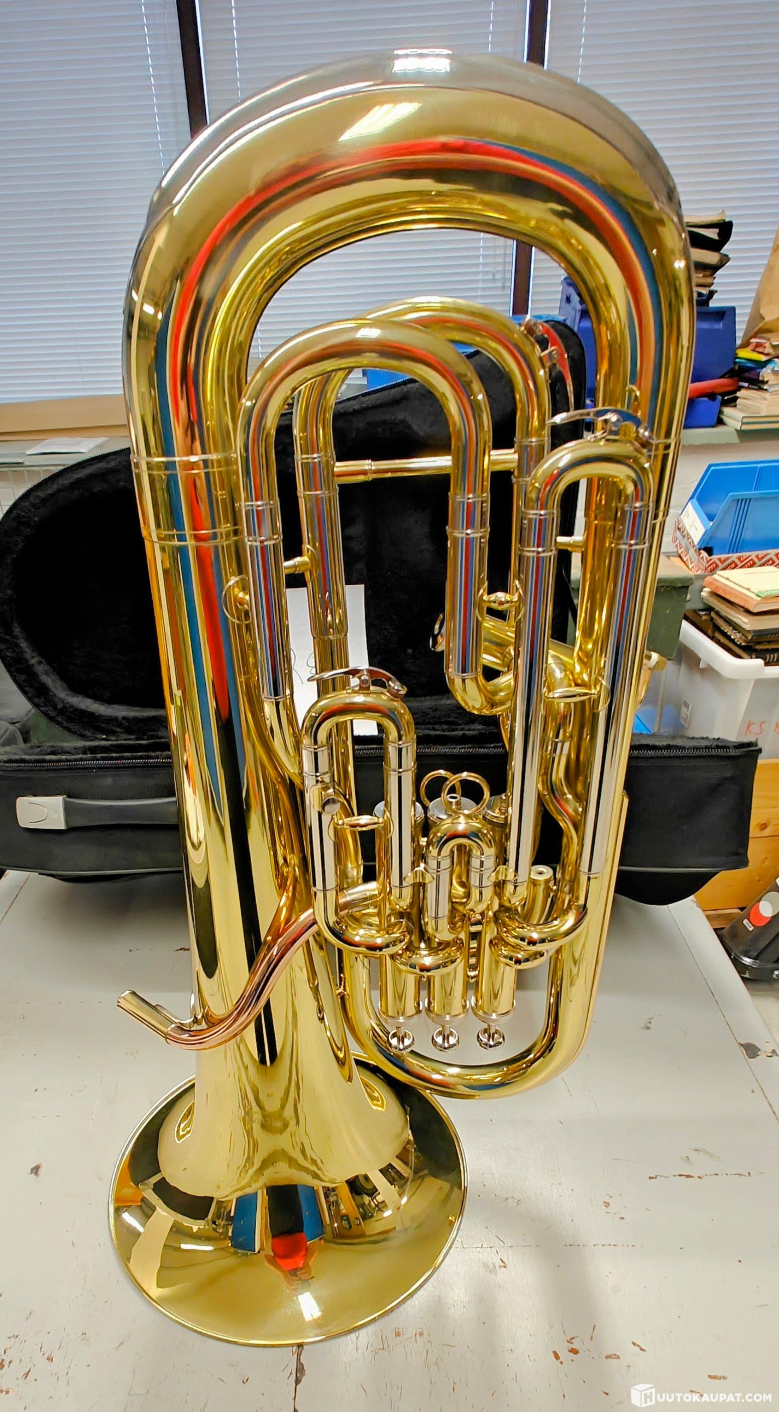 Puhallin soitin (baritonitorvi?) kuljetussalkussa. (kohde 28)