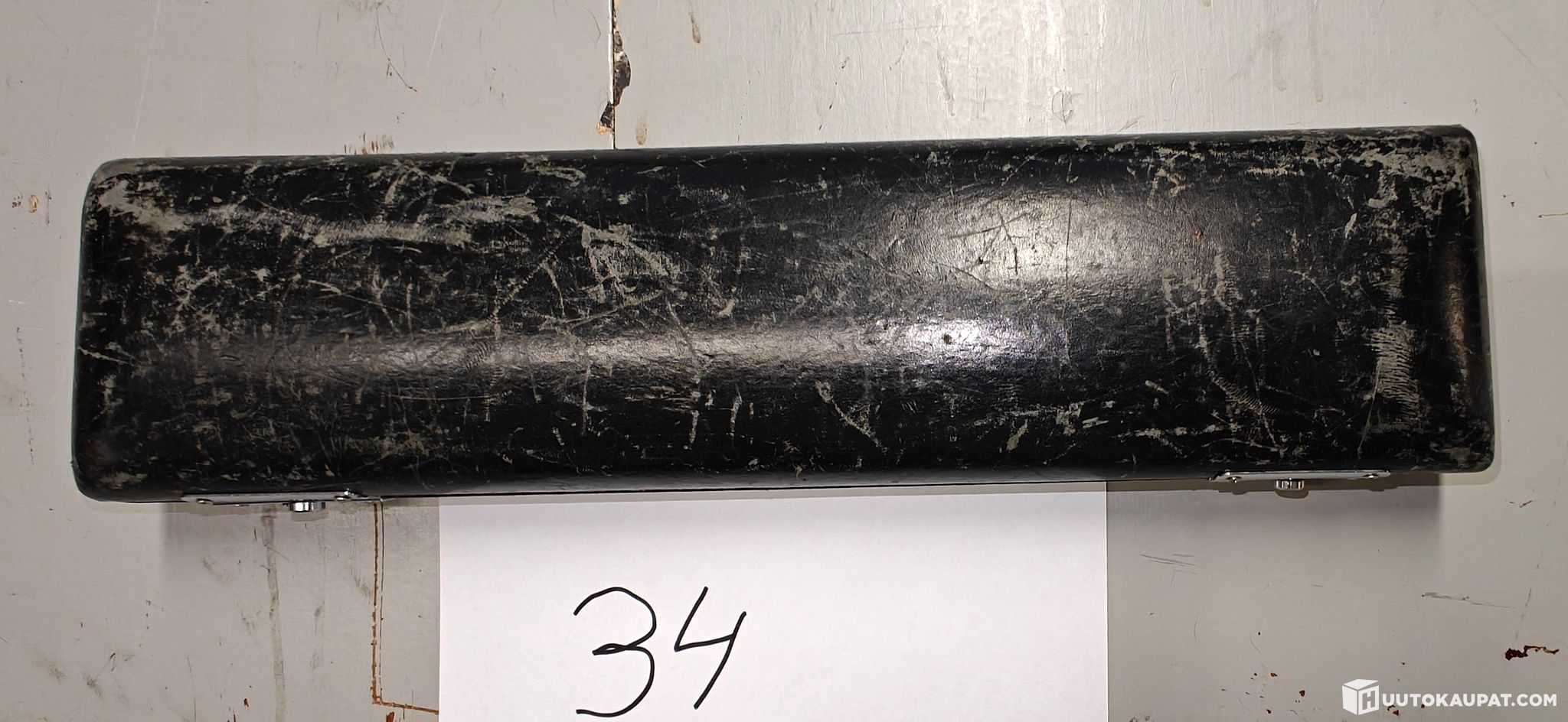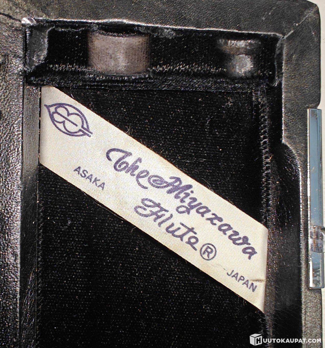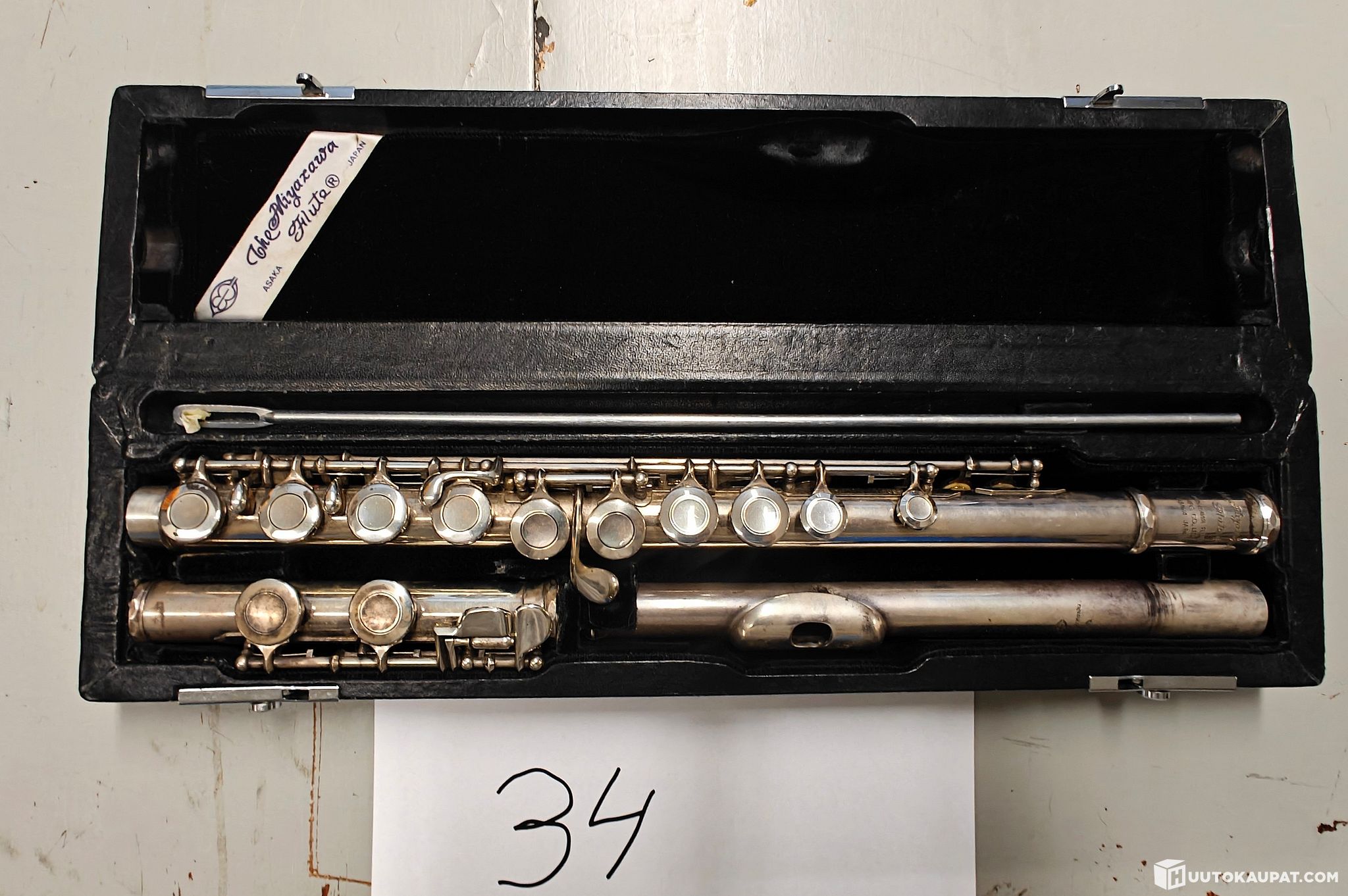 Puhallin soitin Miyazawa ( poikkihuilu?) kuljetuskotelossa. (kohde 34)