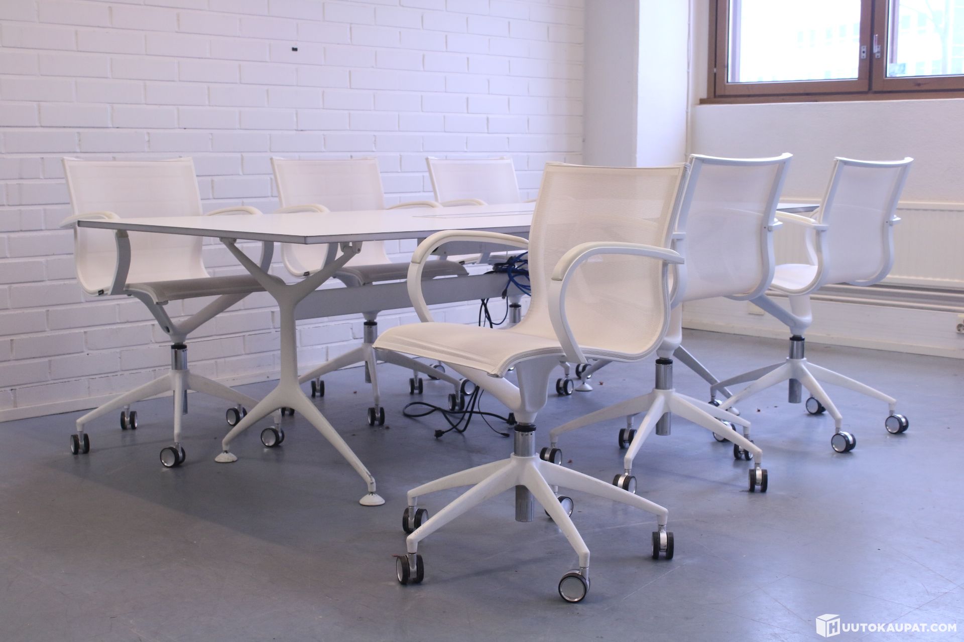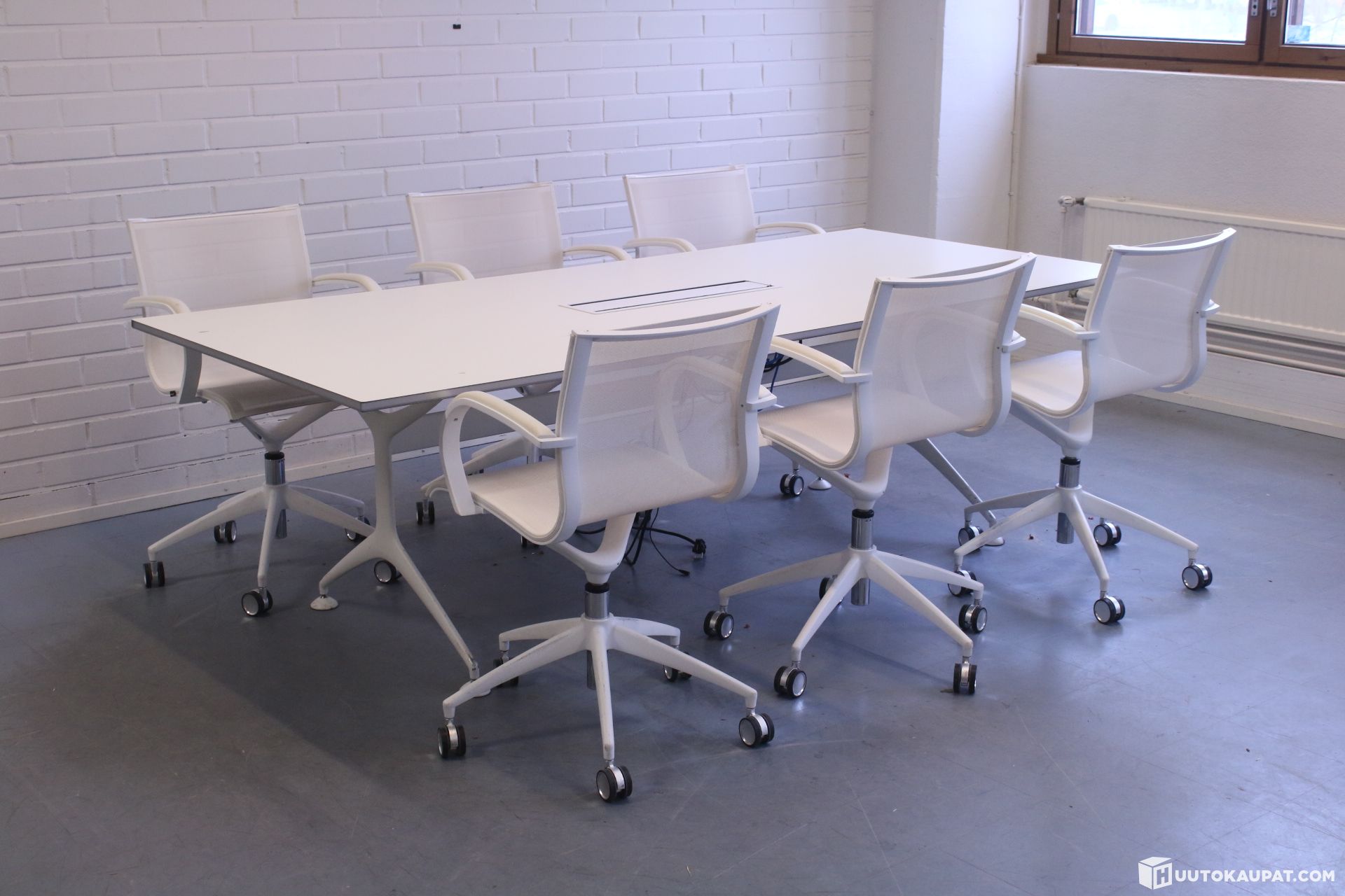 Laadukas Aliaksen neuvottelupöytä ja kuusi Italialaista Emmegin tuolia. Pöydän suunnitellut Alberto Meda.