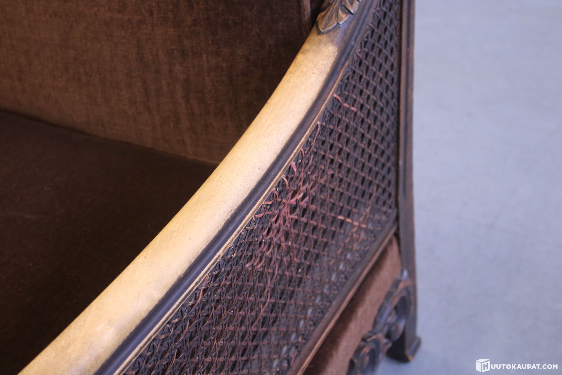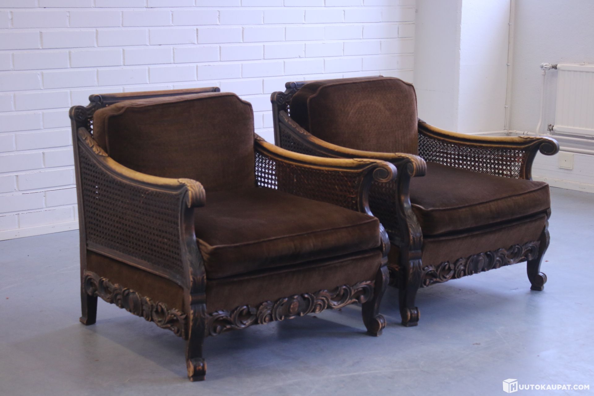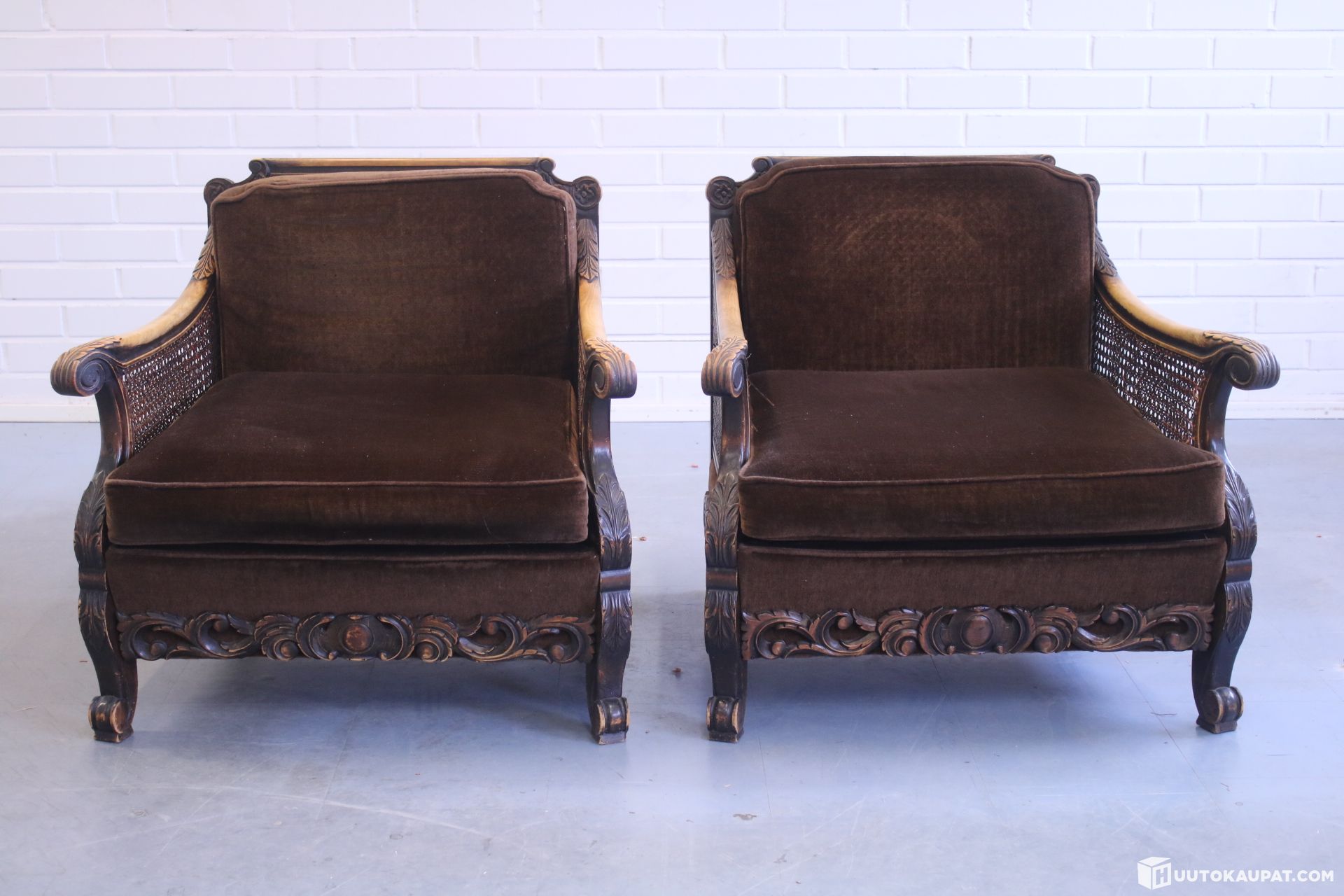 Kaksi kauniisti muotoiltua nojatuolia. Puu on käsin kuvioitu ja sivut rottinkia. Tyynyt uudelleenverhoiltu jossain vaiheessa.