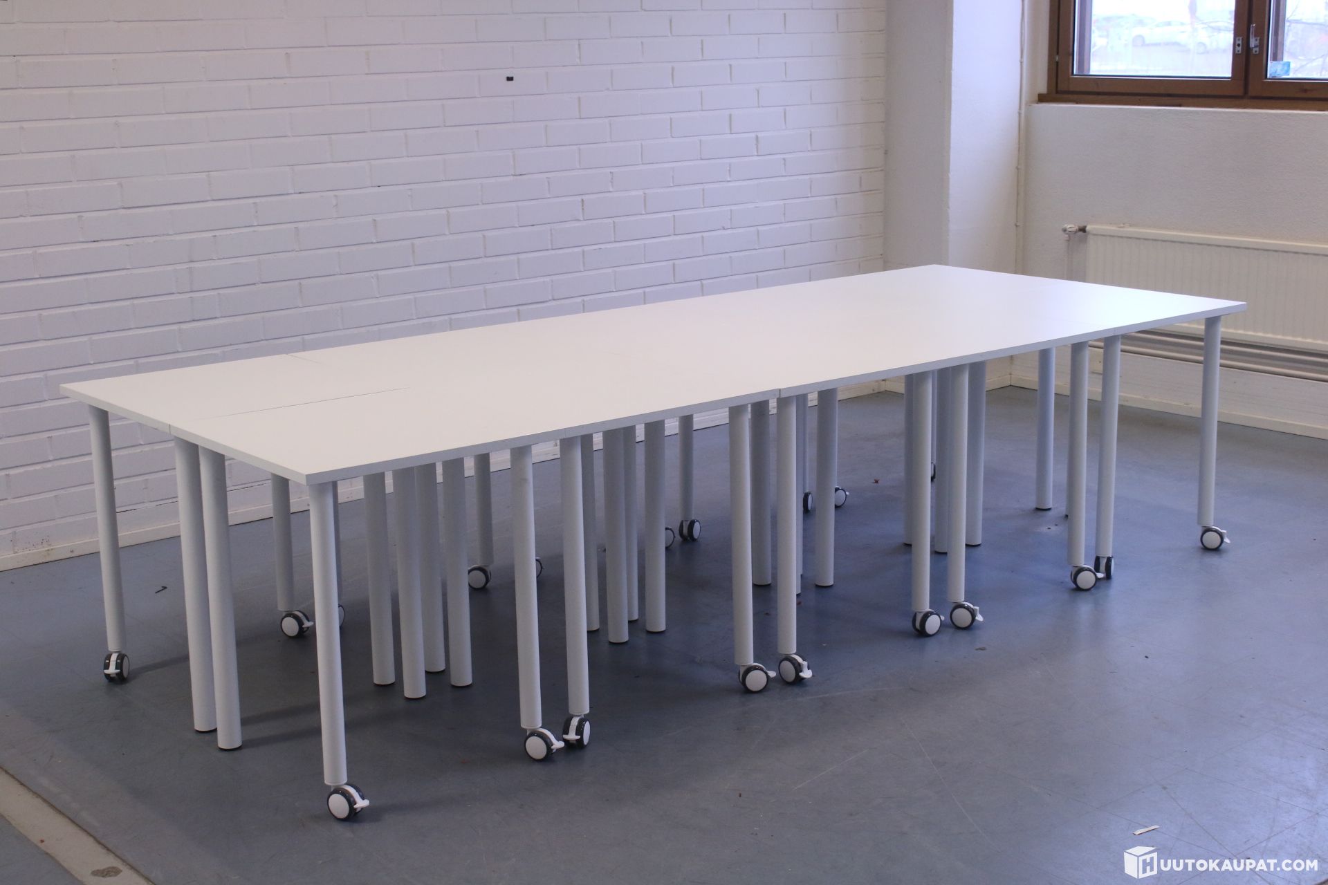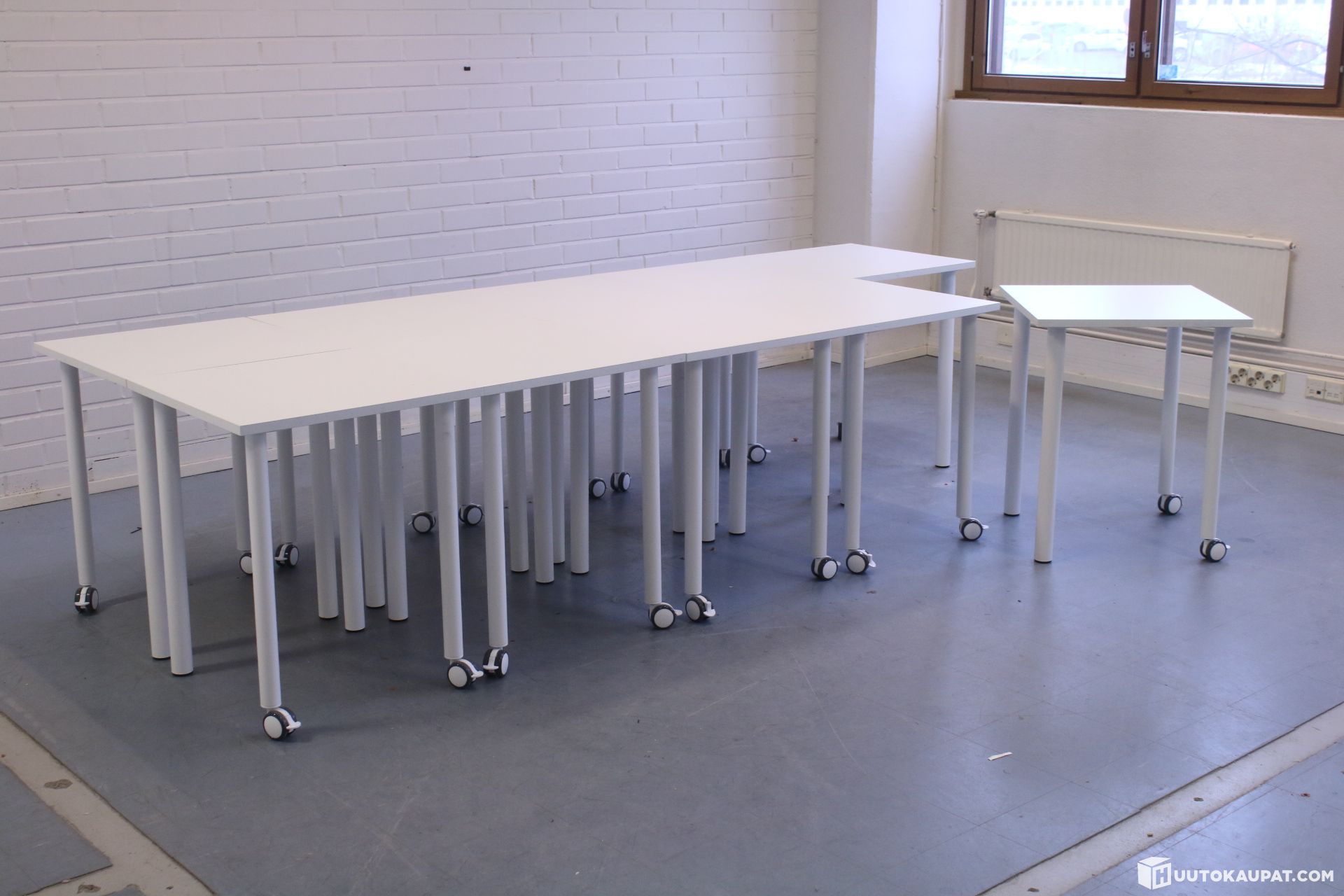 10 kappaletta vuoden vanhoja Martela Pinta 1-pöytiä. Pöydissä on kahdessa jalassa lukittavat renkaat. Soveltuu moneen eri käyttöön.