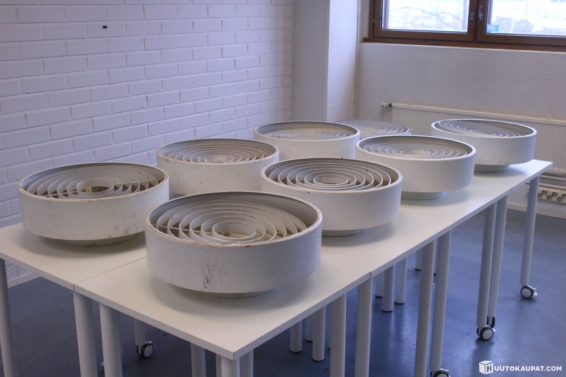 Kahdeksan kappaletta vanhoja kattovalaisimia. Seitsemän identtistä ja yksi harmaa, johon ritilä ei sovi sellaisenaan. Suunnittelija mitä luultavammin Lisa-Johansson Pape.