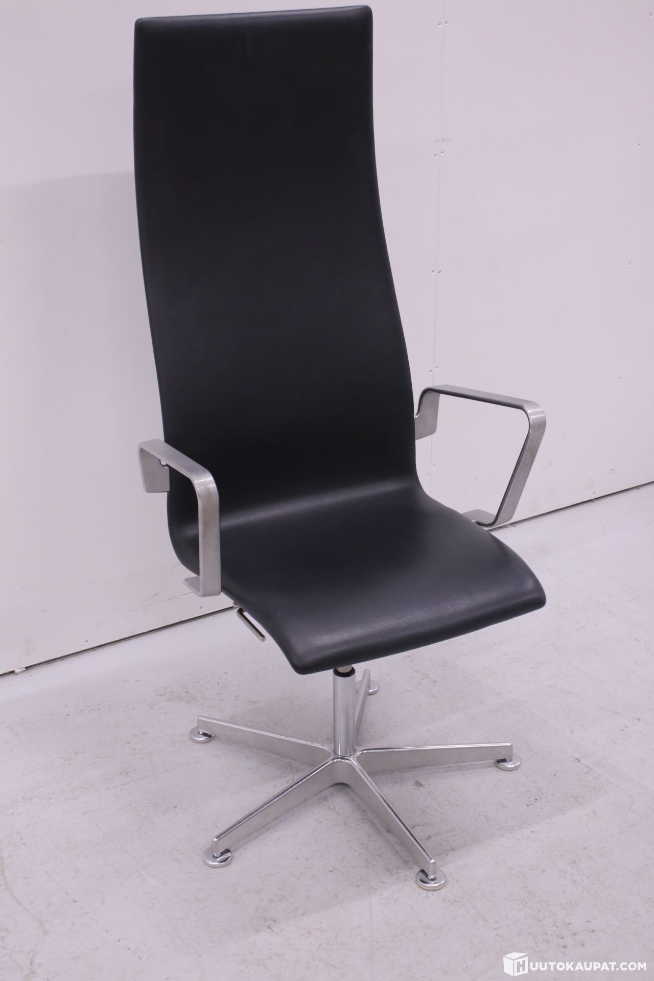 Myynnissä klassinen Fritz Hansen Oxford -työtuoli, joka on Arne Jacobsenin suunnittelema design-ikoni. Tuolissa on korkea selkänoja, musta nahkaverhoilu ja harjatusta alumiinista valmistetut käsinojat sekä viisisakarainen jalusta.