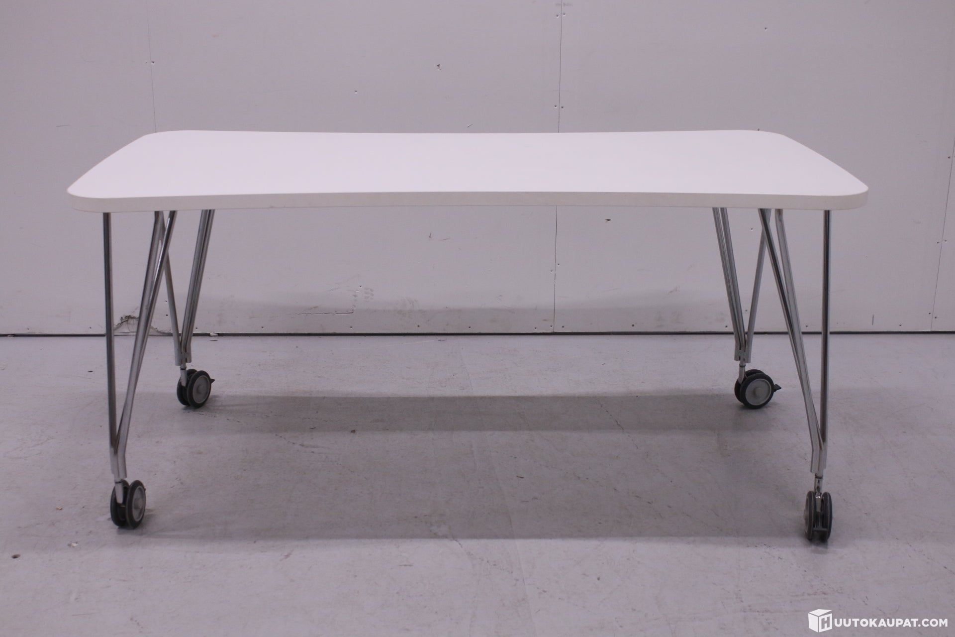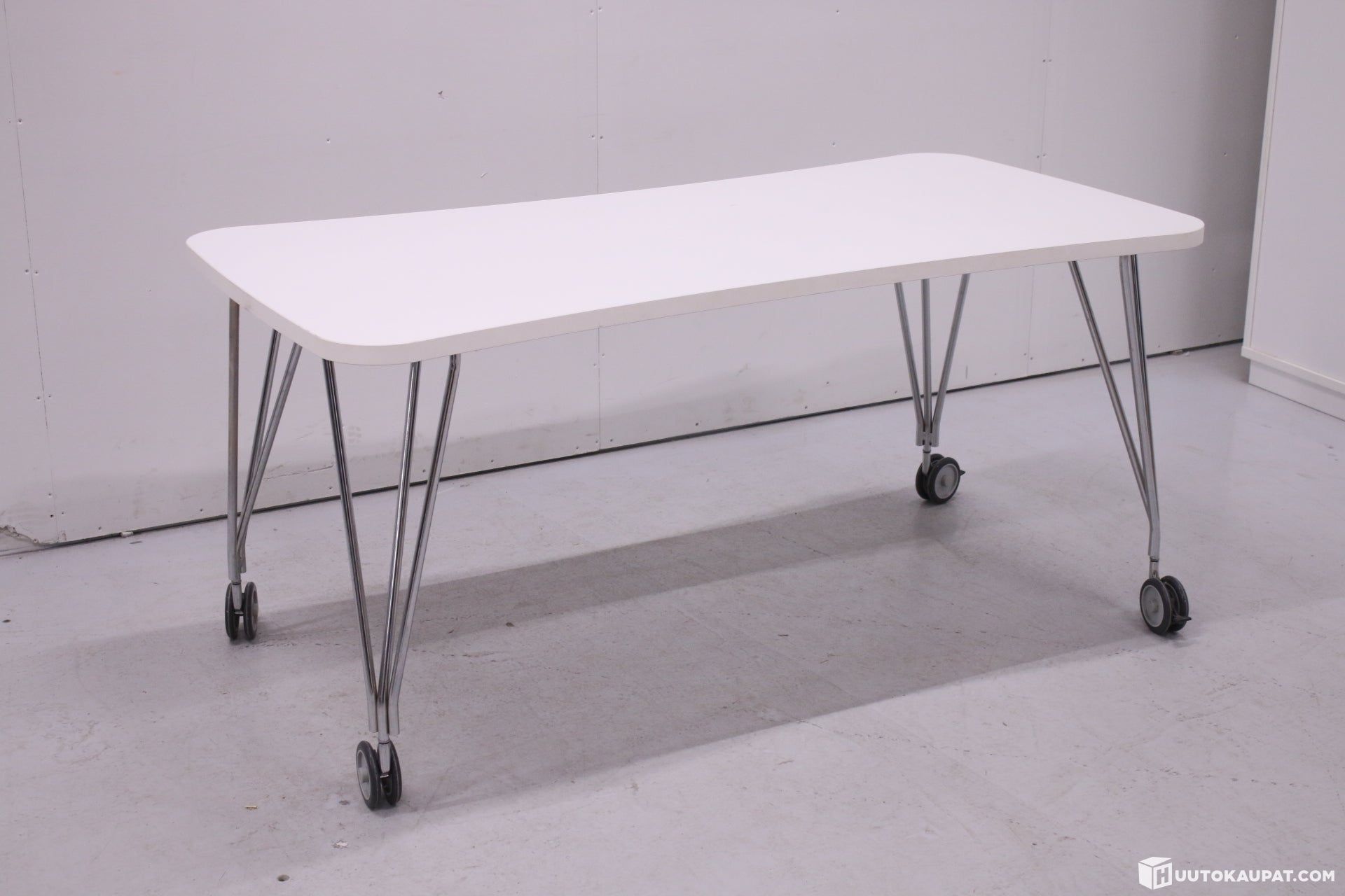 Arvokas Kartellin Max-pöytä lukittavilla renkailla. Valkoinen laminaattikansi kromisilla pinnajaloilla. Suunnittelija Ferruccio Laviani.