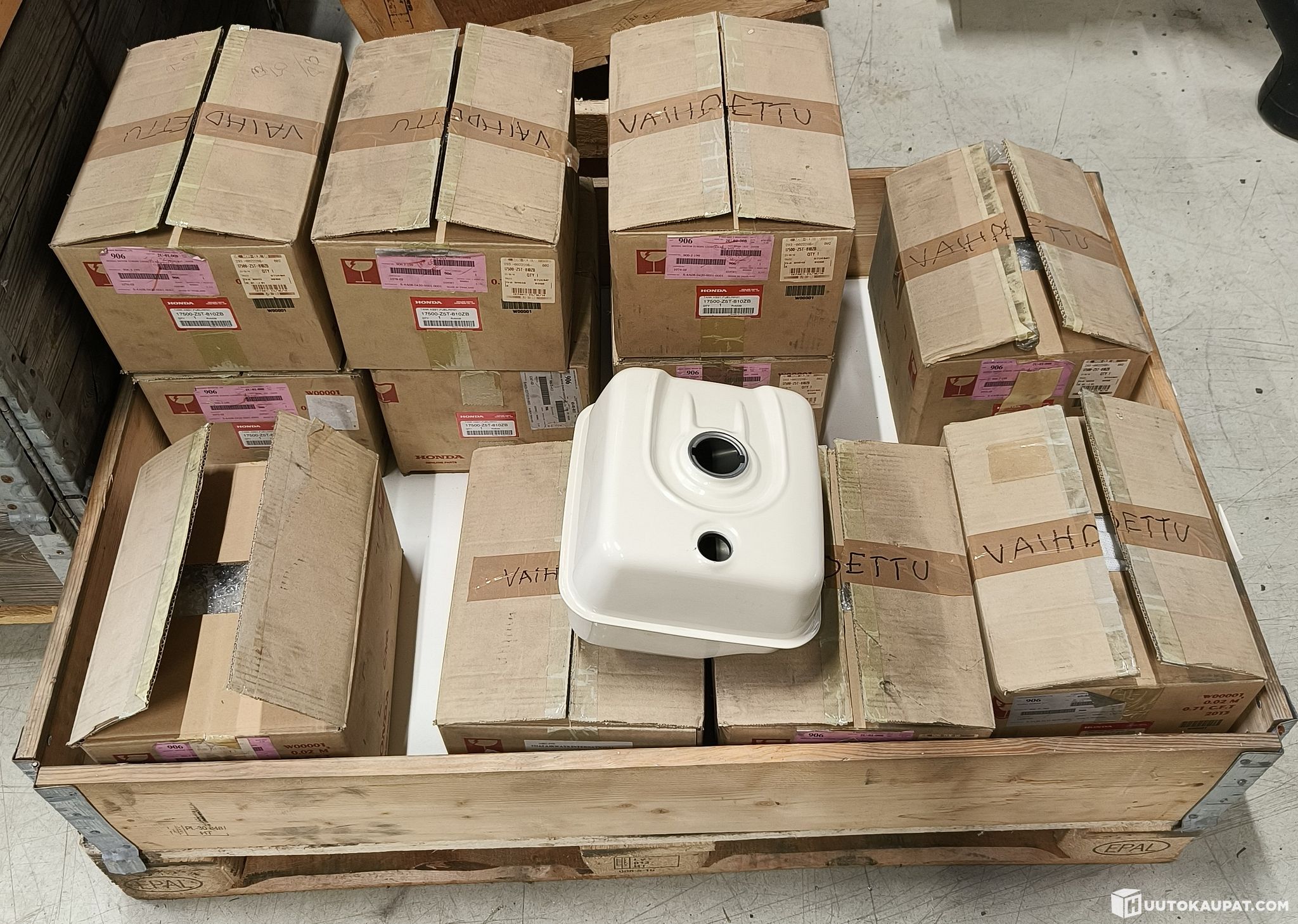 11 kappaletta Hondan alkuperäisiä tankkeja, joissa ei ole reikää polttoainemittaria varten. Oletettu valmistajan tuotekoodi 17510-Z5T-000ZB. (Laatikoissa eri koodi mutta sisältö ei vastaa sitä.)