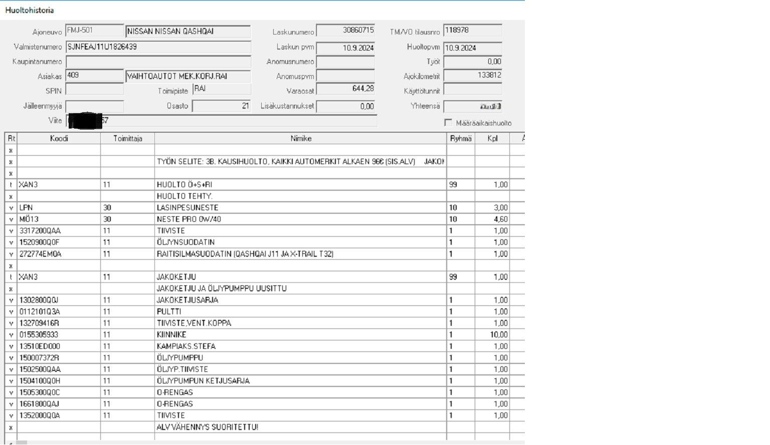 Jakoketju vaihdettu 2024, tästä ei löytynyt kuittia mutta merkkiliikkeen leima kyseiselle edellisen omistajan mainitsemalle ajankohdalle. Varmistettu merkkiliikkeestä 3.3.26. Tehty 133812km, liitetty kuviin sähköinen näkymä työmääräyksestä.