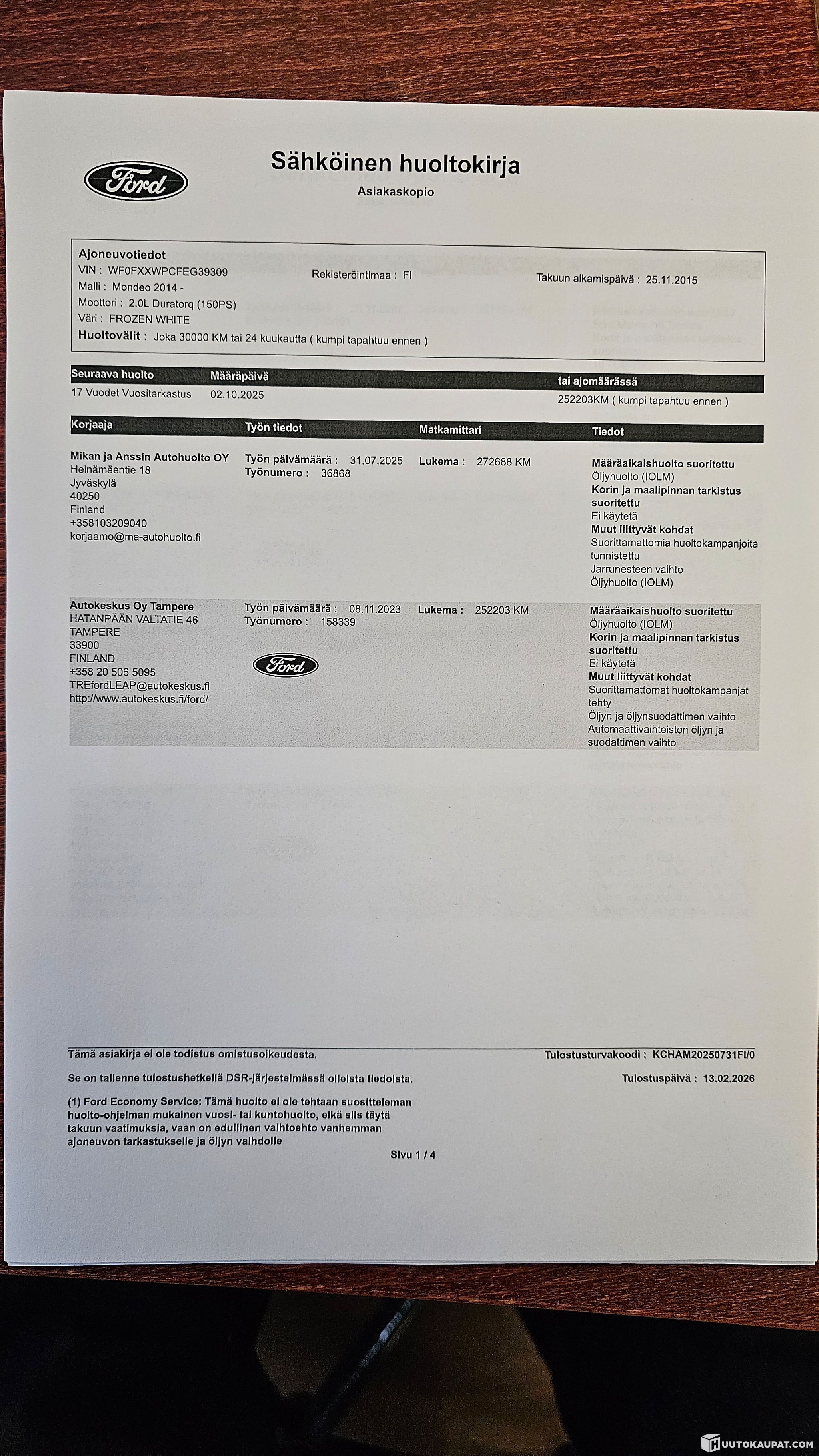 Todella kattava huoltokirja, esimerkiksi vaihteistoöljyt vaihdettu jo 5 kertaa ja toimii myös sen mukaisesti.