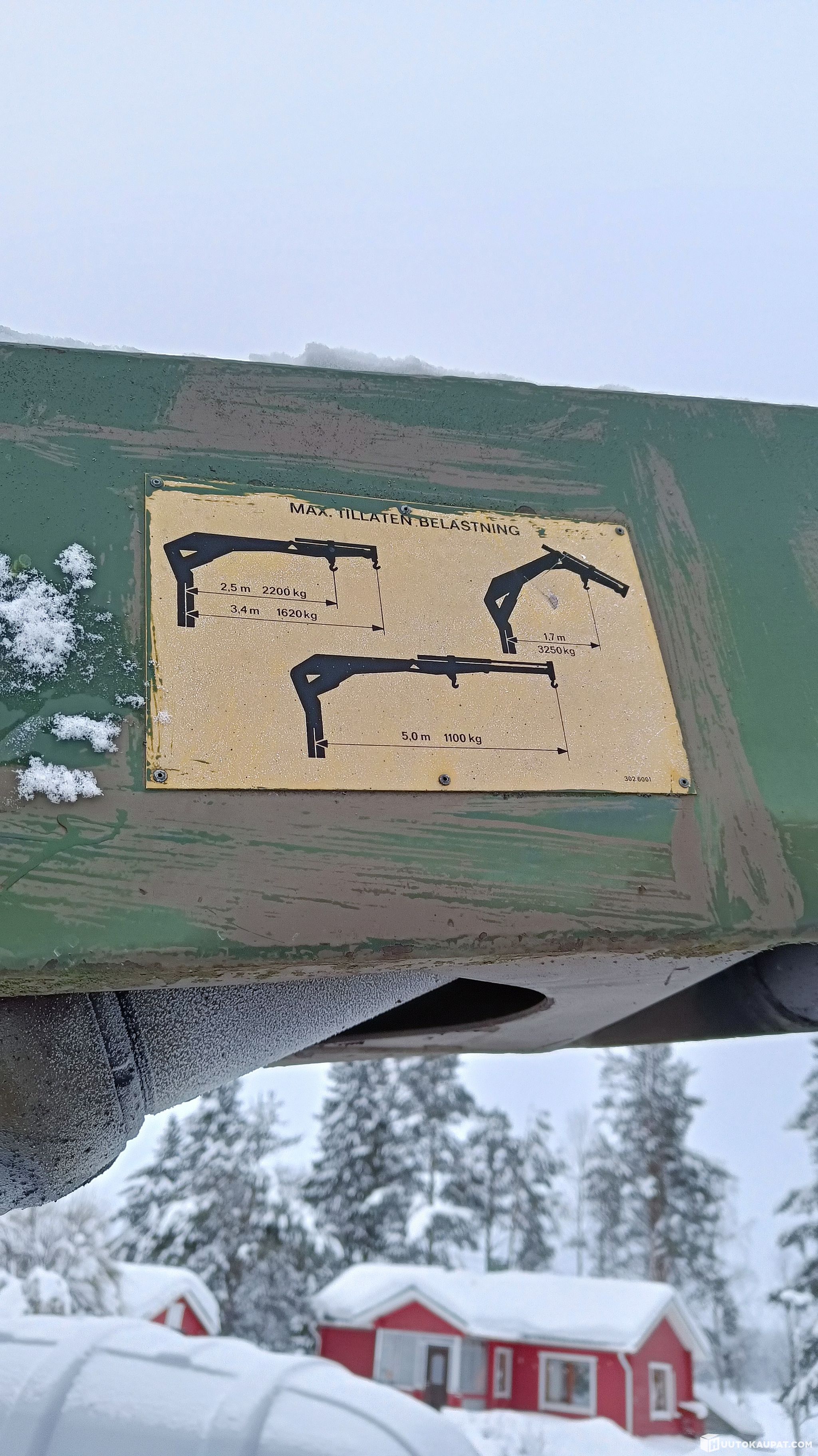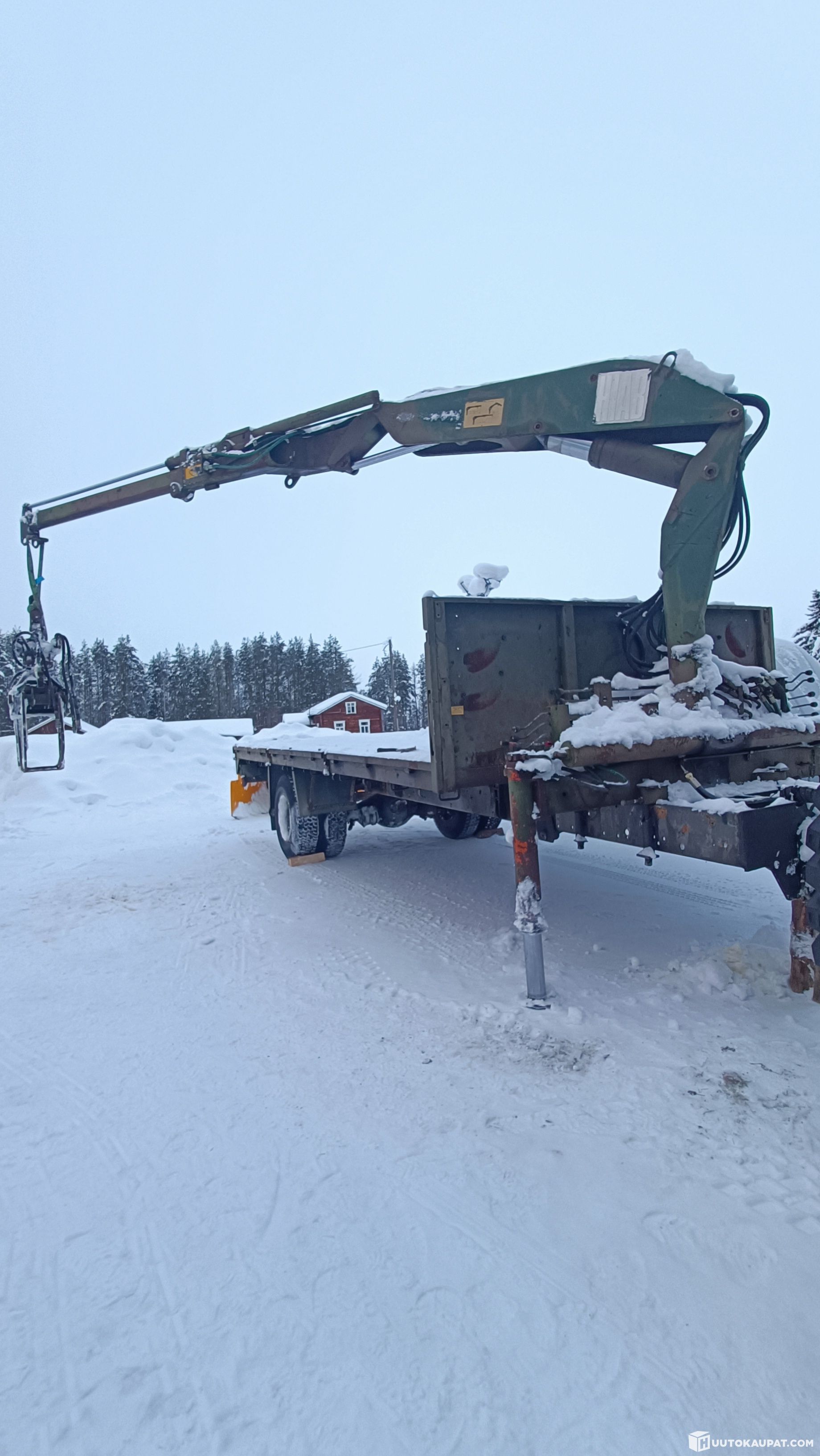 Kuorma-auton alustalle rakennettu kärry, keulassa jämerä nosturi.
