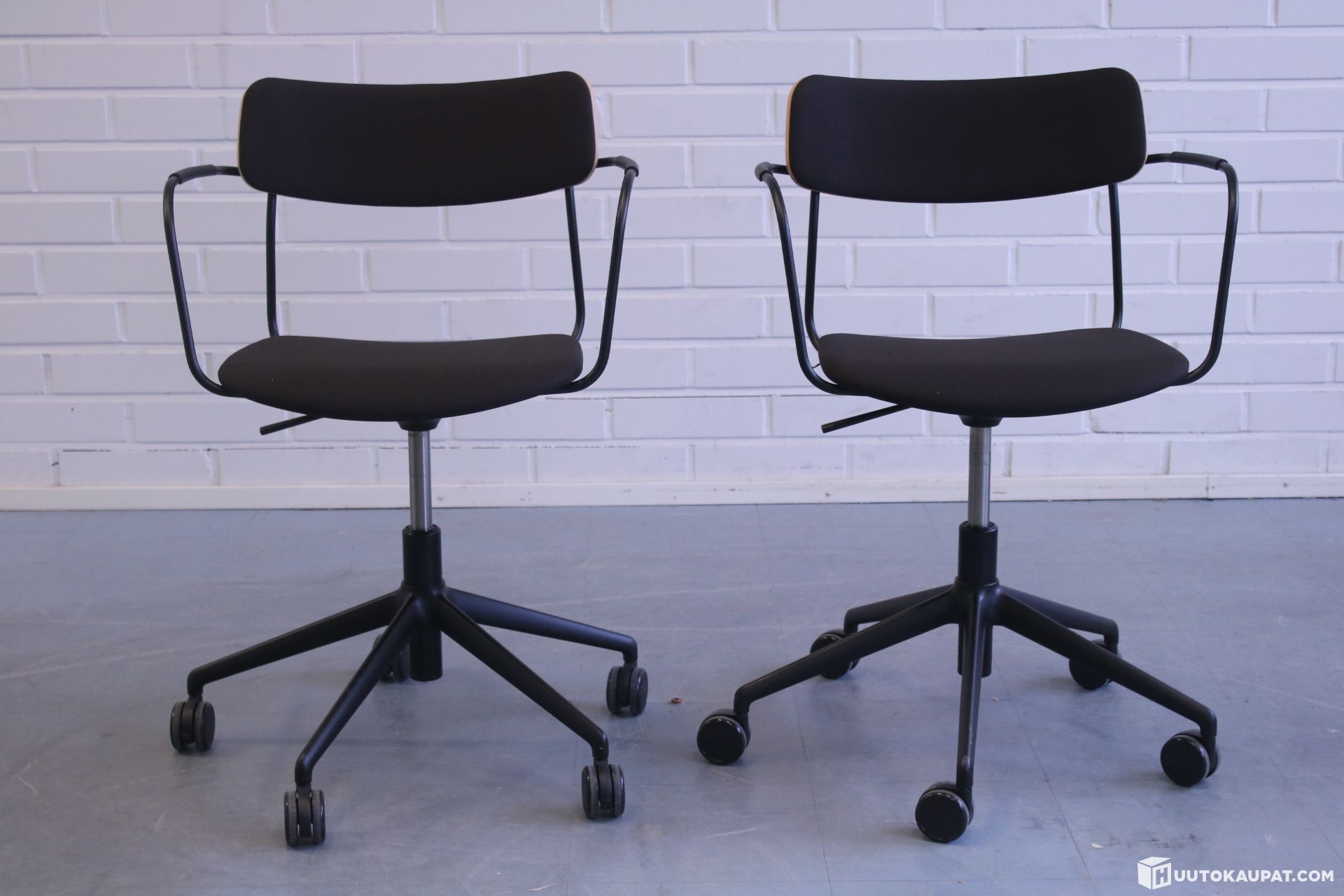 Kaksi korkeus säädettävää Martelan Ella-tuolia upeissa tummissa sävyissä. Sopii erinomaisesti Esim. Kotikonttorille.