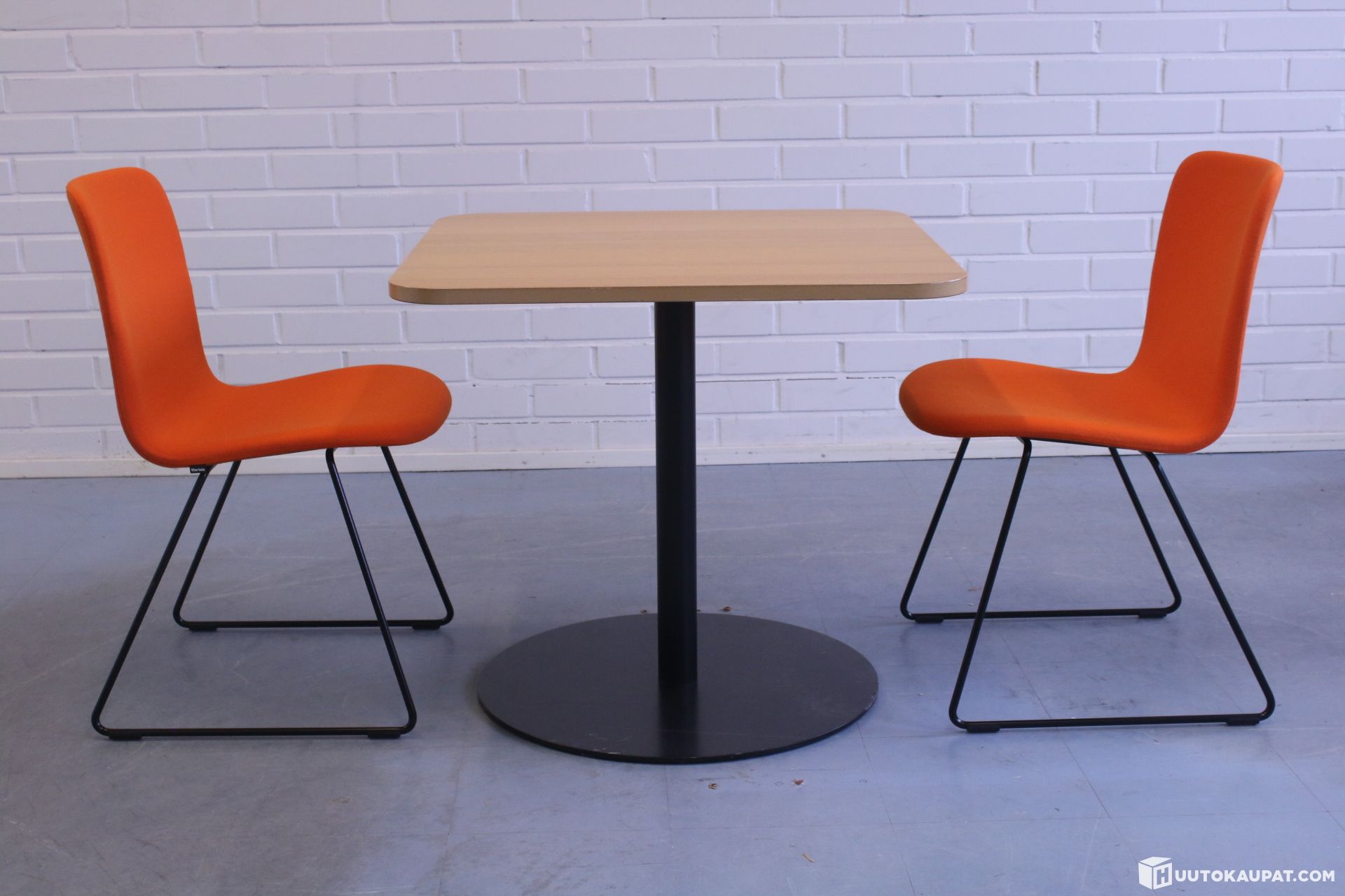 Kaksi kirkkaan oranssia Sola-tuolia ja Iskun tukeva kahvipöytä.