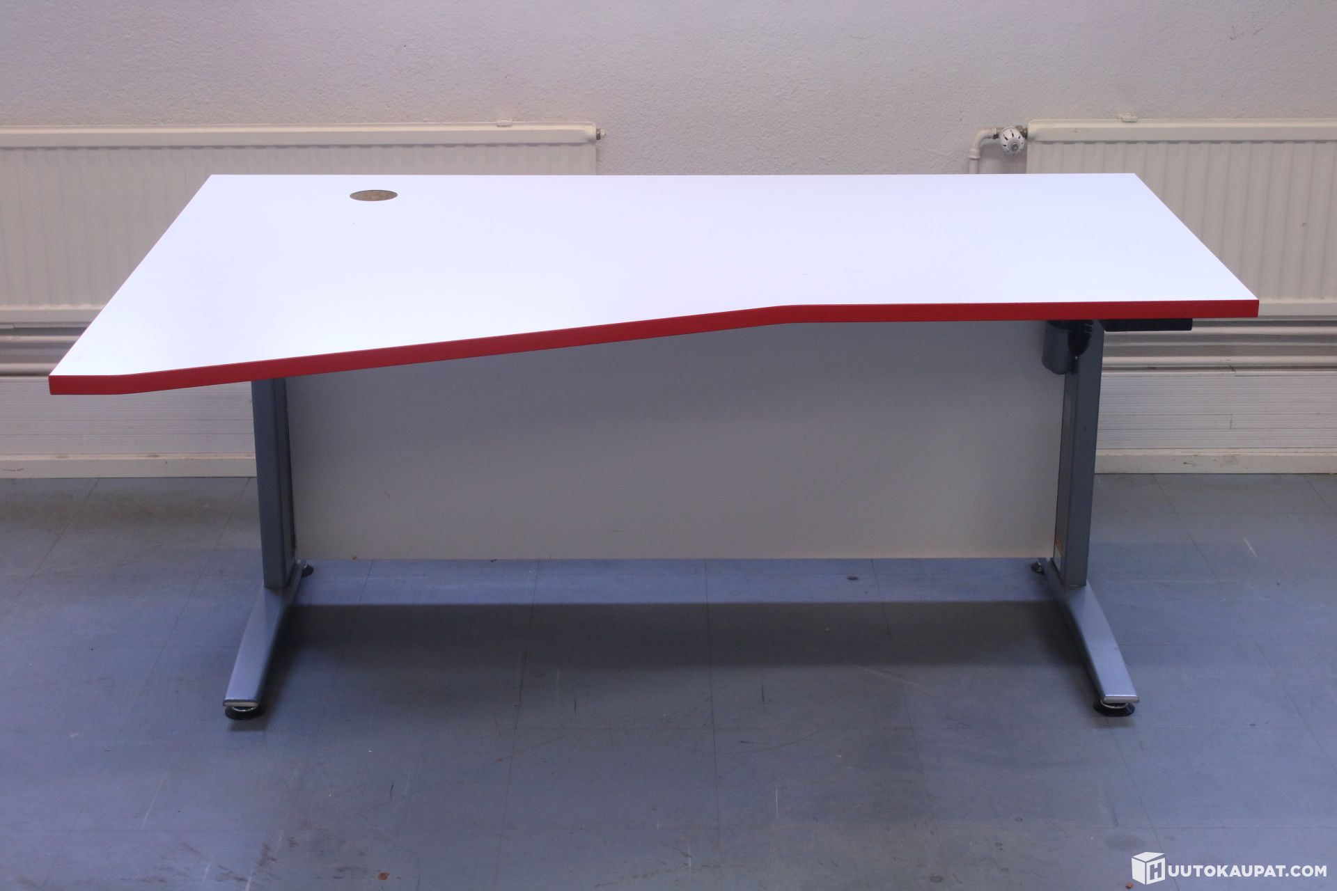 Tyylikäs sähköpöytä punaisella listalla. Vasemman puolinen kulmakansi. Pöydässä on näköeste jalkoihin / siveyspaneeli.