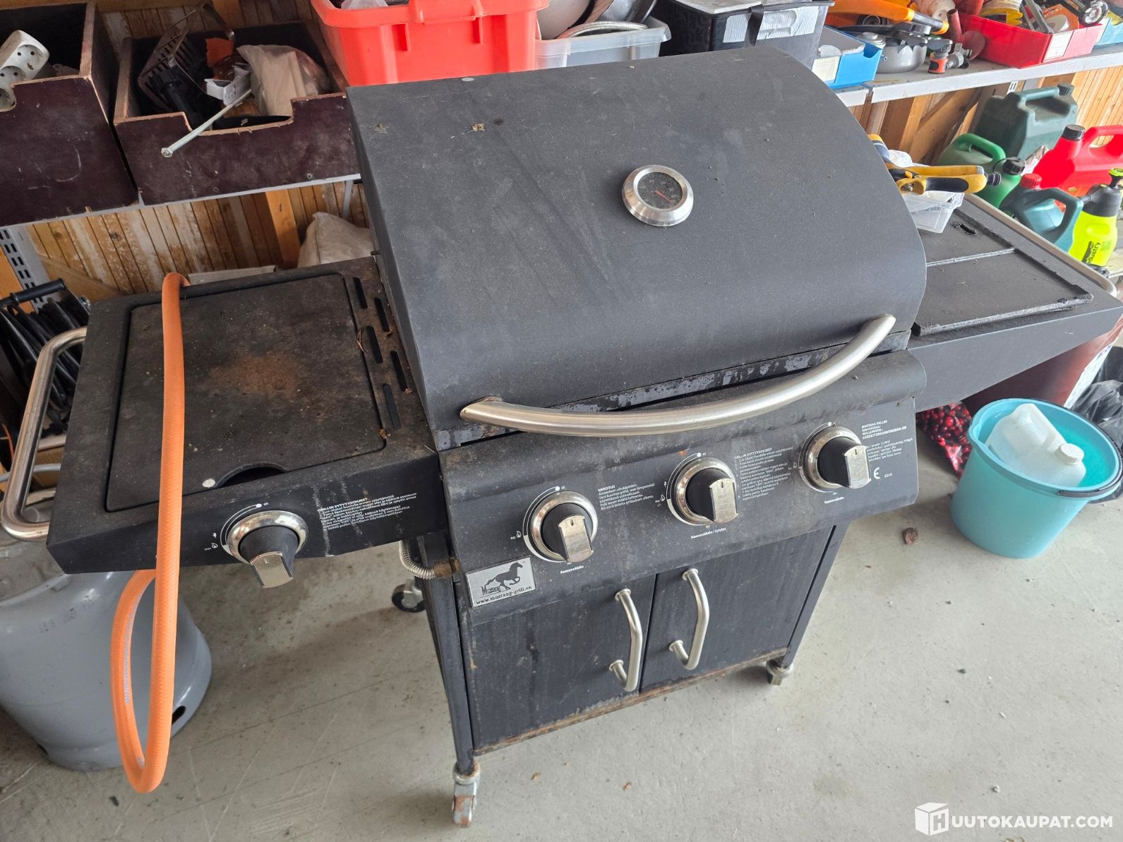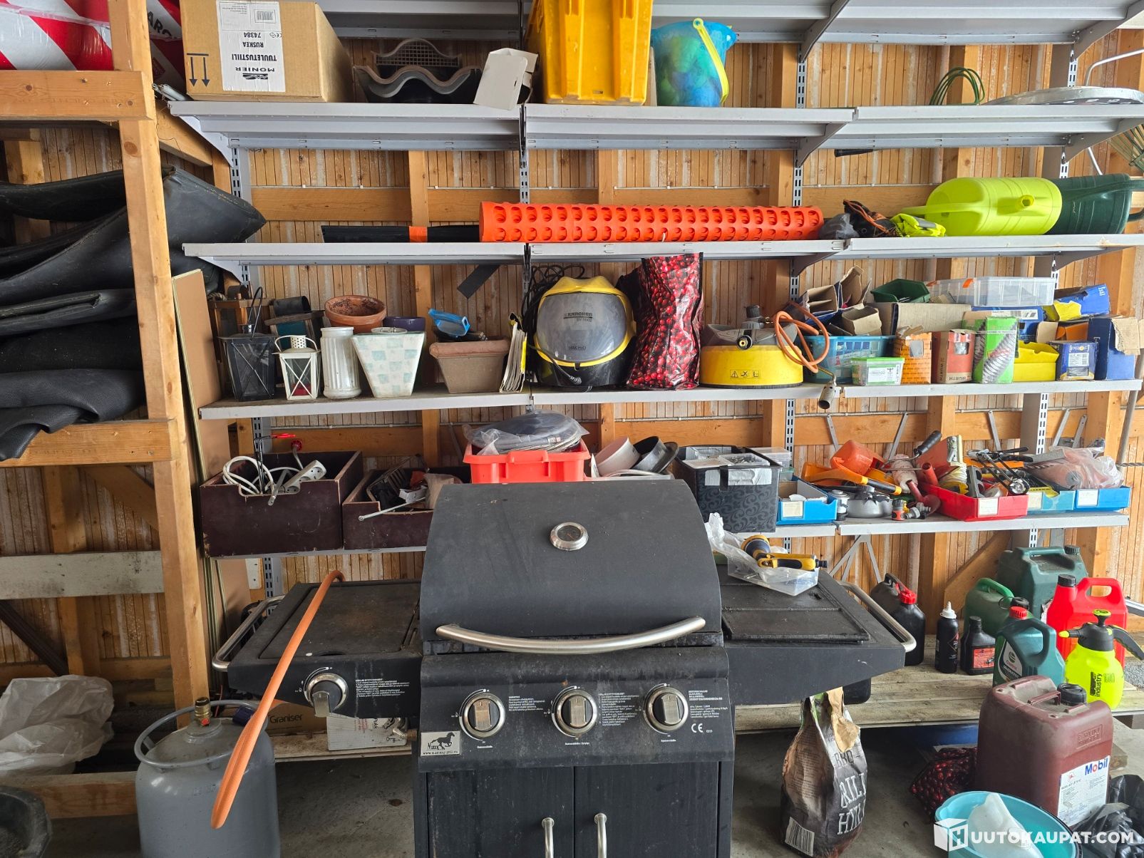Kaasugrilli Mustang, kaasupullo, pallogrilli, Kärcher SV 1802 höyrypuhdistin, polttoainekanistereita, liimapuristimia, laminaattileikkuri, kiinnitystarvikkeita yms. Katso kuvat.