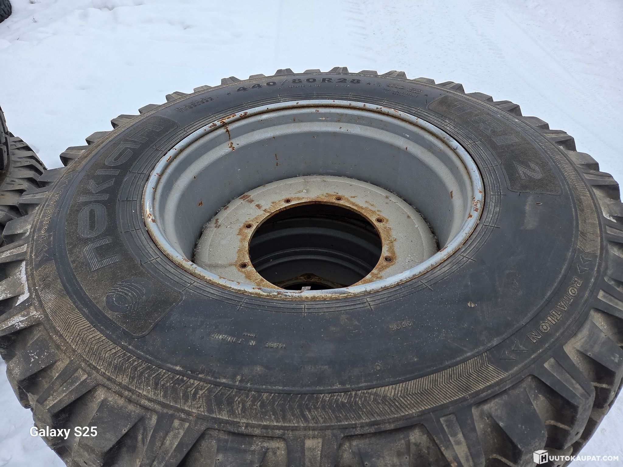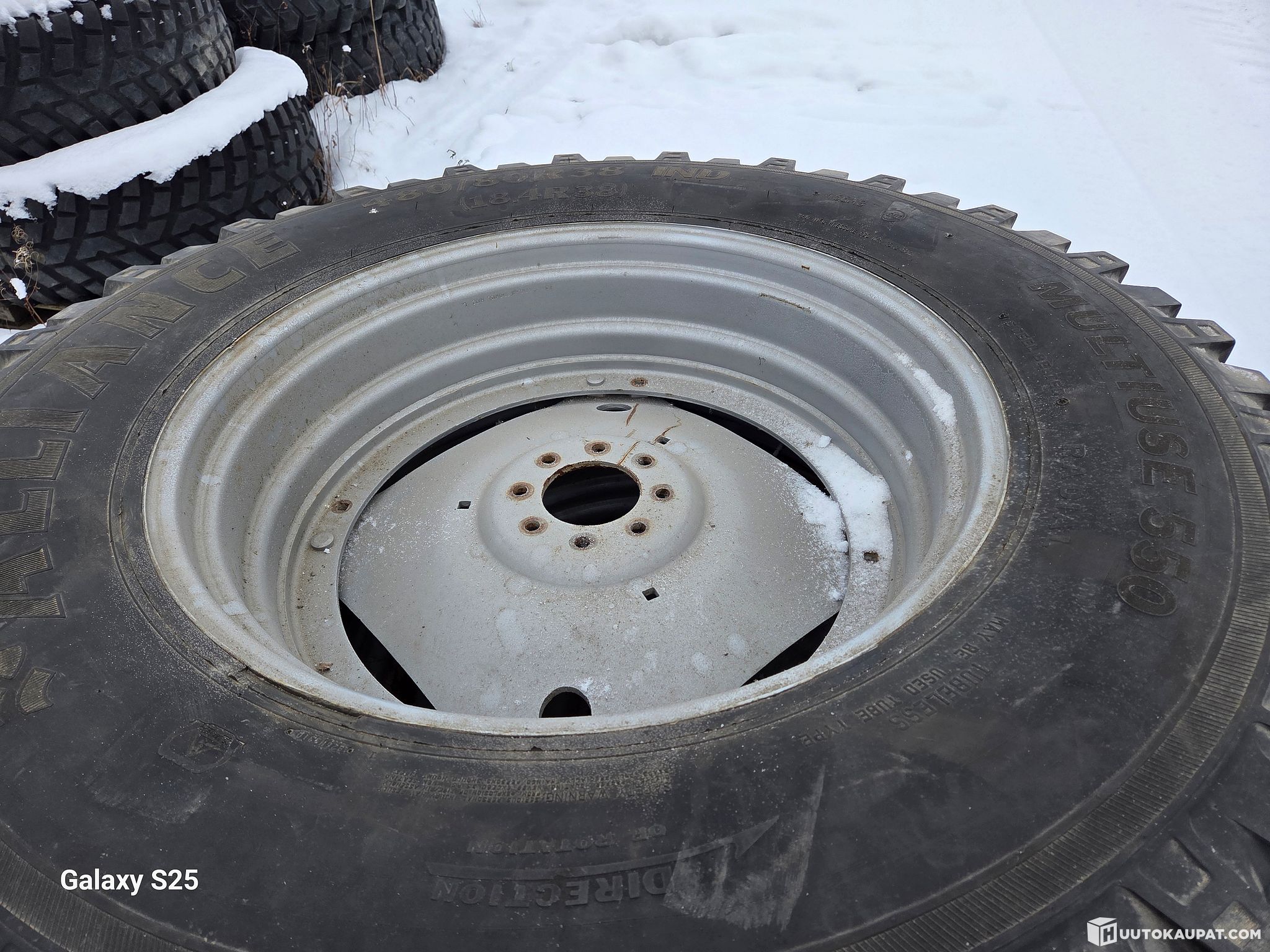 Käytetty palarengassarja casen vanteilla. Takarenkaat Alliance Multiuse 550 , 480/80R38. Eturenkaat Nokia TRI2, 440/80R28.