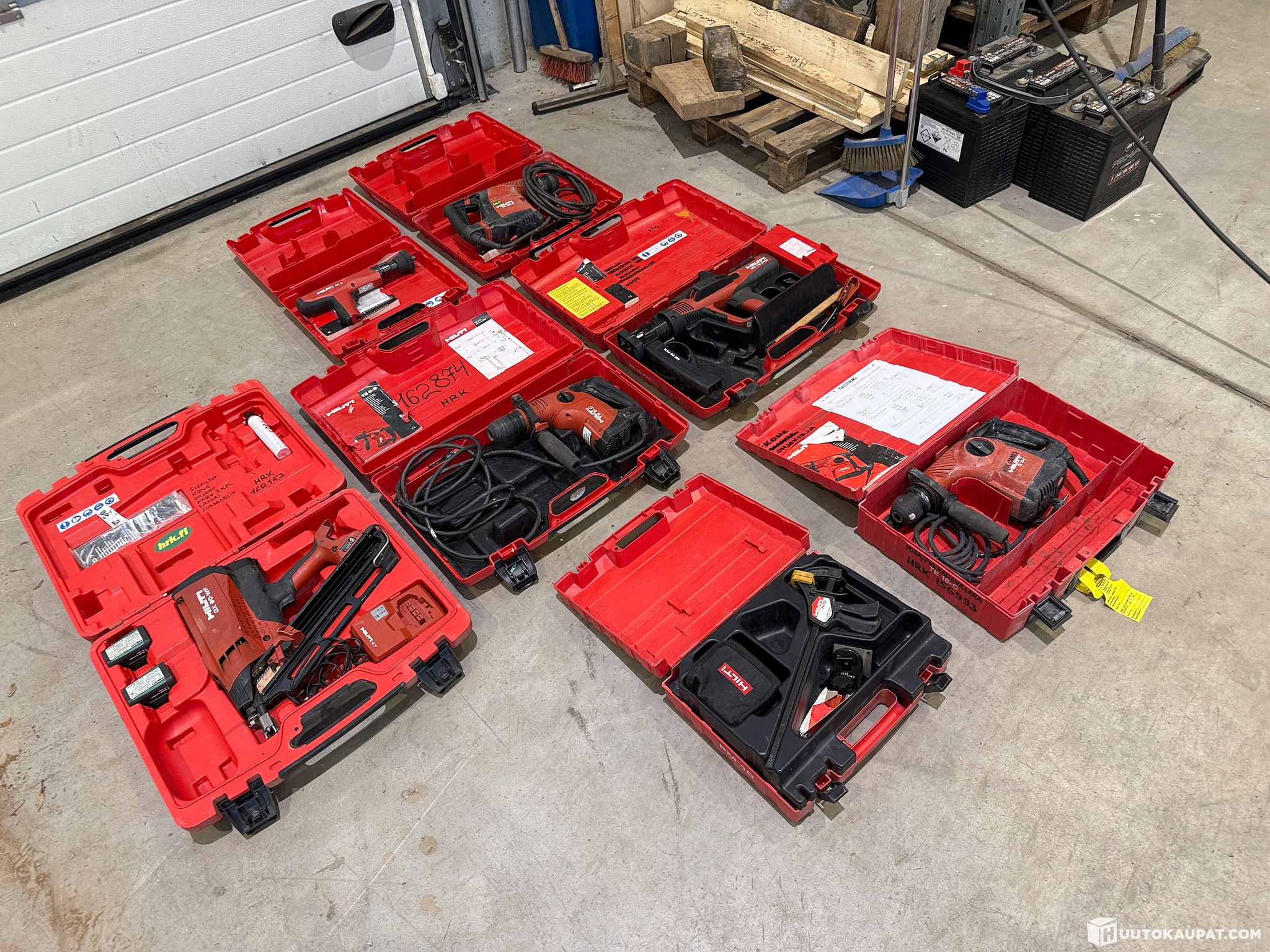 Vuokrakäytöstä poistettavia Hiltin työkaluja omissa salkuissaan: