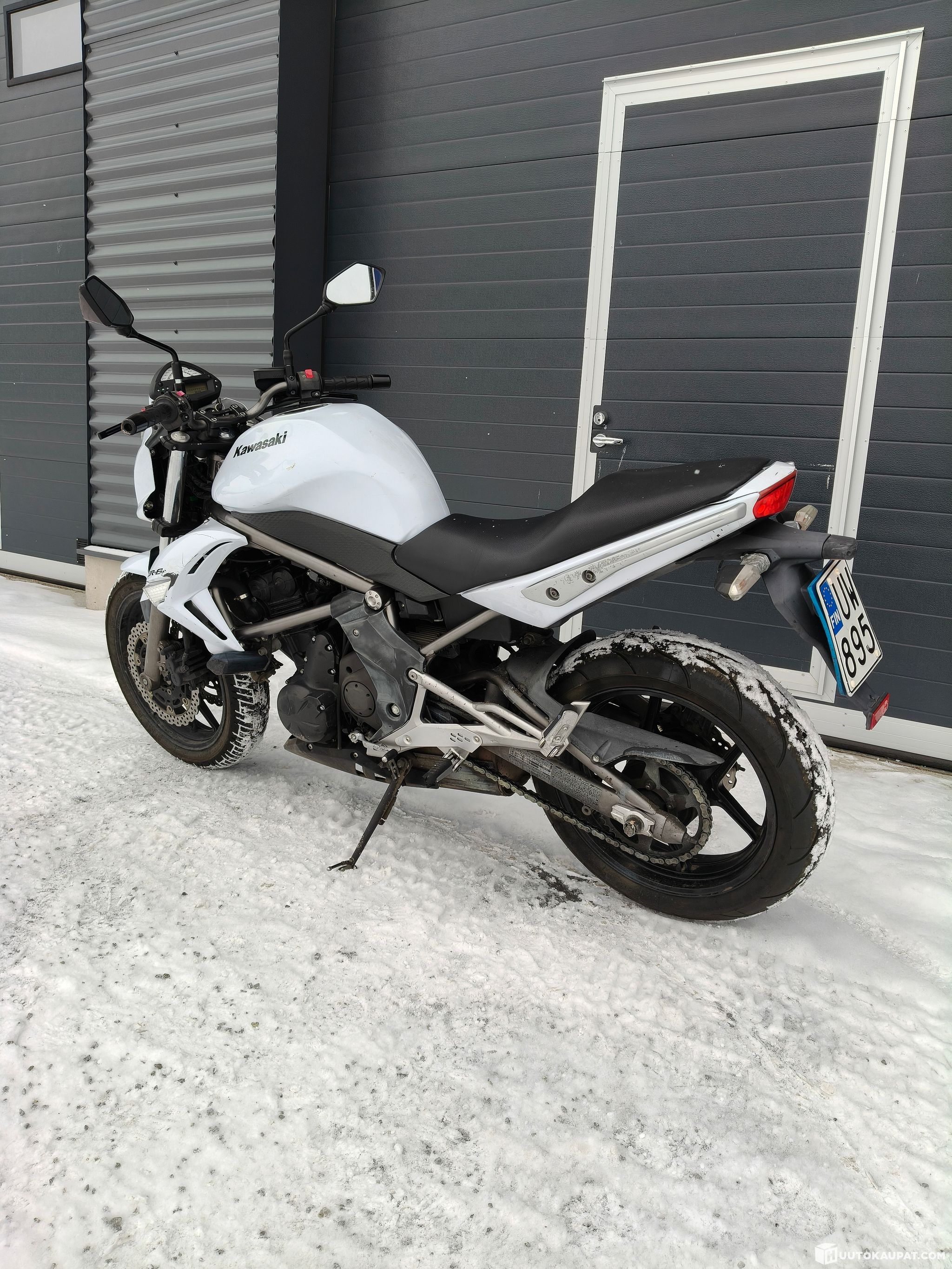 Opetuskäytöstä poistunut näppärä Kawasaki, johon kertynyt jo melko paljon harjoittelun jälkiä.