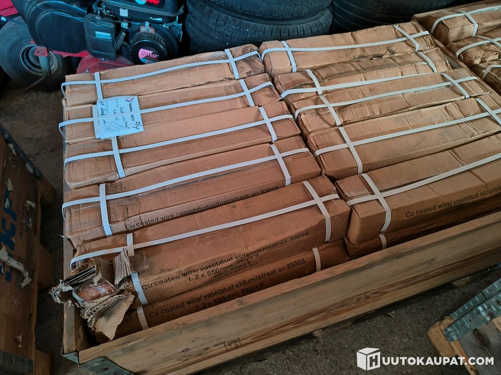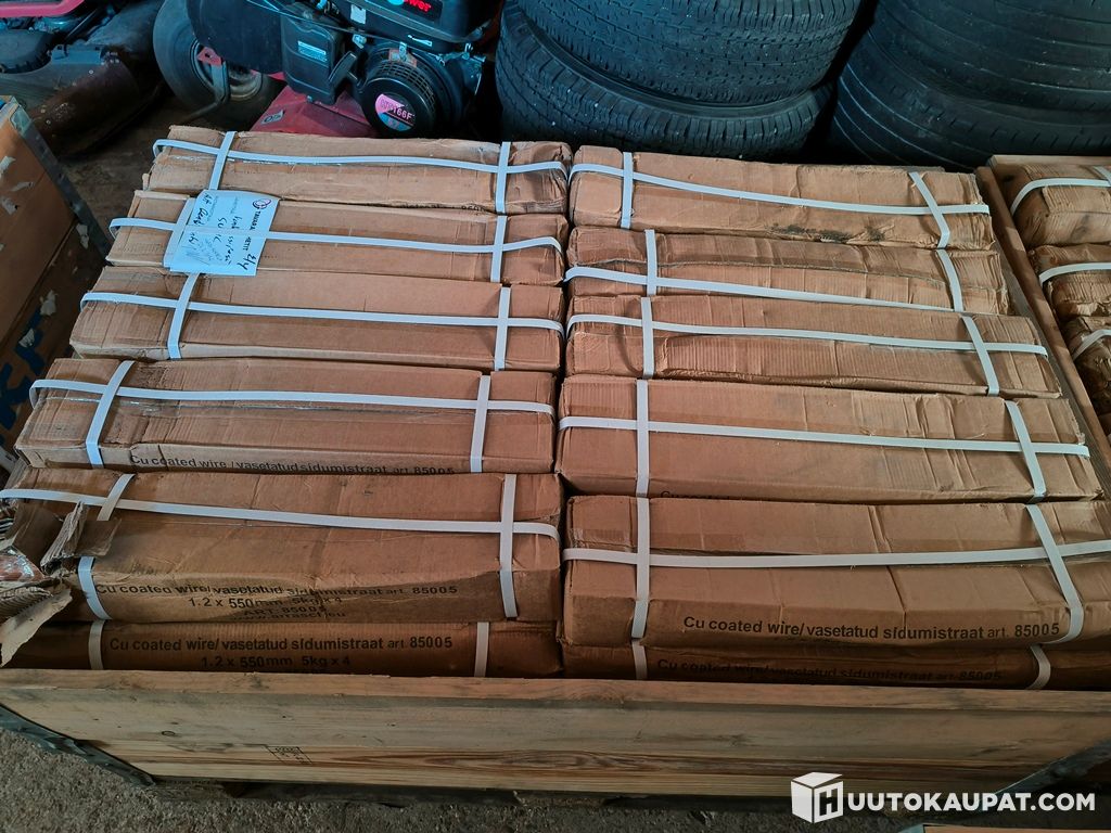 Kuparoitu sidontalanka 1,2 × 550 mm – suuri erä (n. 1200 kg). Kaupan hinta noin 5 € / kg eli lavan arvo yli 6000 €.