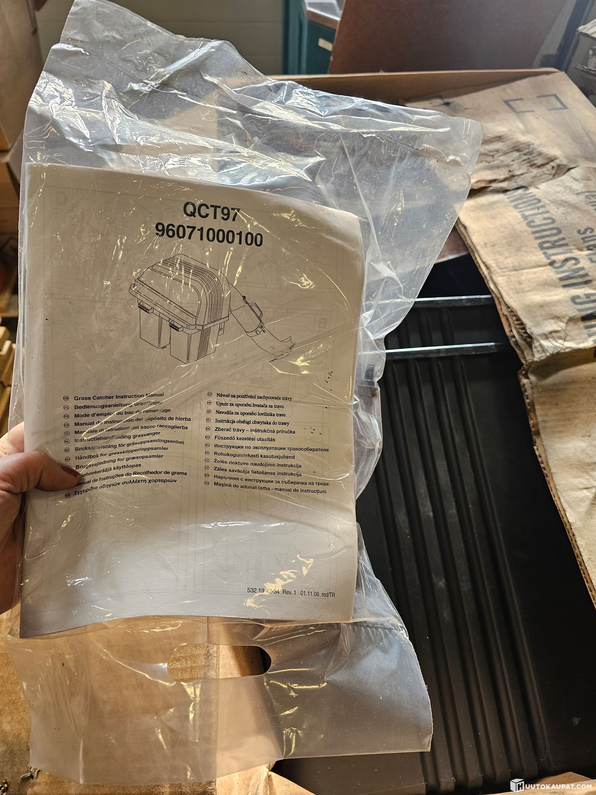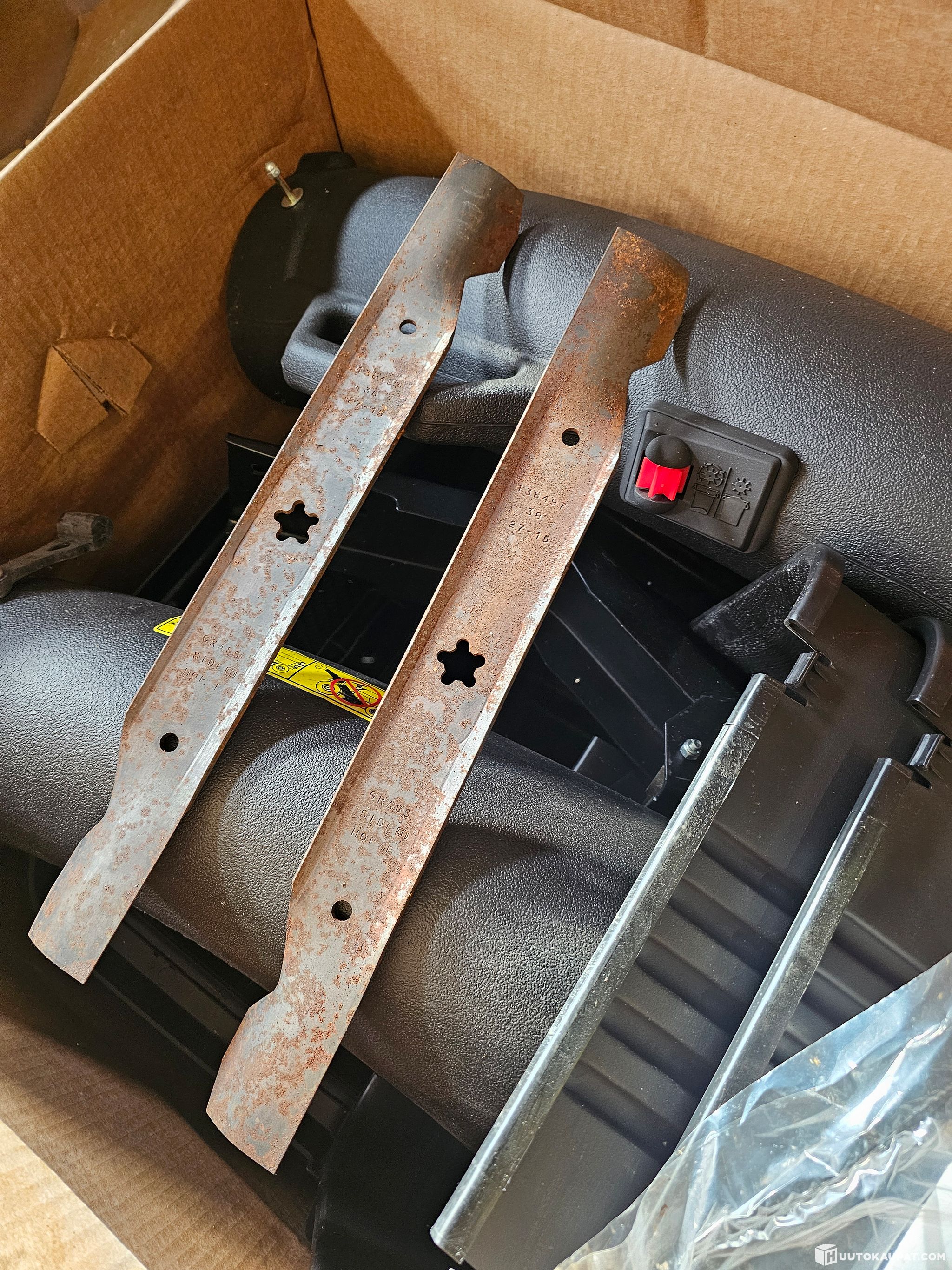 Varastossa vuosia ollut (terät ruosteessa, muuten kunnossa) ruohonkerääjä leikkuriin.