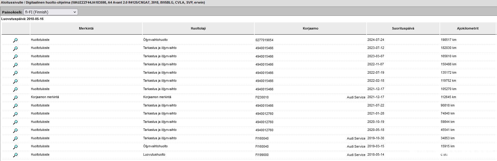 Viimeisin huolto tehty 215440km kohdalla 5 / 2025