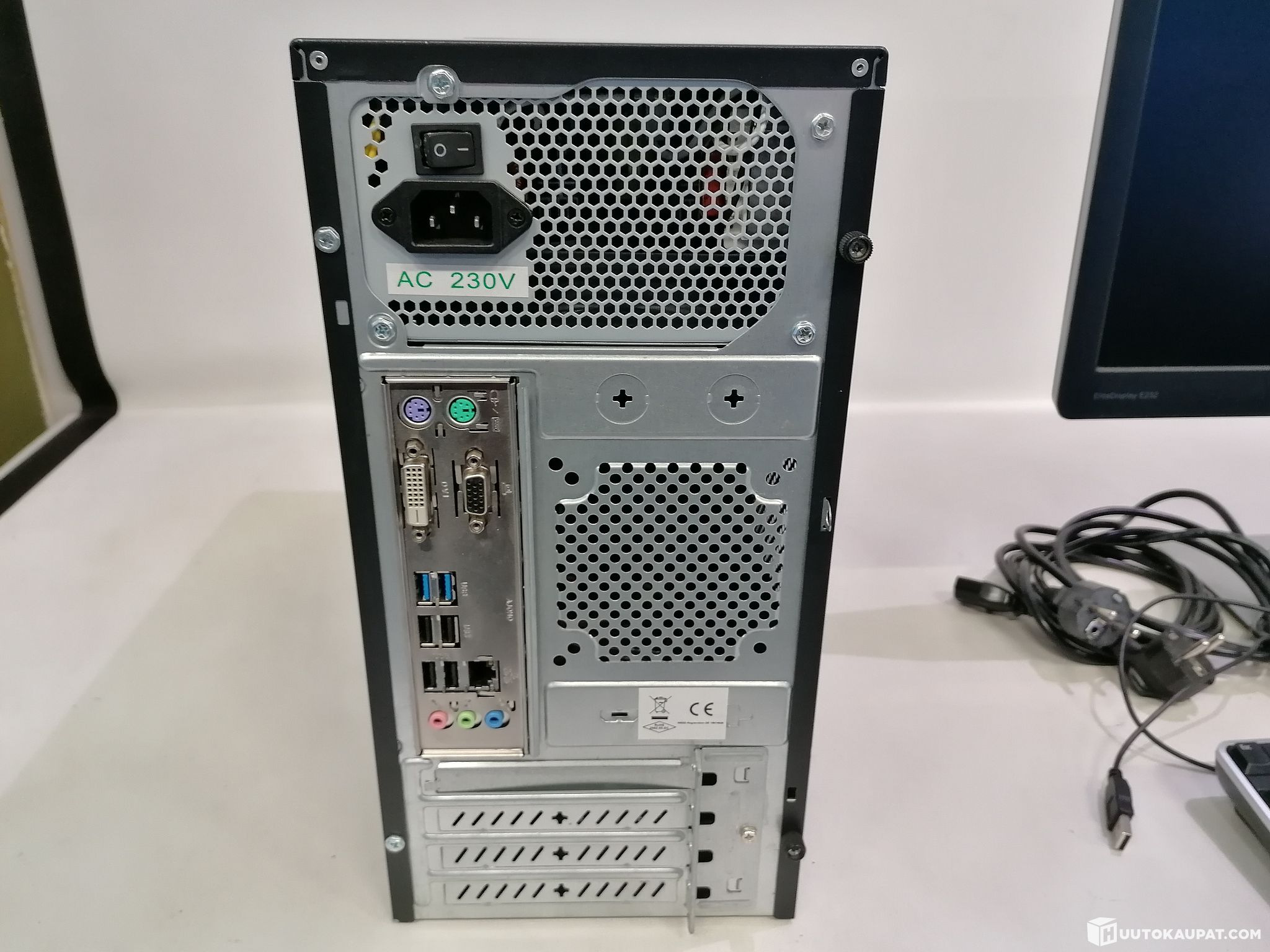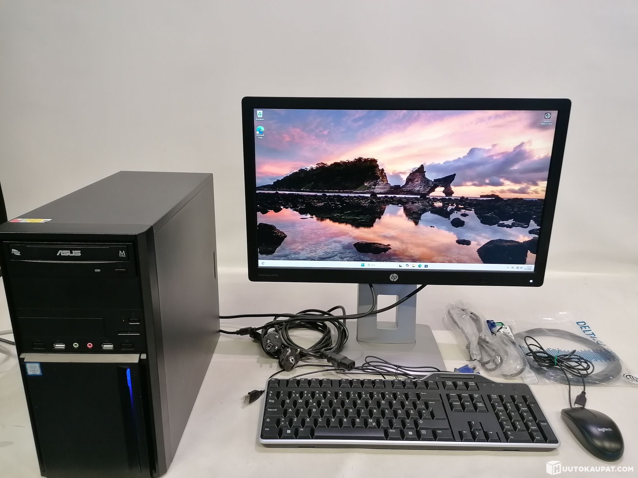 Mukana tulee HP yritysnäyttö Full HD alempana lisää tästä, hiiri, näppäimistö, virtajohto, VGA kaapeli ja ethernet kaapeli koneelle.