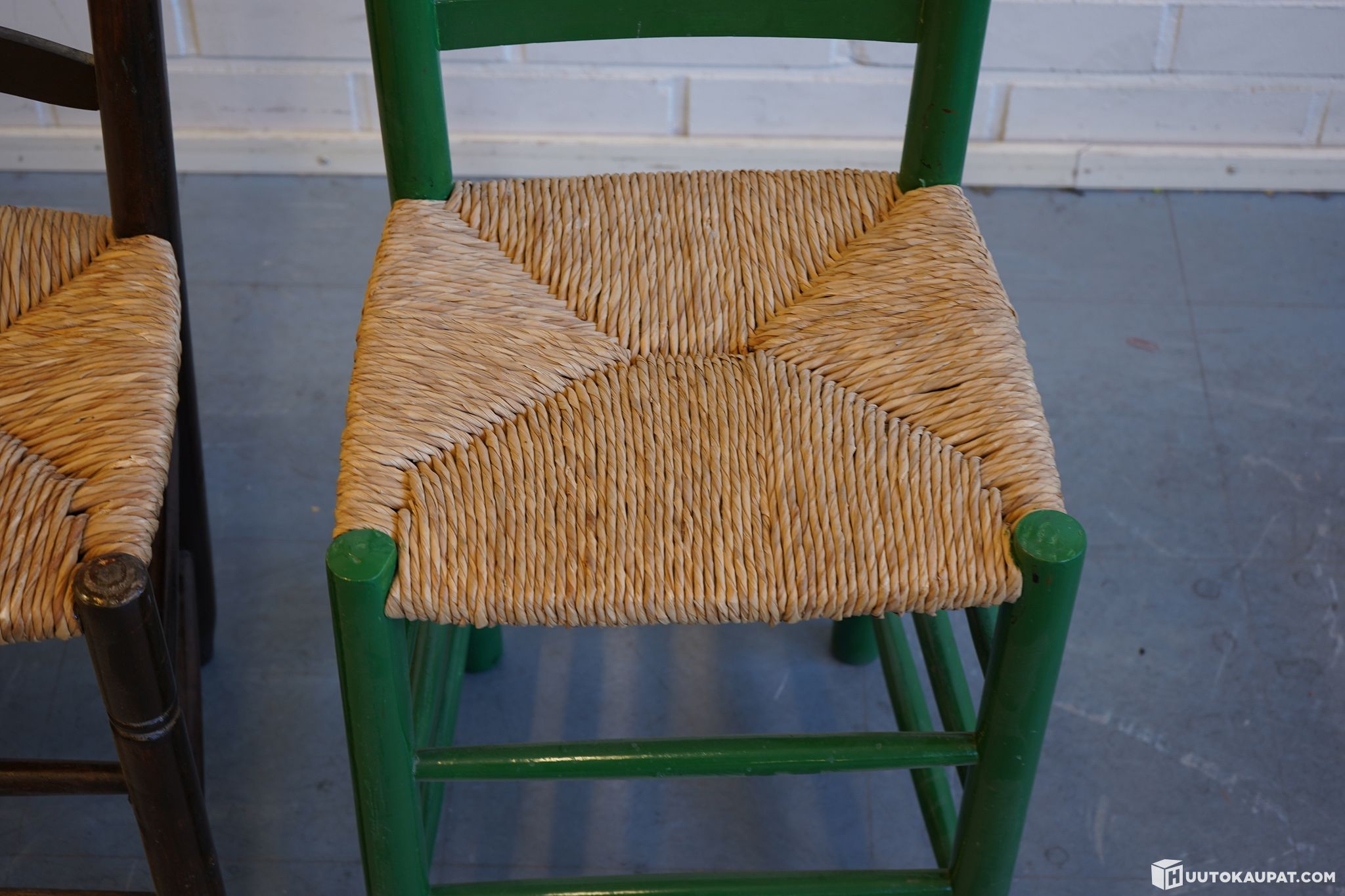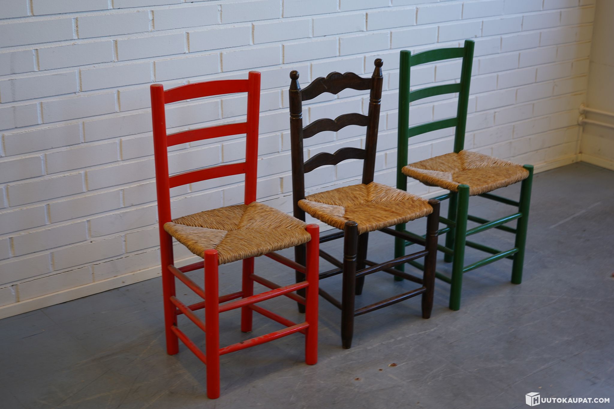 Myydään kolme kappaletta perinteisiä puutuoleja punotuilla istuimilla. Tuoleissa on klassinen ladder back -selkänoja ja luonnonmateriaalista punotut istuimet.