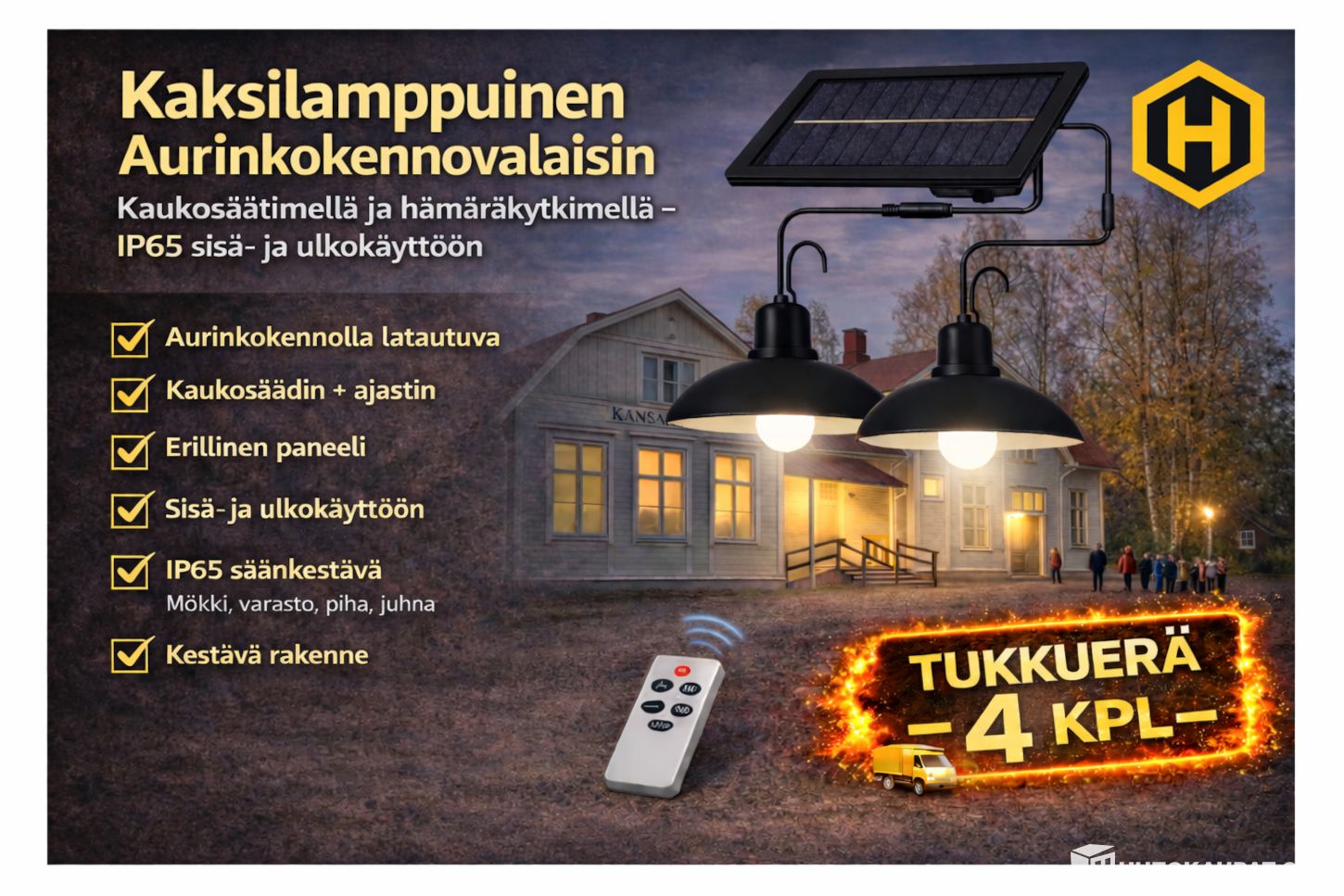 💡 PIKATUKKUERÄ:: 4 kpl Kaksilamppuista Aurinkokennovalaisinta Kaukosäätimellä ja Hämäräkytkimellä, Hämeenlinna