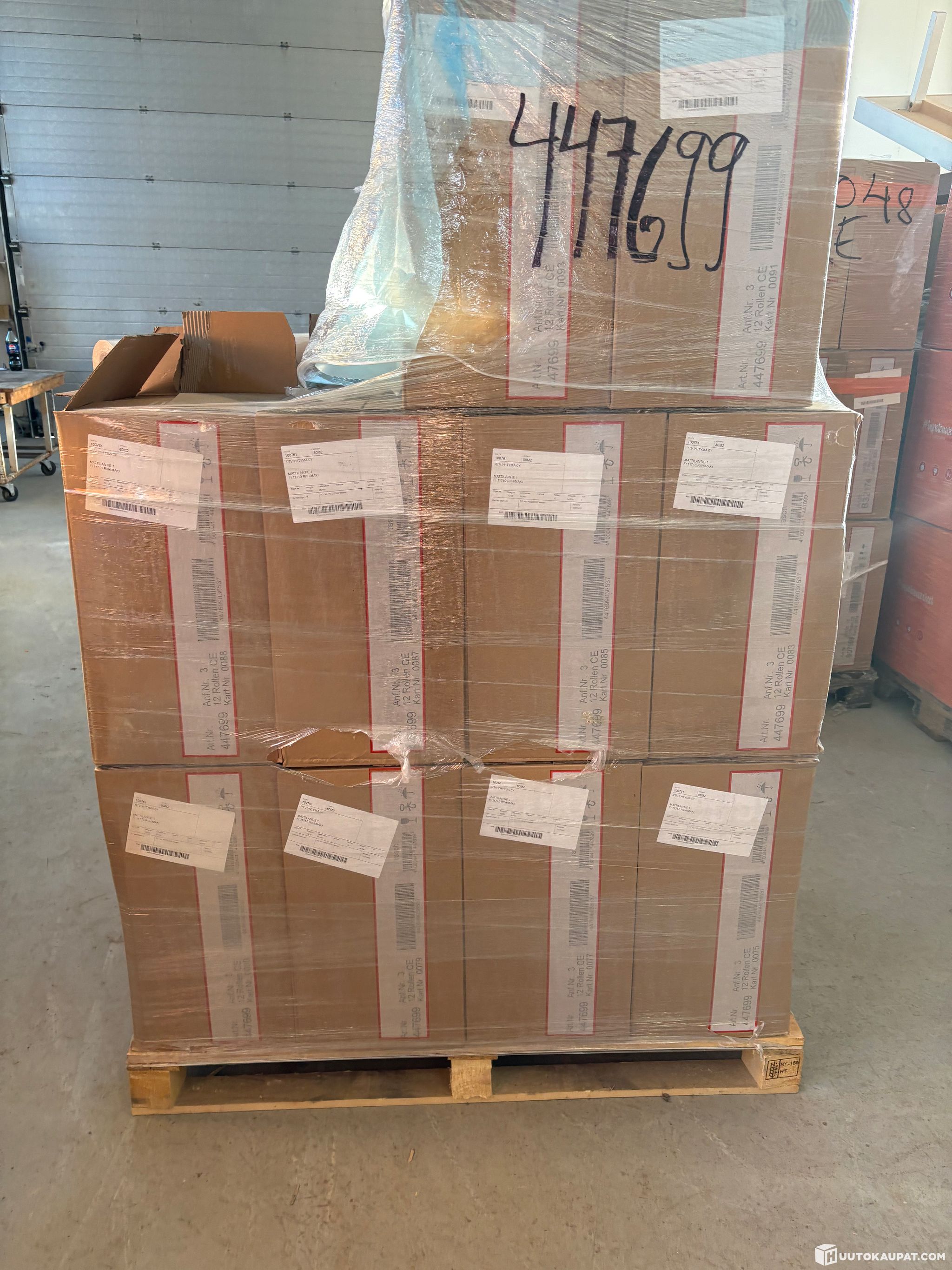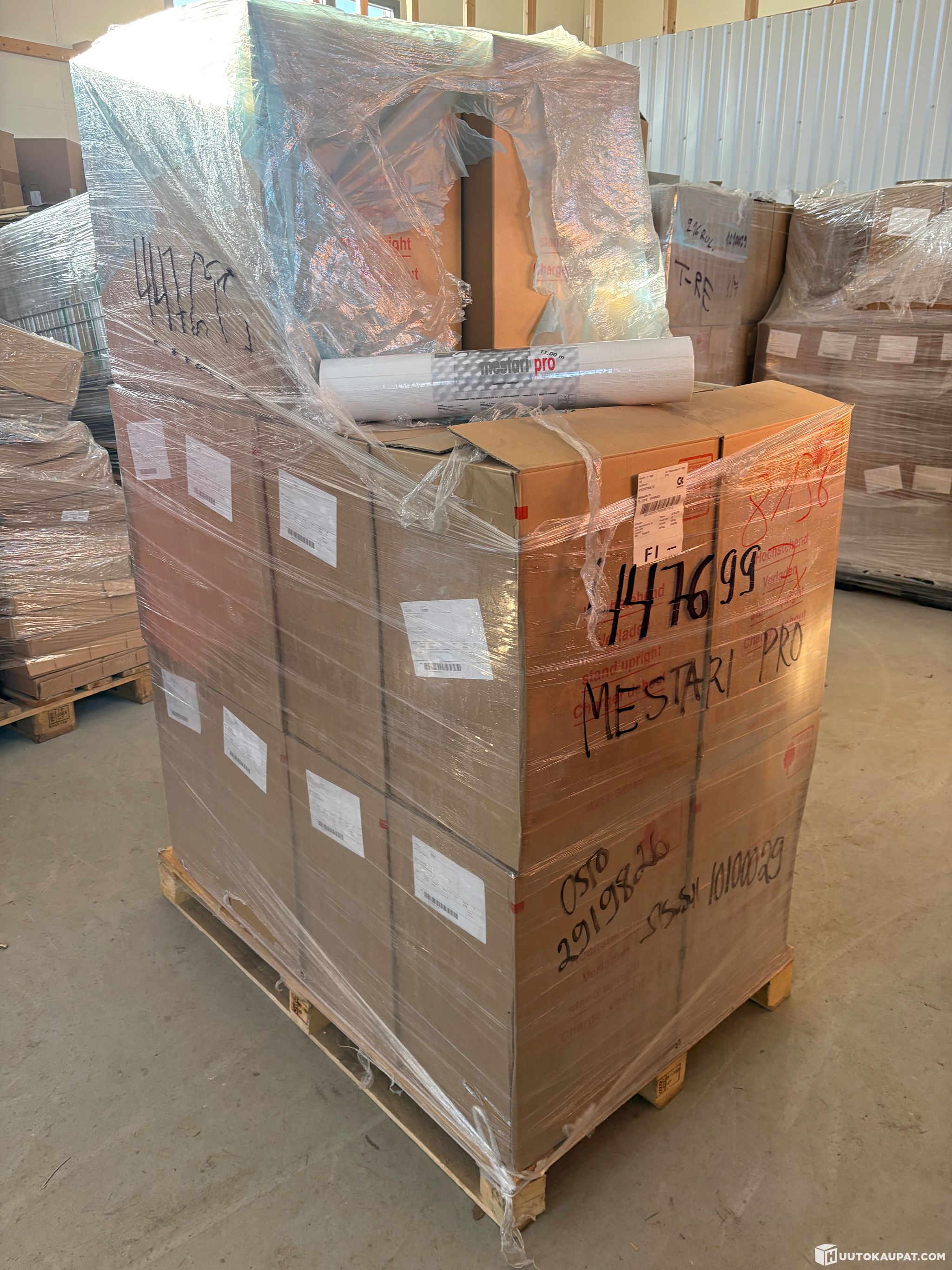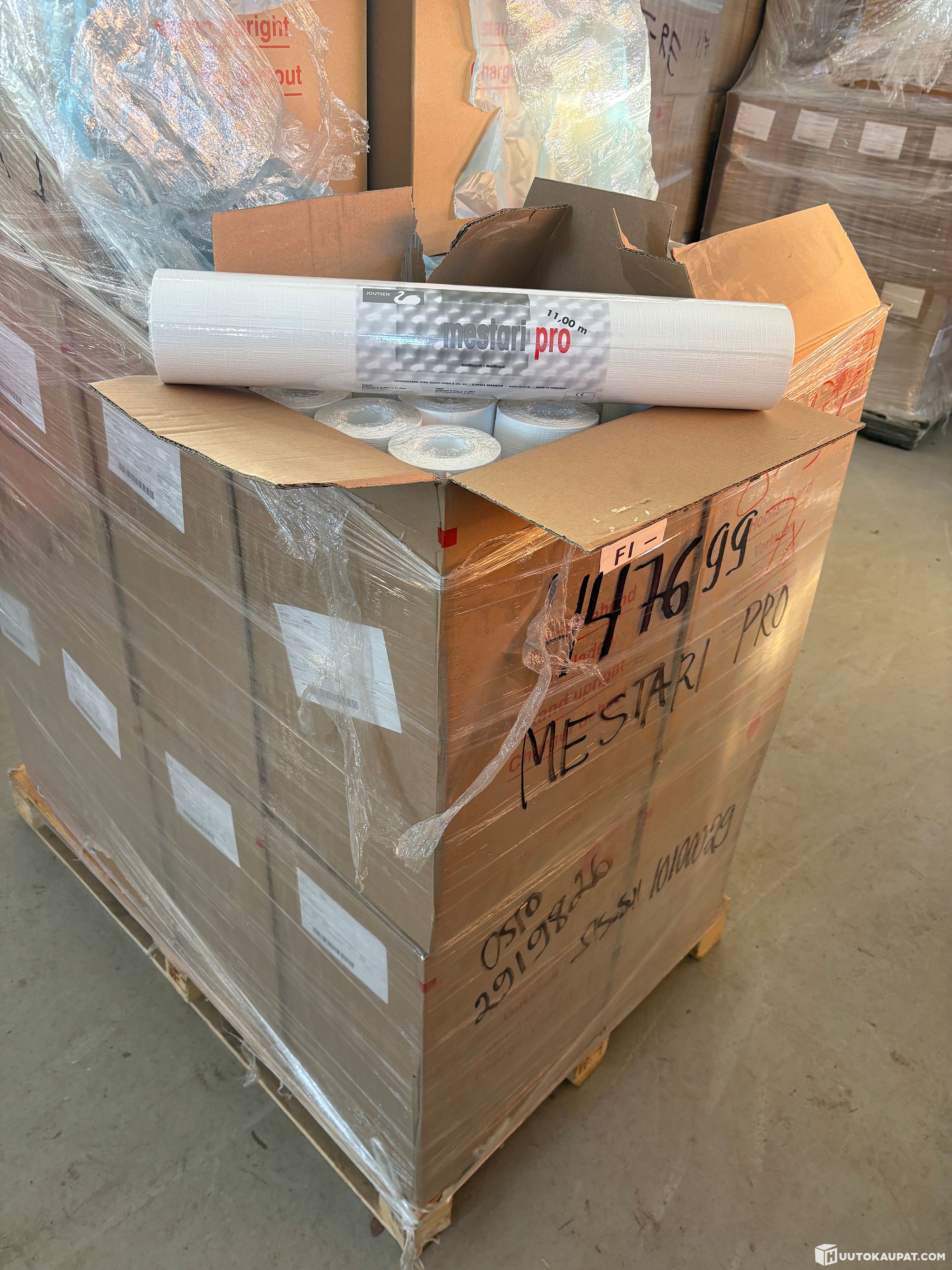 Siinä on 20 laatikkoa, jossa kaikissa on 12 rullaa uusia tapetteja. Tapetit on mestari Pro sarjaa useampaa eri kuosia lavalla.