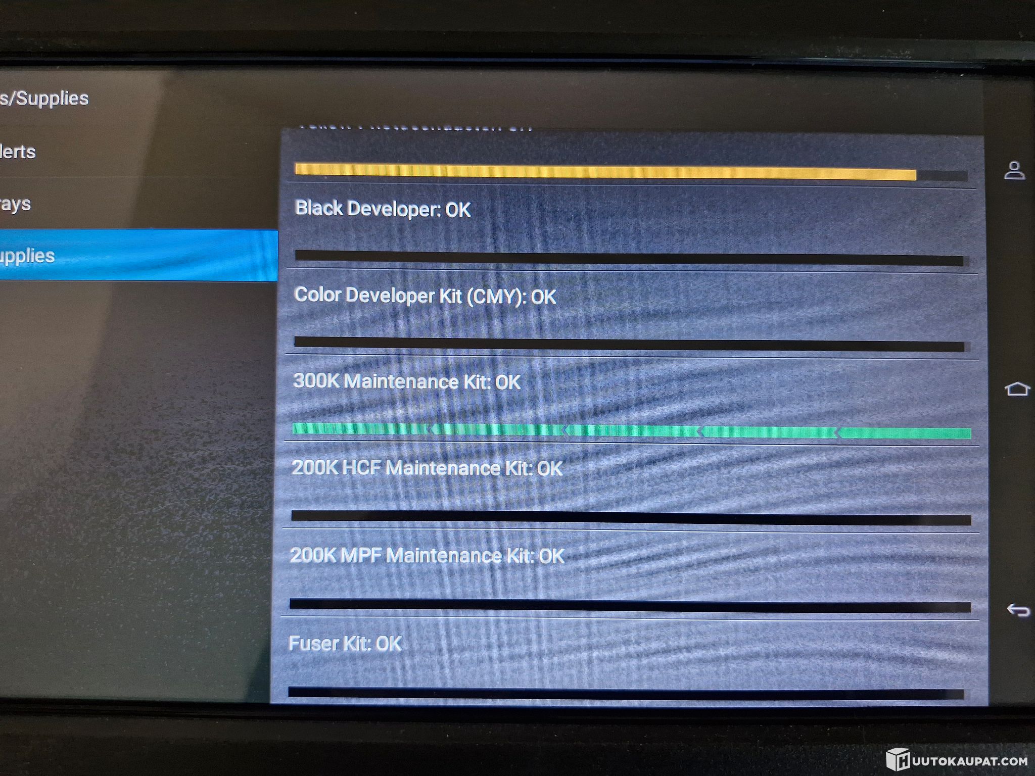 Laitteen omien aloituskasettien tilalle on vaihdettu suurikapasiteettiset värikasetit (34 000 sivua), kts. kuvat. Tarkemmat tiedot liitetiedosssa (25HAFA101_statistics.pdf).