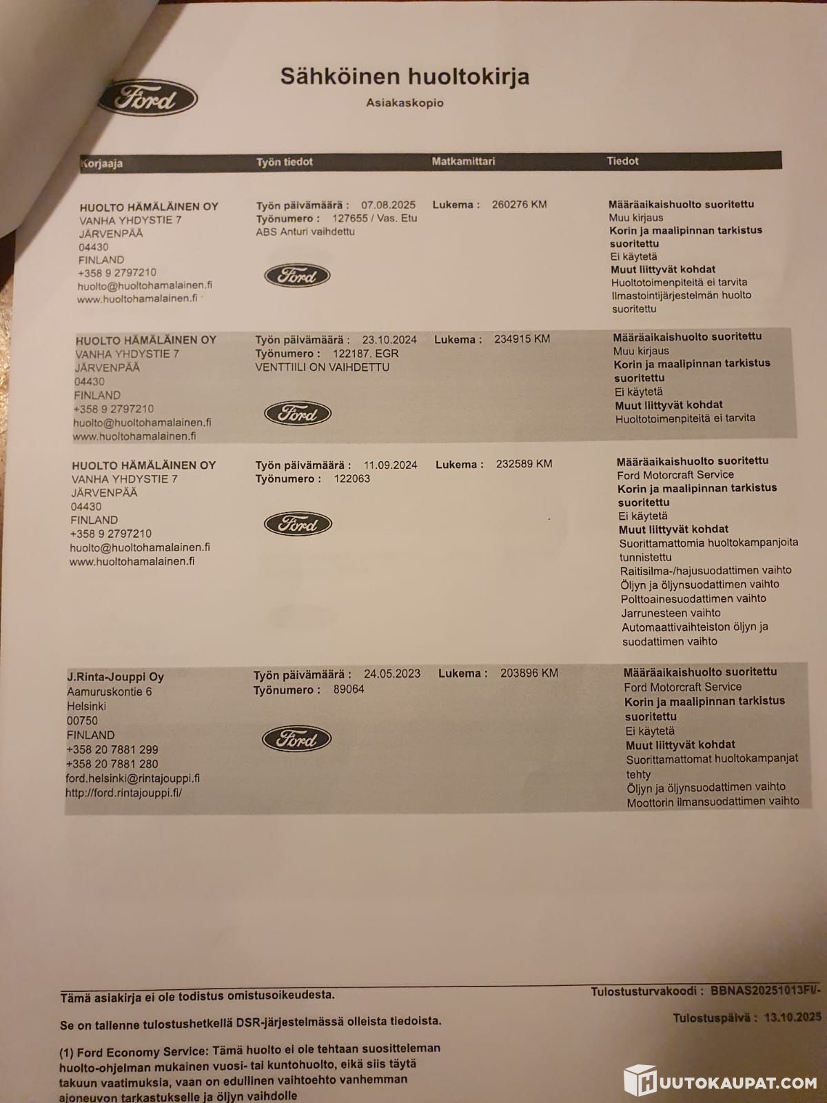 Kyllä, Täydellinen digitaalinen huoltoohjelma 12km - 26.01.2015 28tkm - 04.11.2015 59tkm - 20.12.2016 88tkm - 11.01.2028 119tkm - 21.03.2019 150tkm - 04.08.2020 196tkm - 23.12.2022 203tkm - 24.05.2023 232tkm - 11-09.2024 261tkm - 07.08.2025 264tkm - 13.10. 2025
