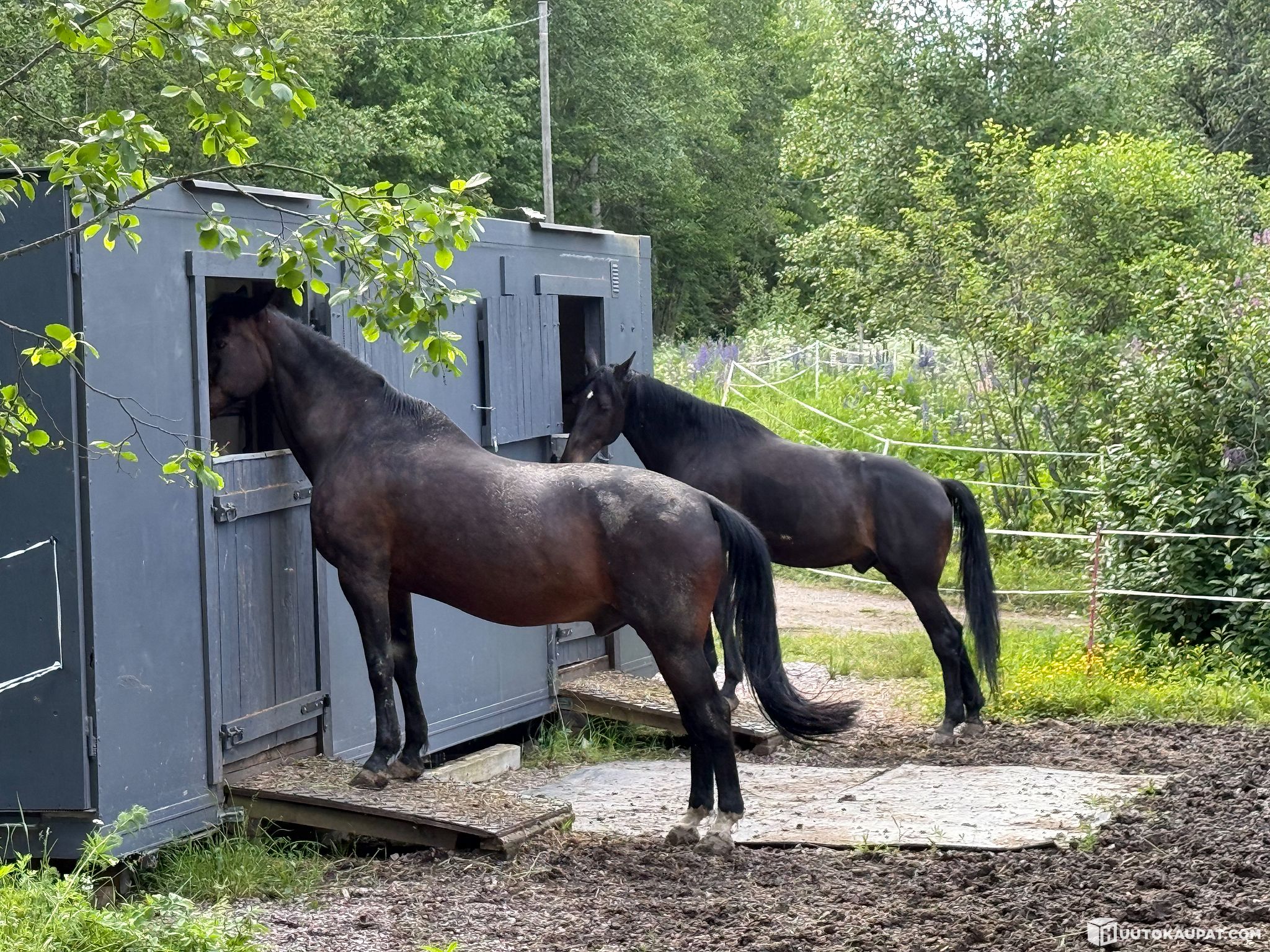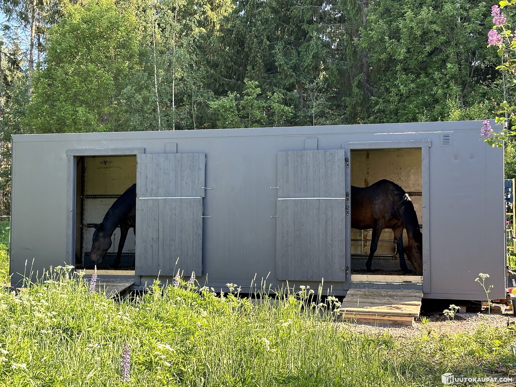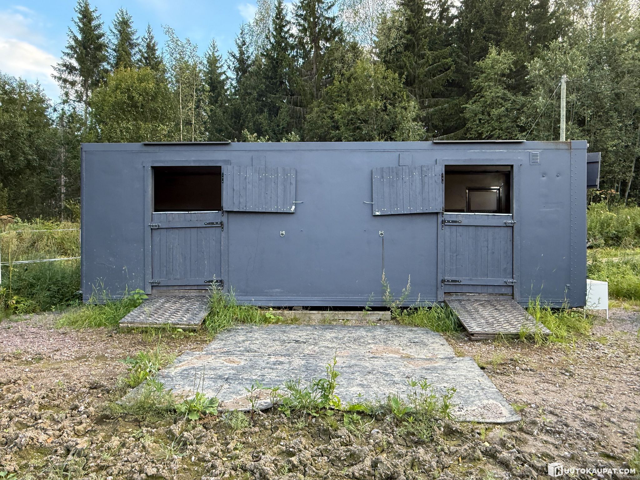 Kuorma-auton lämpöeristetystä kuormatilasta tehty siirtotalli kahdelle hevoselle. Pituus 8,2 m, leveys 2,4 m, korkeus 2,26 m. Eristetty paitsi ovet, kokonaan aukeava takaseinä ja ikkunan luukku. Eläintilan lattialla ja hevosten sisäänkäyntiluiskilla kumimatot, ei yhtenäinen kumimatto eläintilan lattialla. Hevosille kiinnipitorenkaat ulkoseinässä ulkopuolella ja sisäpuolella. Tilan jakava portti kuuluu hintaan. Katossa jokunen pultinreikä, jotka liimattu kiinni, vuotavat vähän, liimattava / tiivistettävä uudelleen. Nouto nosturi-autolla. Siirtotalli on puiden päällä, maasta irti.