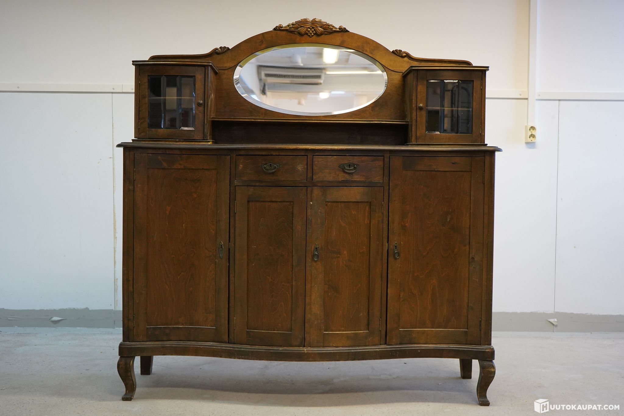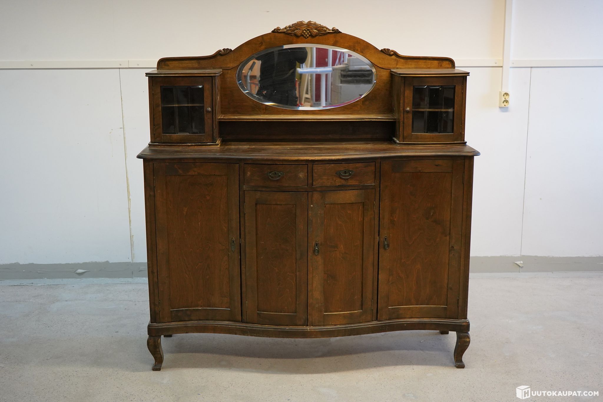 Tyylikäs ja näyttävä antiikkinen peililipasto 1900-luvun alkupuolelta. Lipastossa on kauniisti muotoiltu kaareva etuosa, koristeellinen puuleikkaus peilin yläosassa sekä molemmin puolin vitriinikaapit viistetyillä laseilla. Säilytystilaa tarjoavat kolme laatikkoa sekä tilavat kaapit hyllyillä.