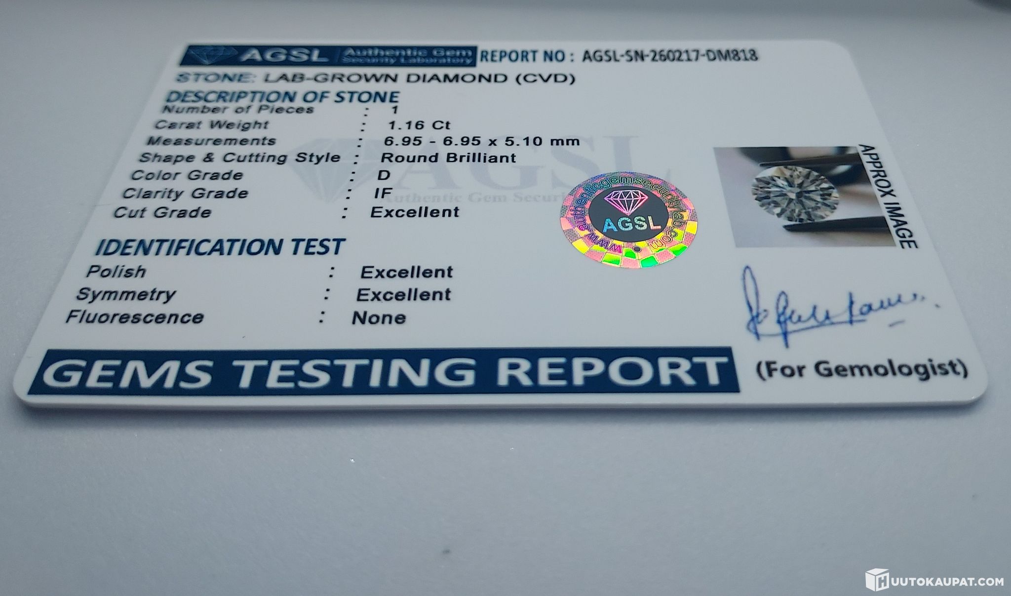 1,16 Karaatin Laboratoriossa kasvatettu timantti.