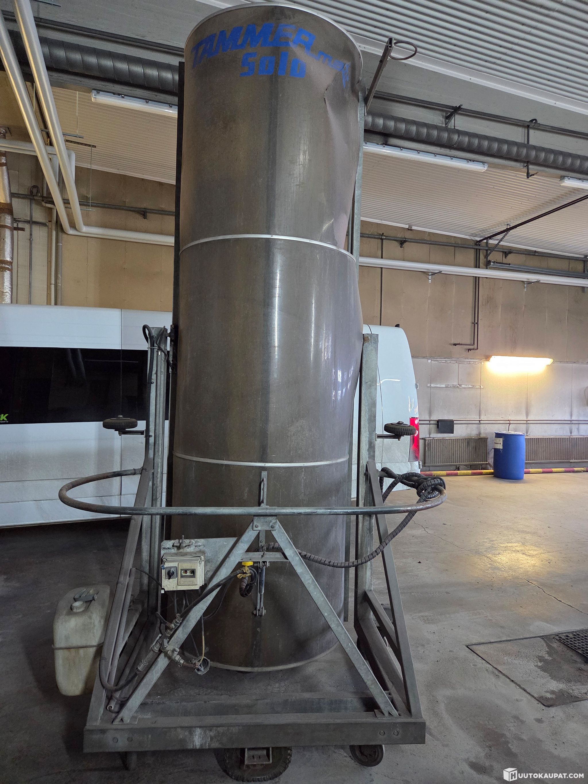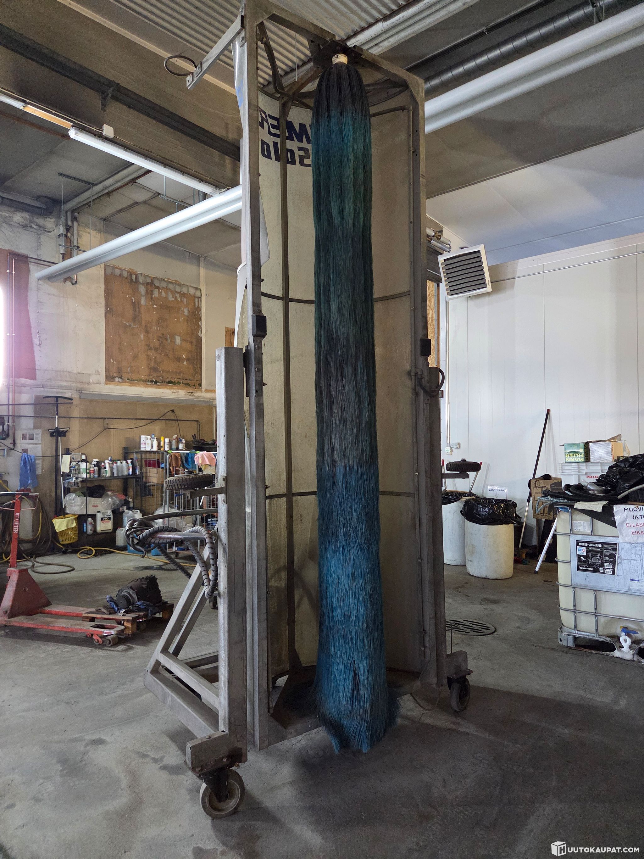 Käytetty talutettava pesuharjakone. Sumuttaa veden ja pesuaineen, toimivana käytöstä jäänyt sivuun. Renkaat ja letkut tarvii fixiä.