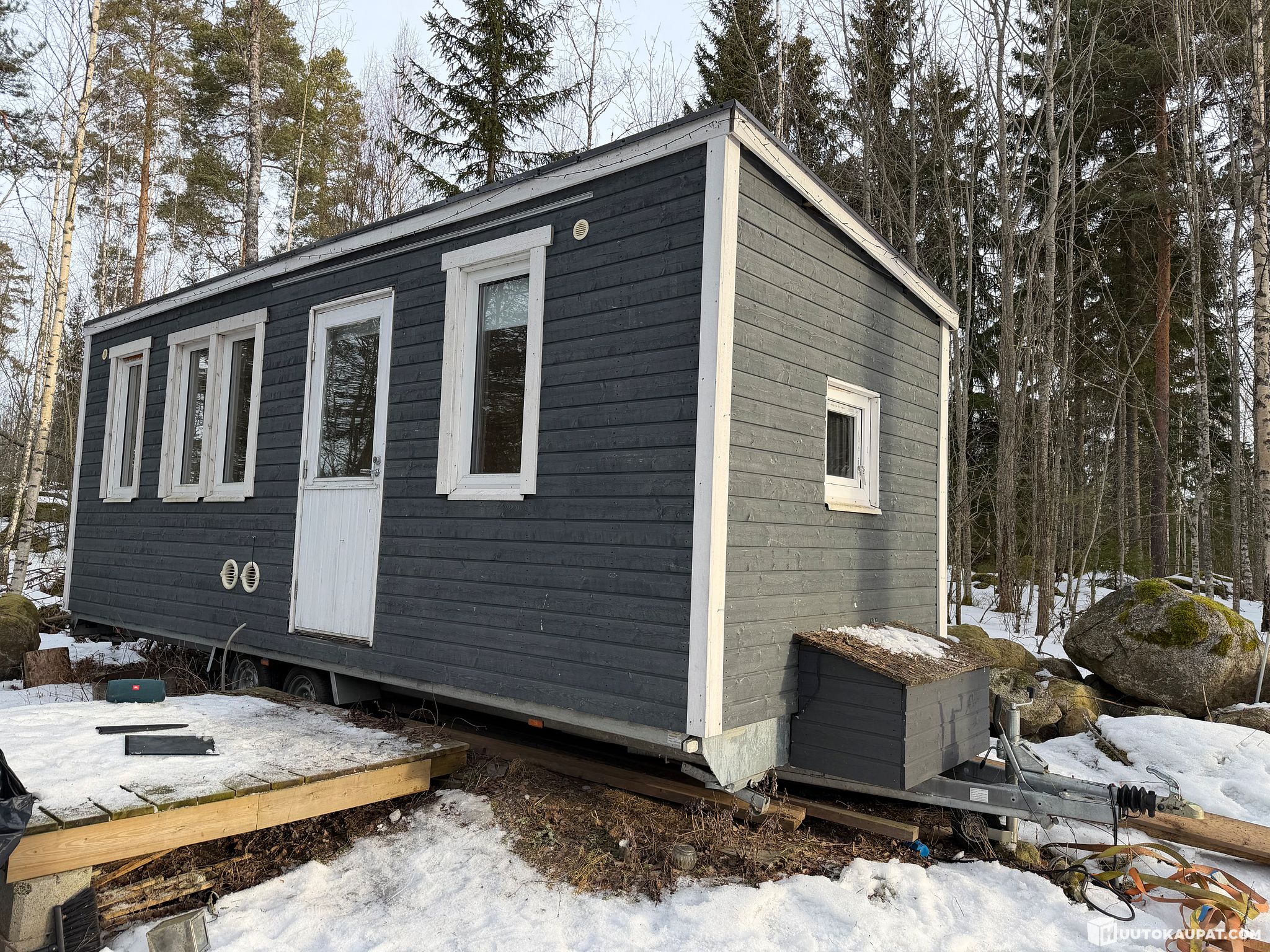 talo kiinnitetty kärryyn täkkipulteilla, suositeltavaa sitoa liinoilla siirron ajaksi