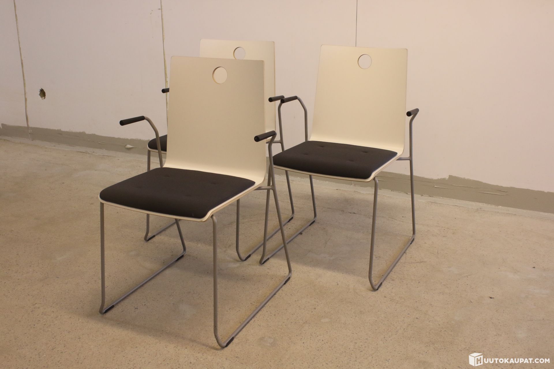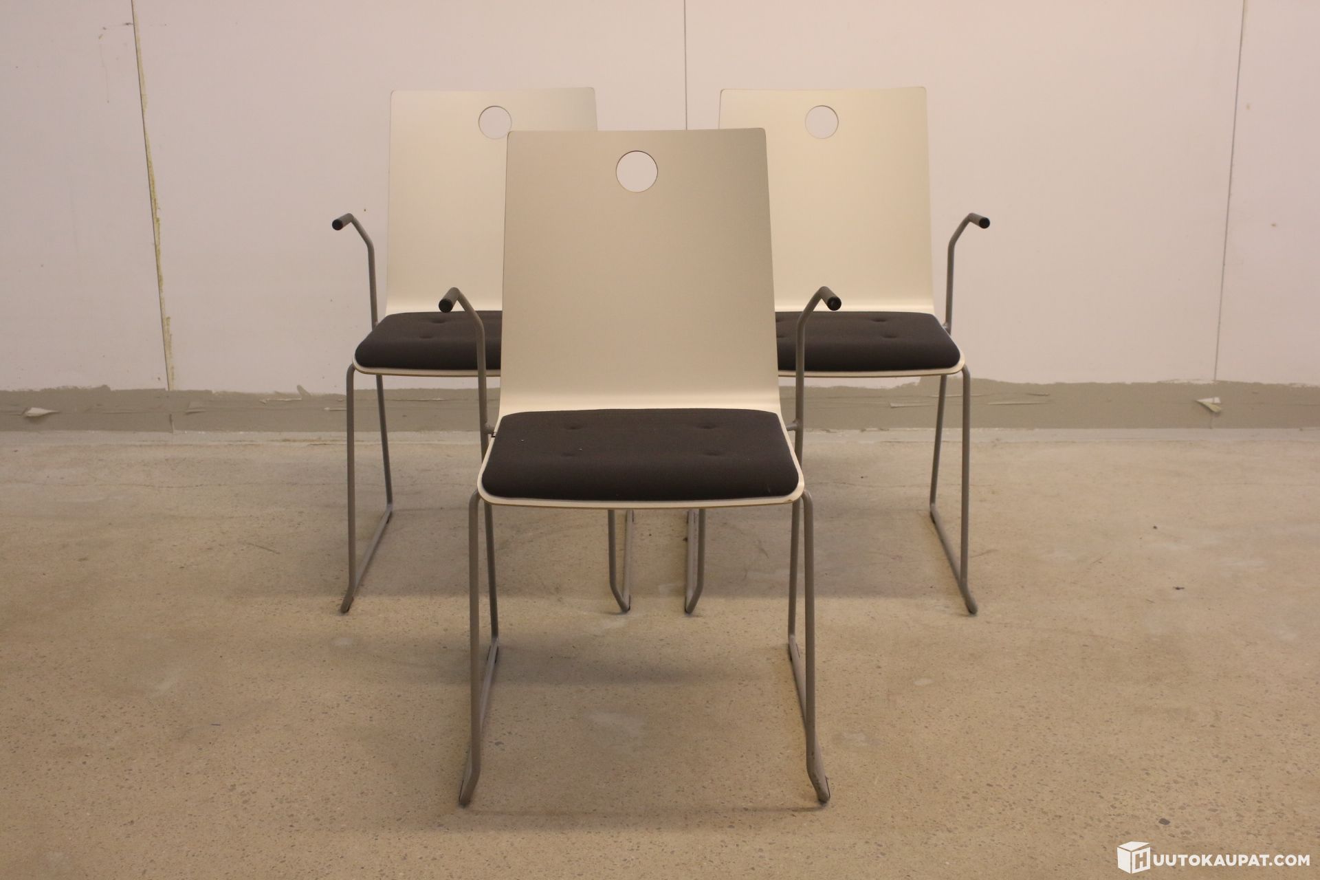 Kolme kappaletta Martelan asiakastuoleja mustalla kankaalla ja käsinojilla.