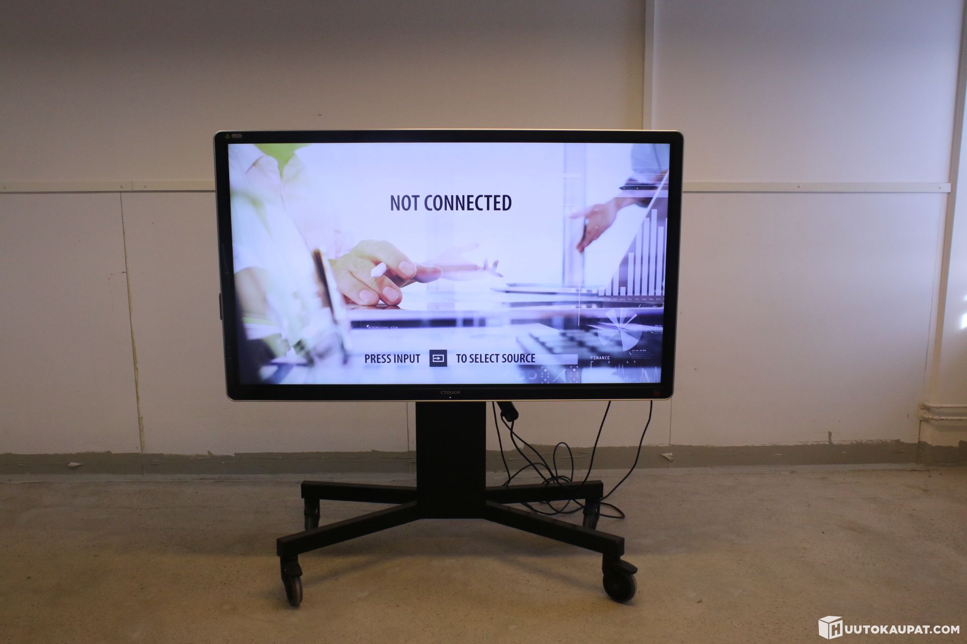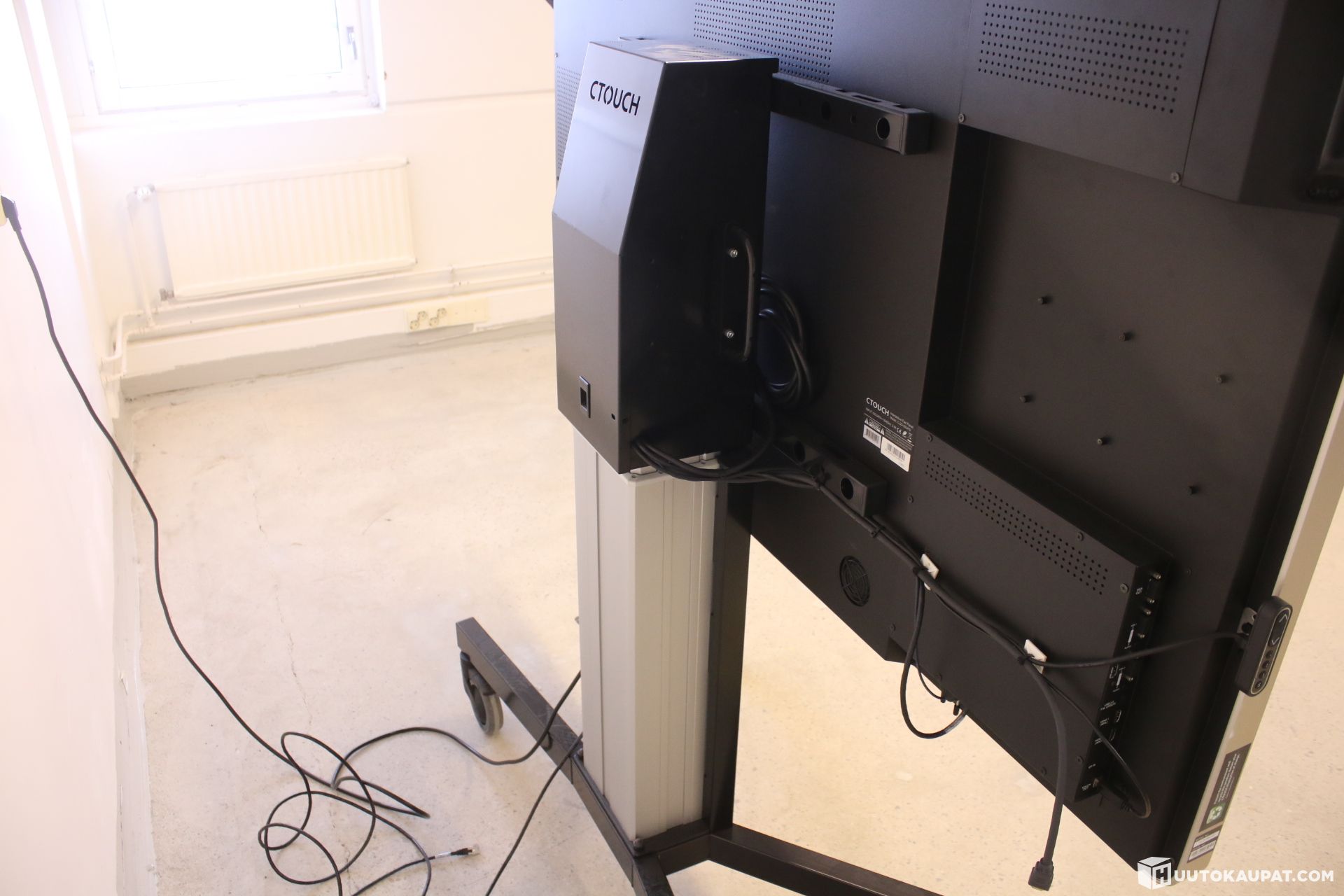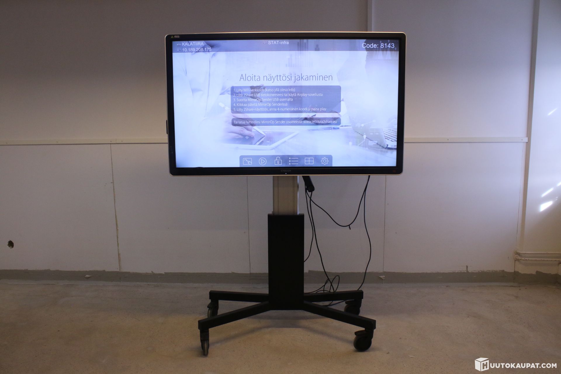 Tehokas ja näyttävä 65” kosketusnäyttö neuvotteluihin, koulutuksiin ja presentaatioihin. 4K-tarkkuus (1920x1080 asetuksissa), sisäänrakennettu USB-soitin sekä kosketuskynä mukana. Näyttö on asennettu tukevaan, sähkösäätöiseen lattiajalustaan (LINAK-nostomoottori), jossa lukittavat pyörät.