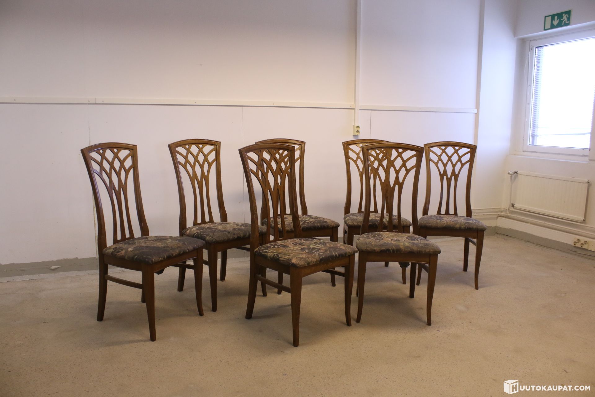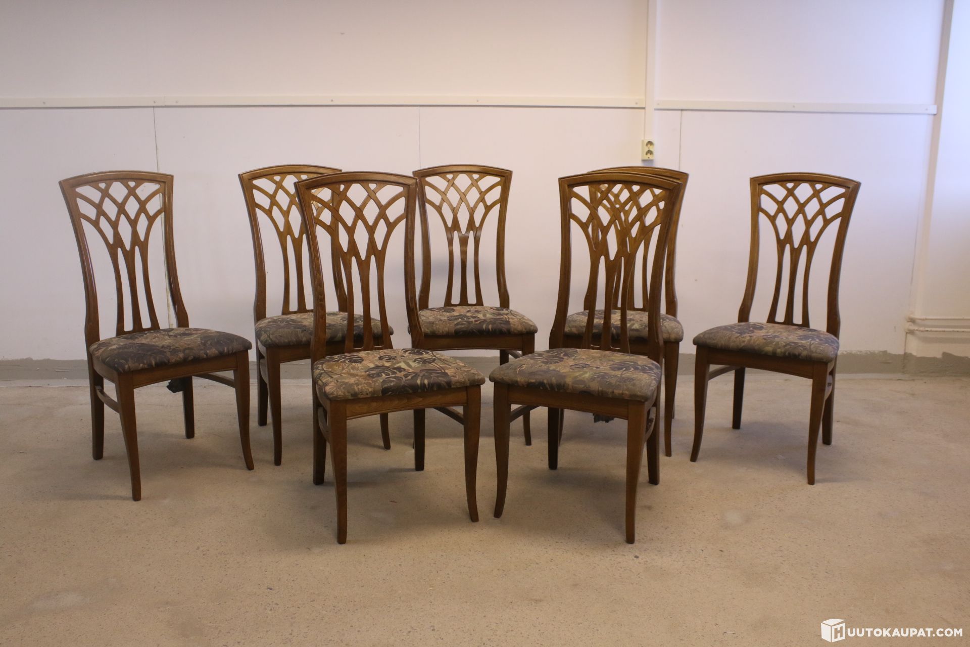 Seitsemän kappaletta hienoja puisia ruokailutuoleja kangaspäällysteillä. Tuolin nojat kruunaavat kokonaisuuden.
