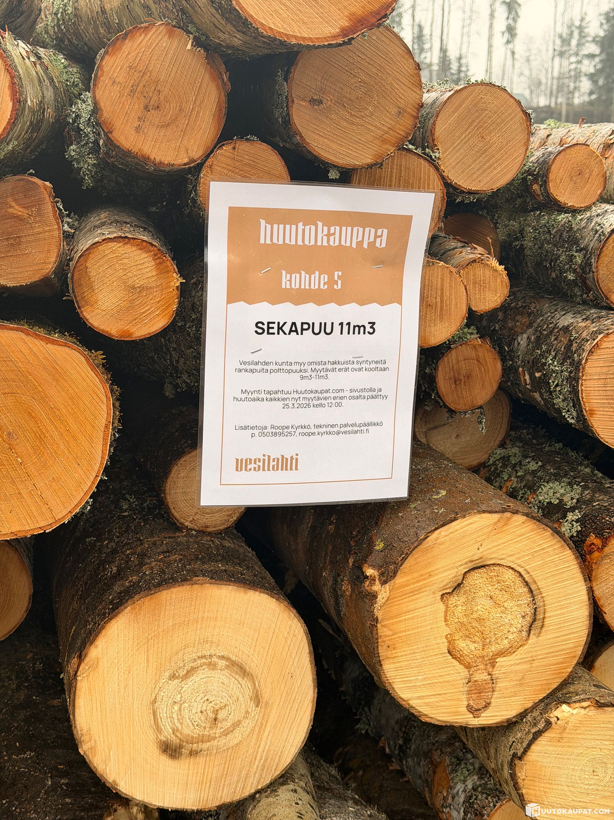 Vesilahden kunta myy omista hakkuista syntyneitä rankapuita polttopuuksi. Myynti tapahtuu Huutokaupat.com - sivustolla ja huutoaika kaikkien nyt myytävien erien osalta päättyy 25.3.2026 kello 12:00.