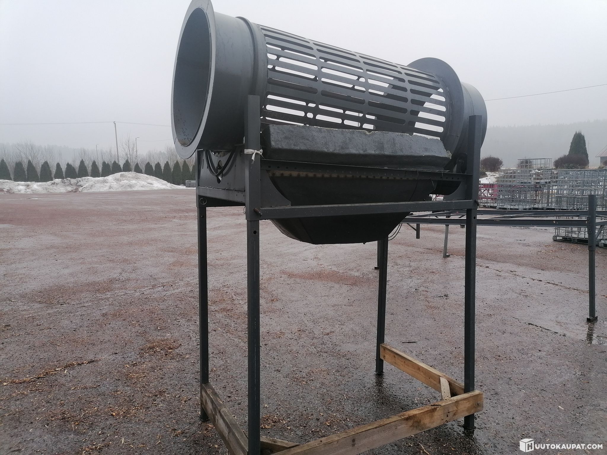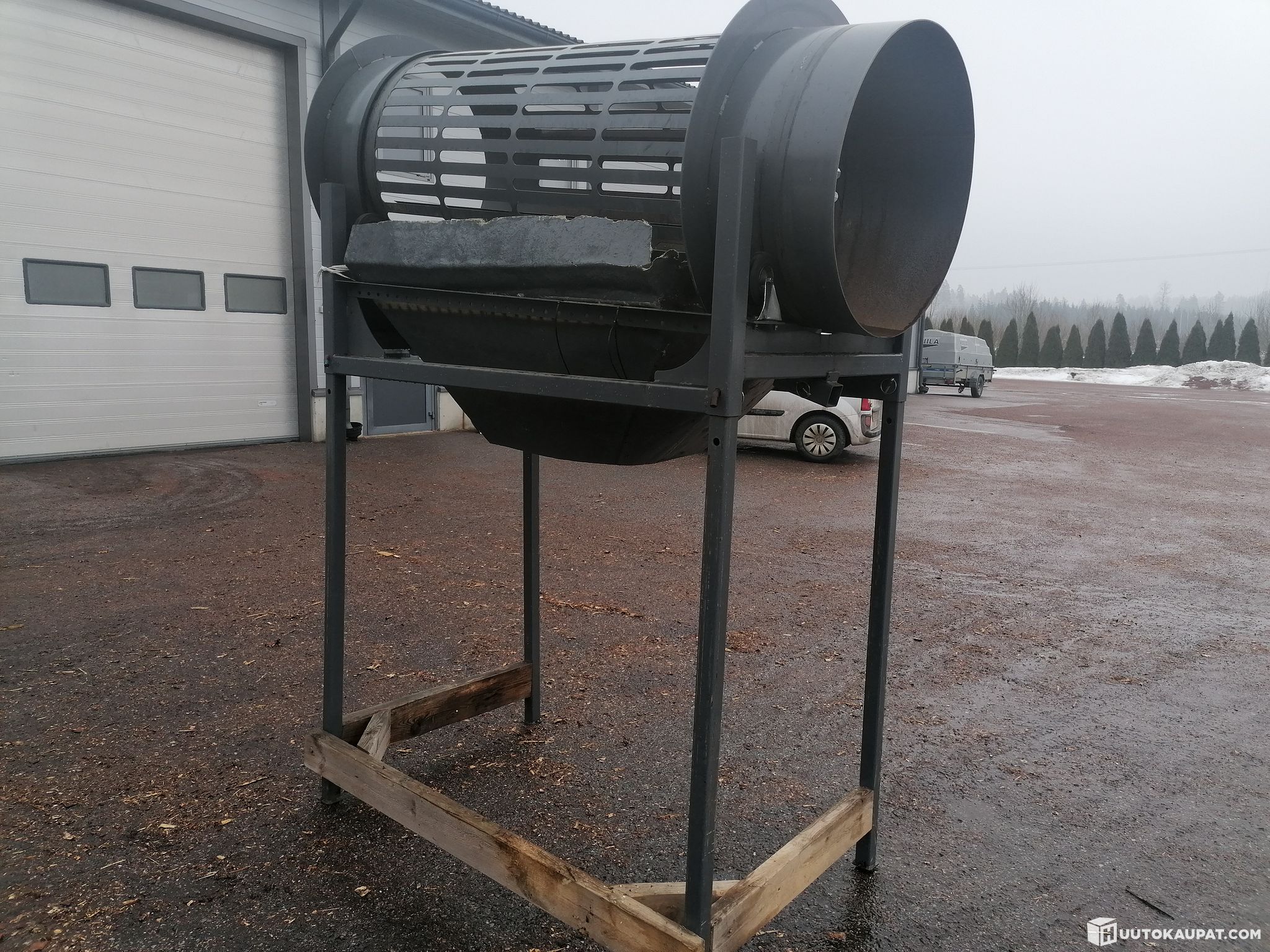 Polttopuiden puhdistusrumpu. Moottori uupuu, hihna kuuluu mukaan.