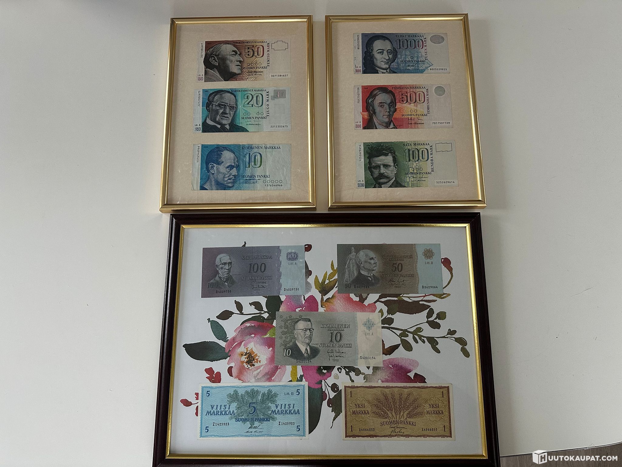 Viimeiset markka-ajan setelit 10-1000 markkaa.